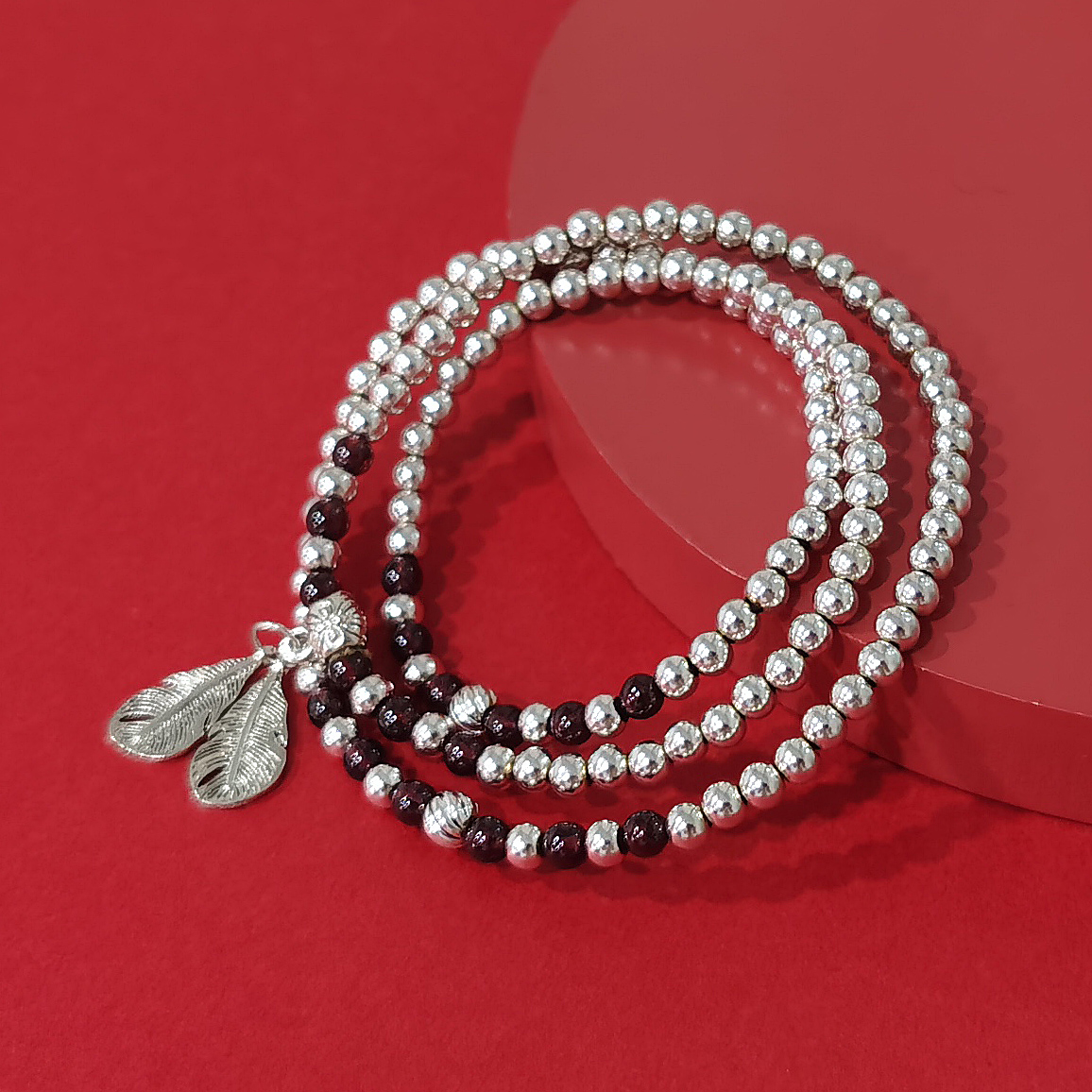 【寓意】:手串三圈式设计,抛光小银珠与石榴石碰撞,搭配羽毛元素,暗藏精致细节,寓意自由自在,吉祥相伴。