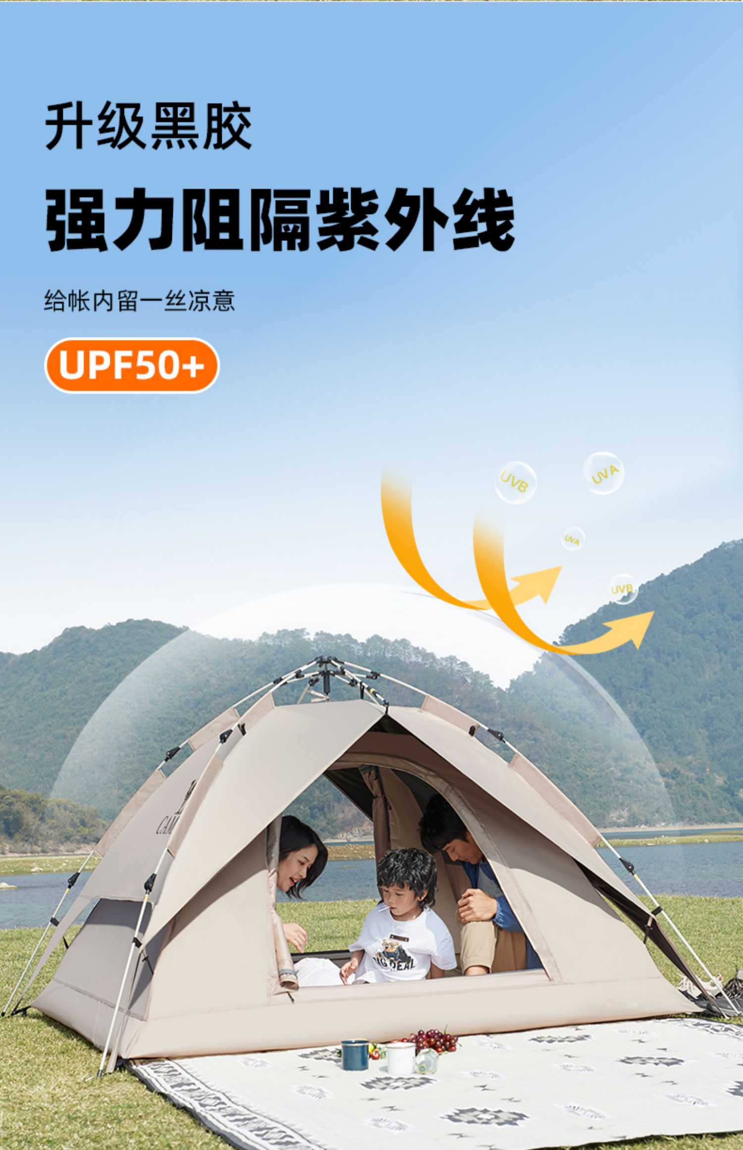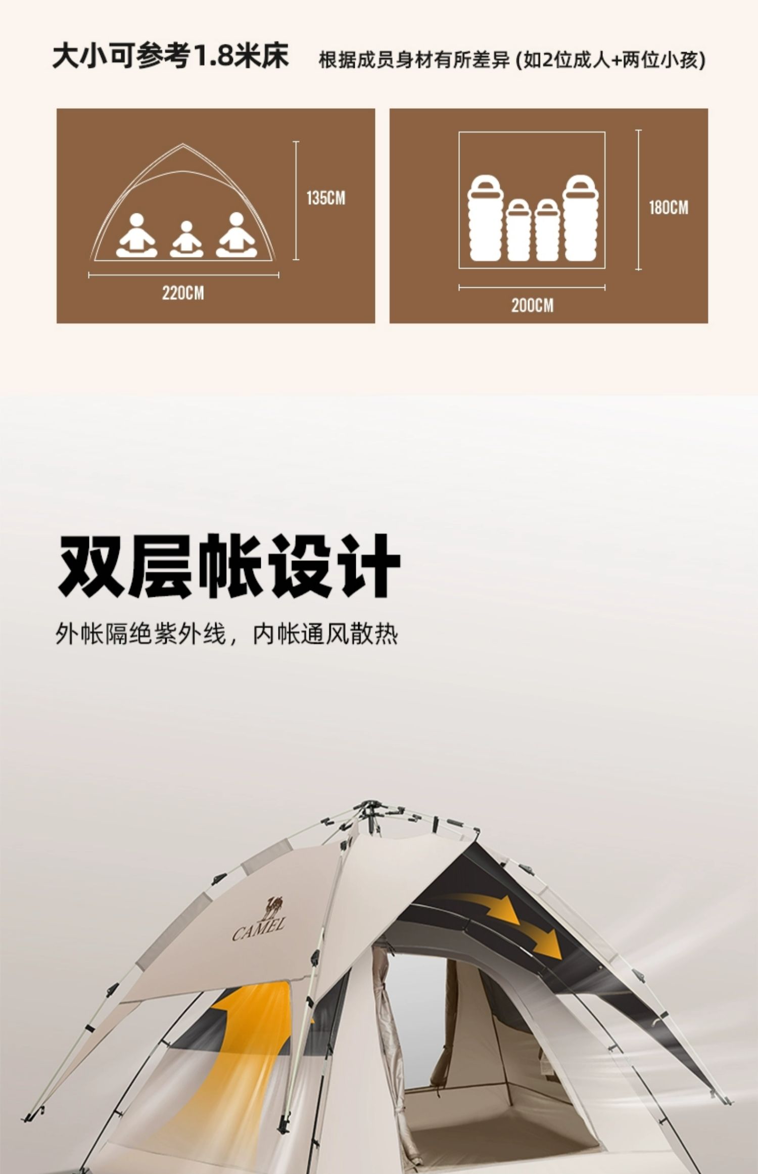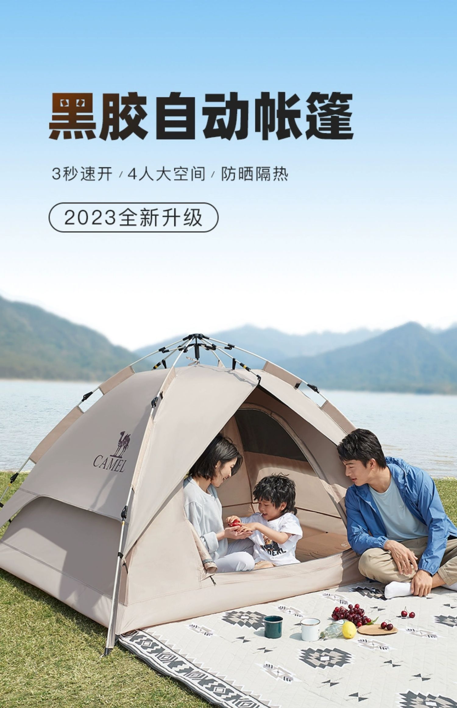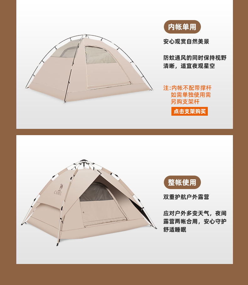 骆驼帐篷户外折叠便携式黑胶自动3-4人防雨加厚野外露营野营速开 A1S3NA111-3