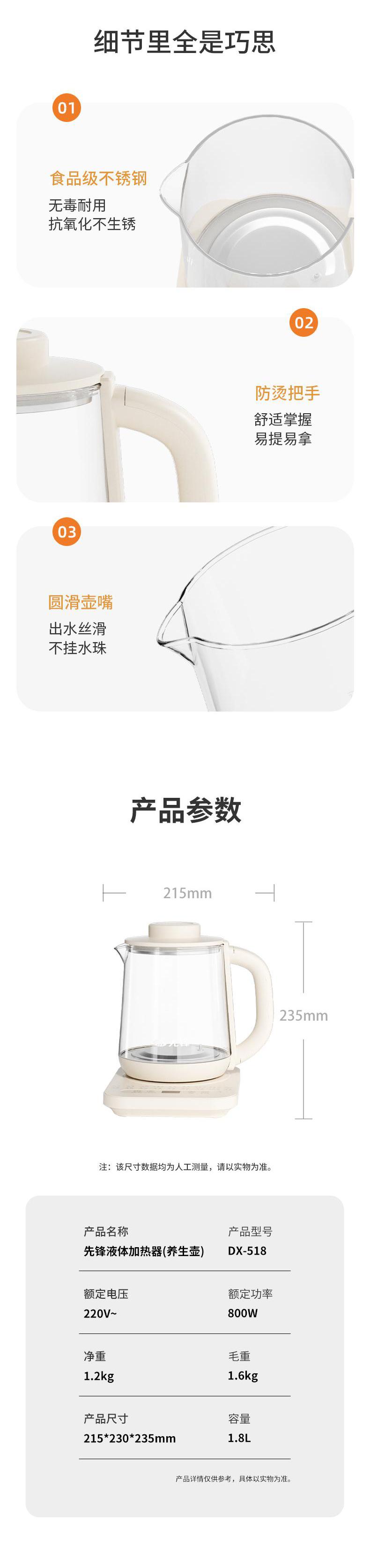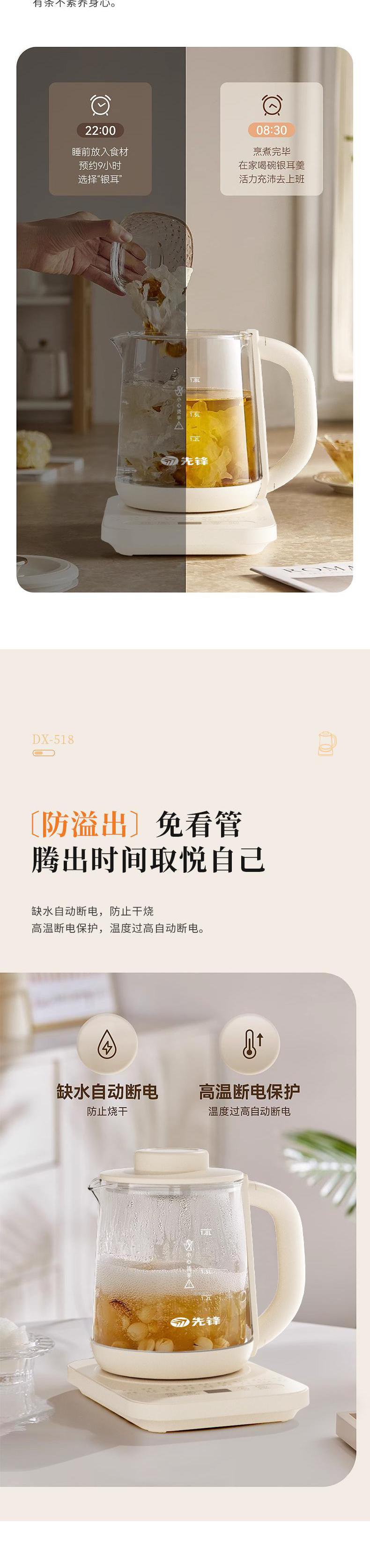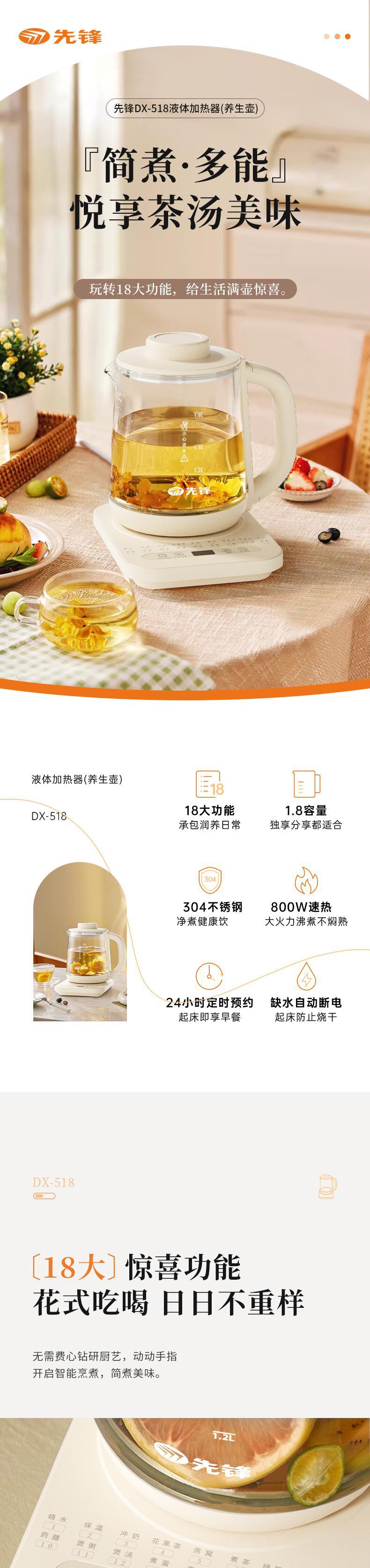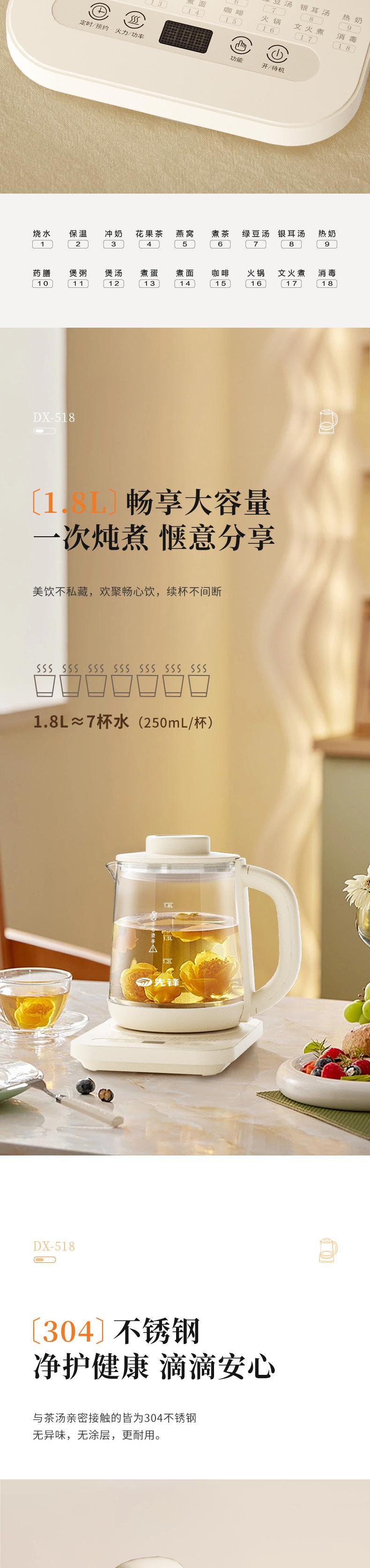 【自营】先锋DX-518液体加热器(养生壶)1.8L煮茶器多功能花茶壶燕窝炖盅智能定时