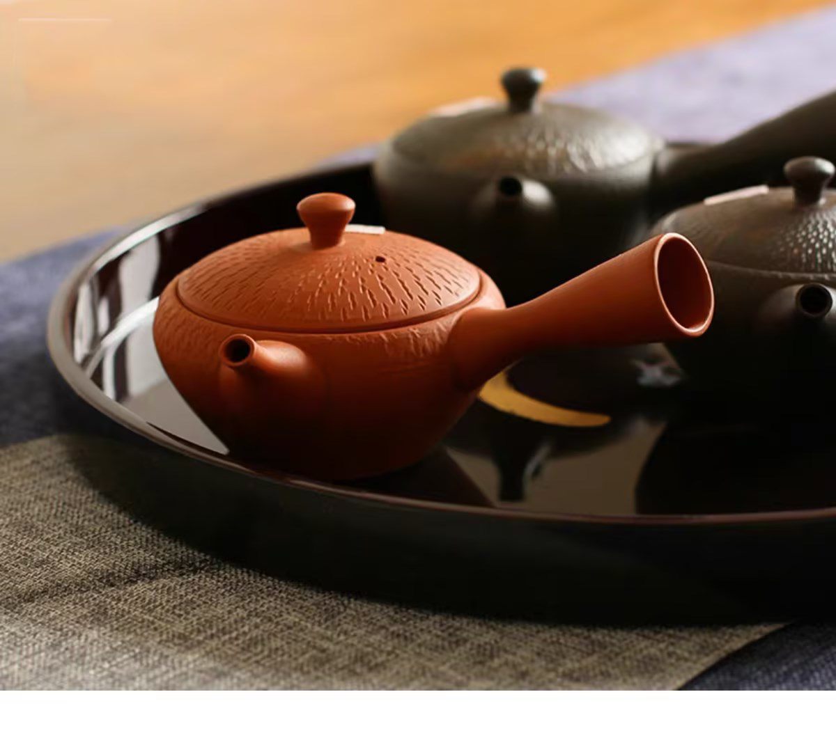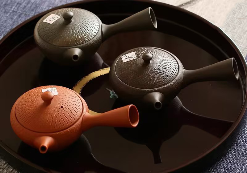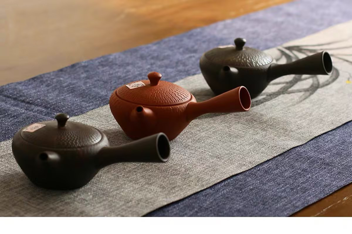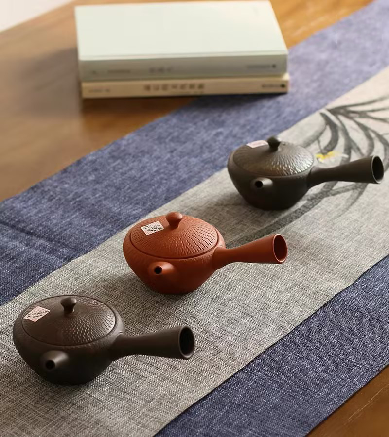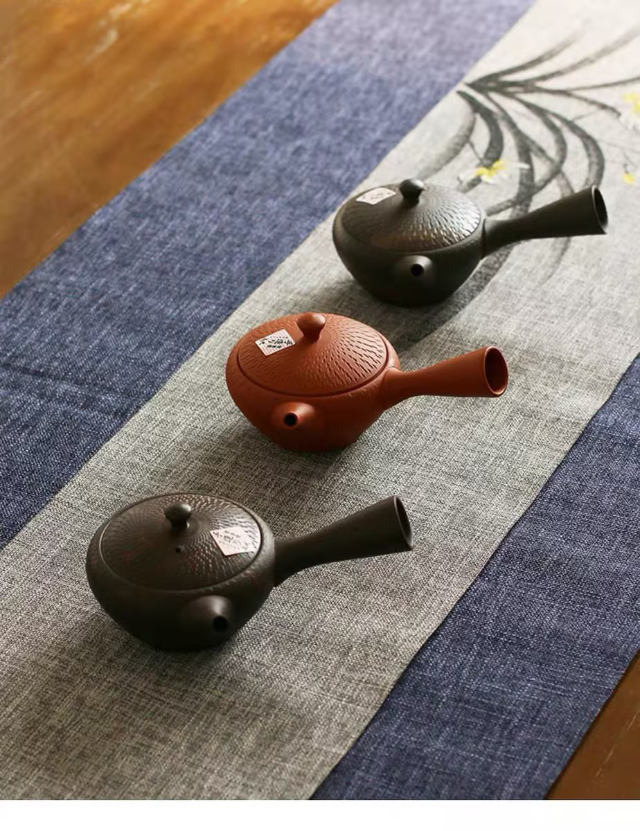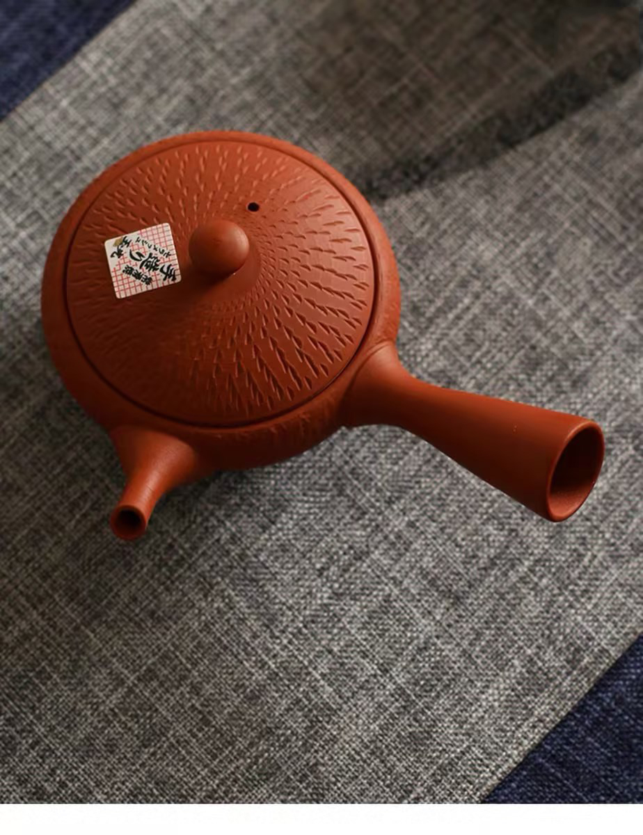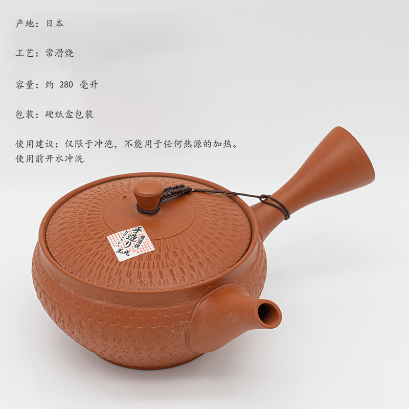 日本进口 常滑烧玉光作刻纹侧把茶壶