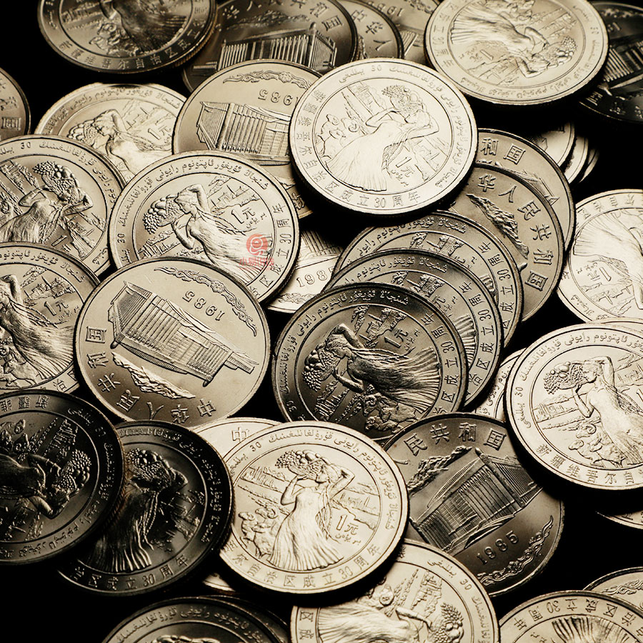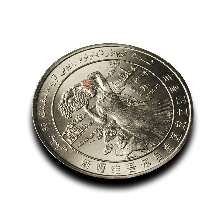 1985年,中国人民银行发行了一枚新疆维吾尔自治区成立30周年纪念币,面值1元,发行量450万枚,为五大自治区纪念币之一。