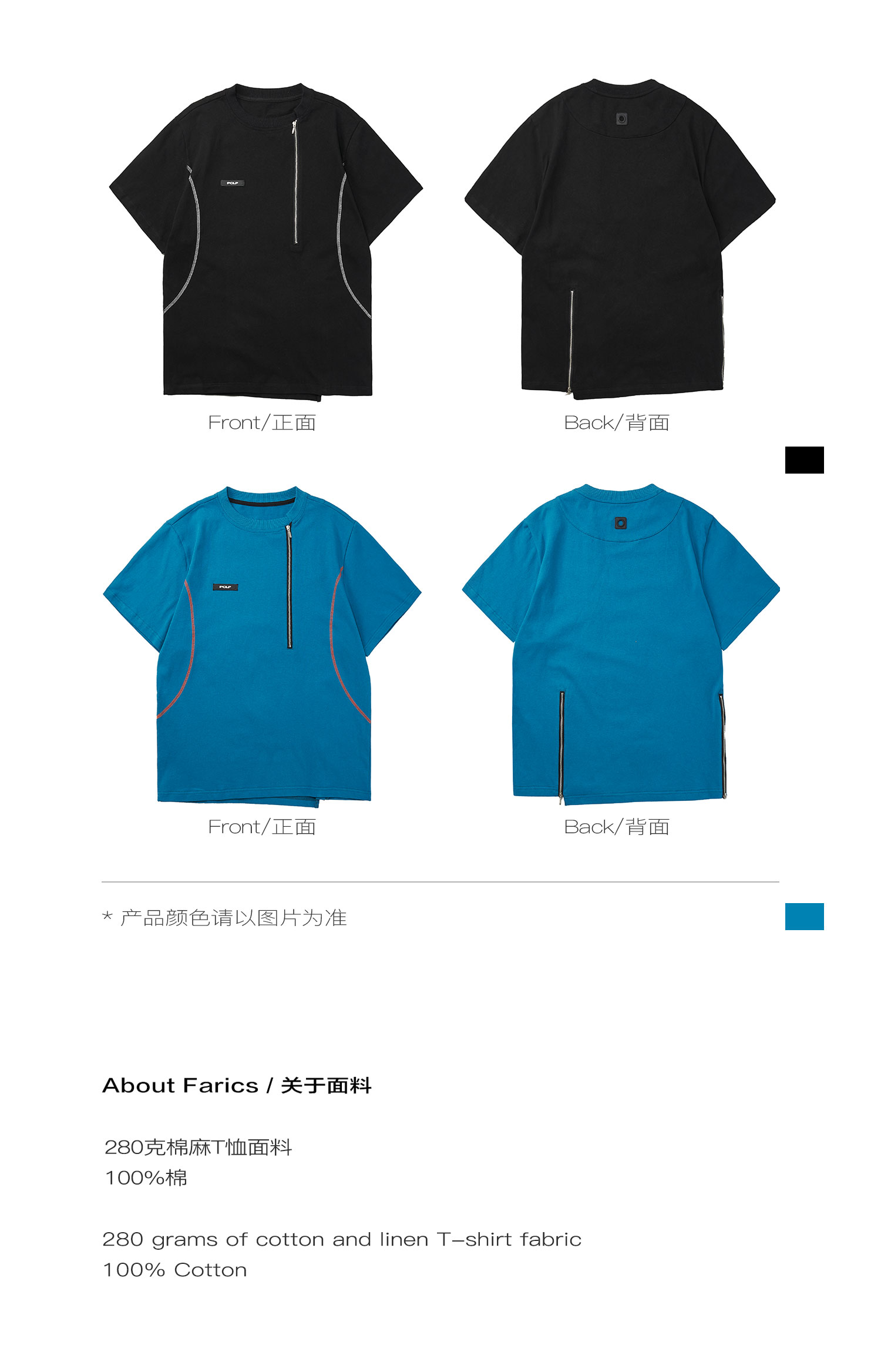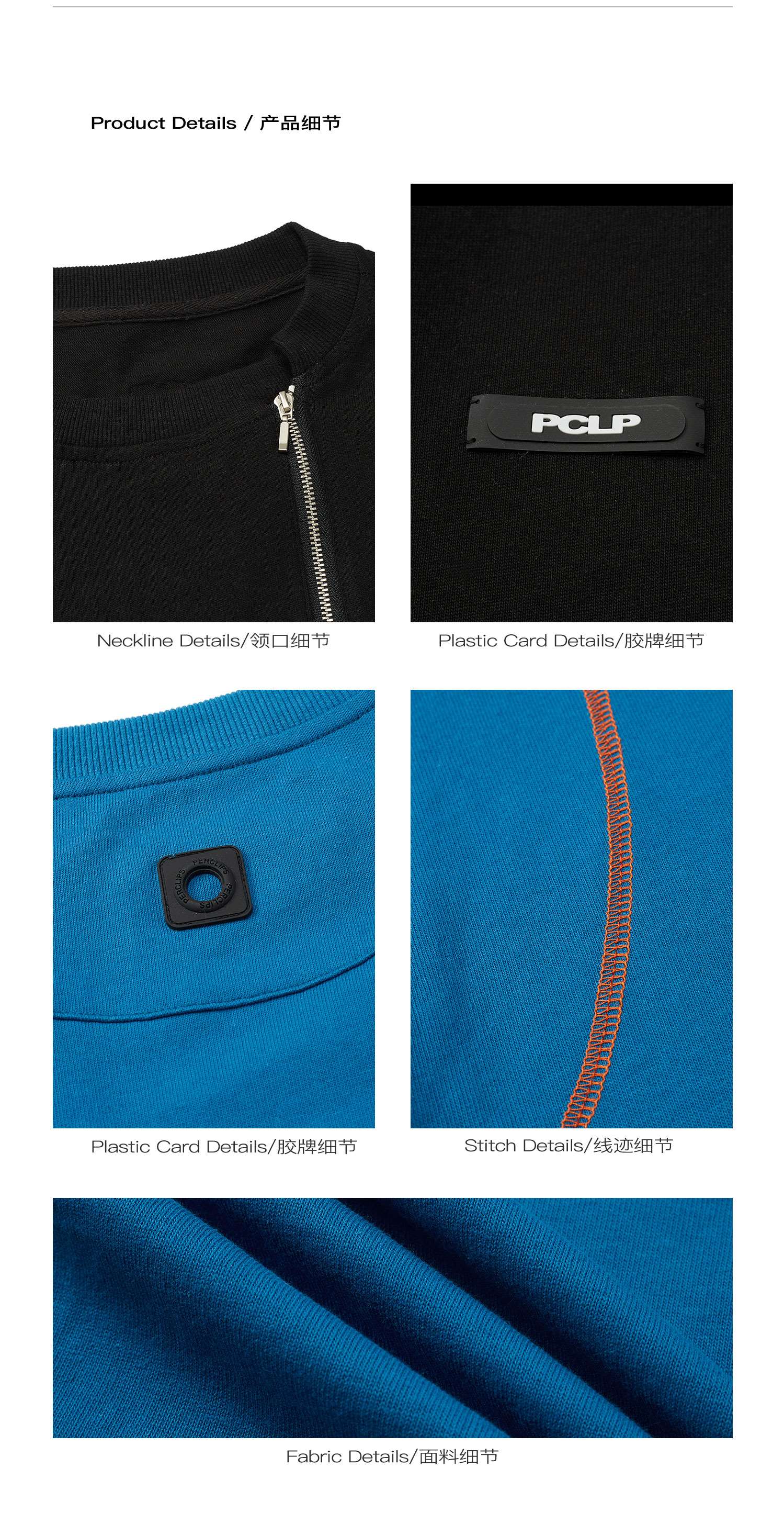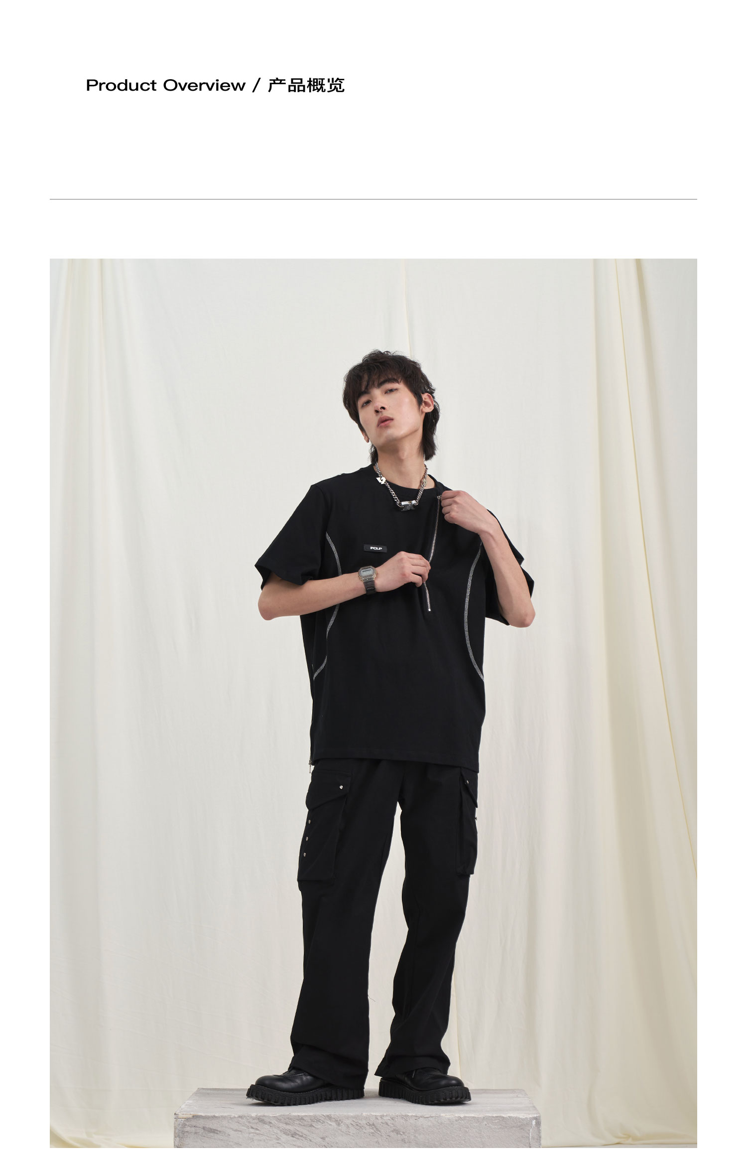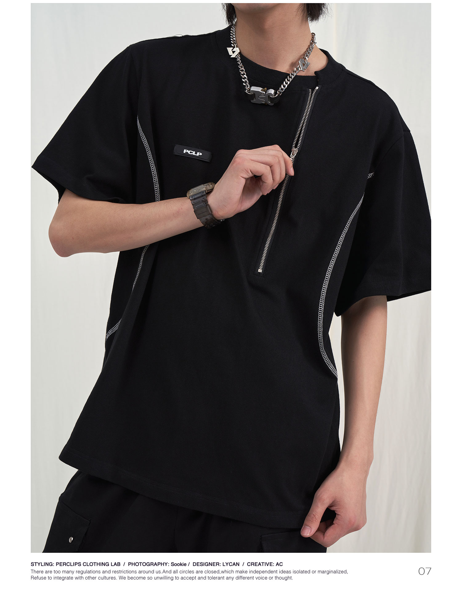 PCLP(PERCLIPS) 拉链坎线胶牌短袖夏季国潮牌潮流宽松圆领半袖t恤