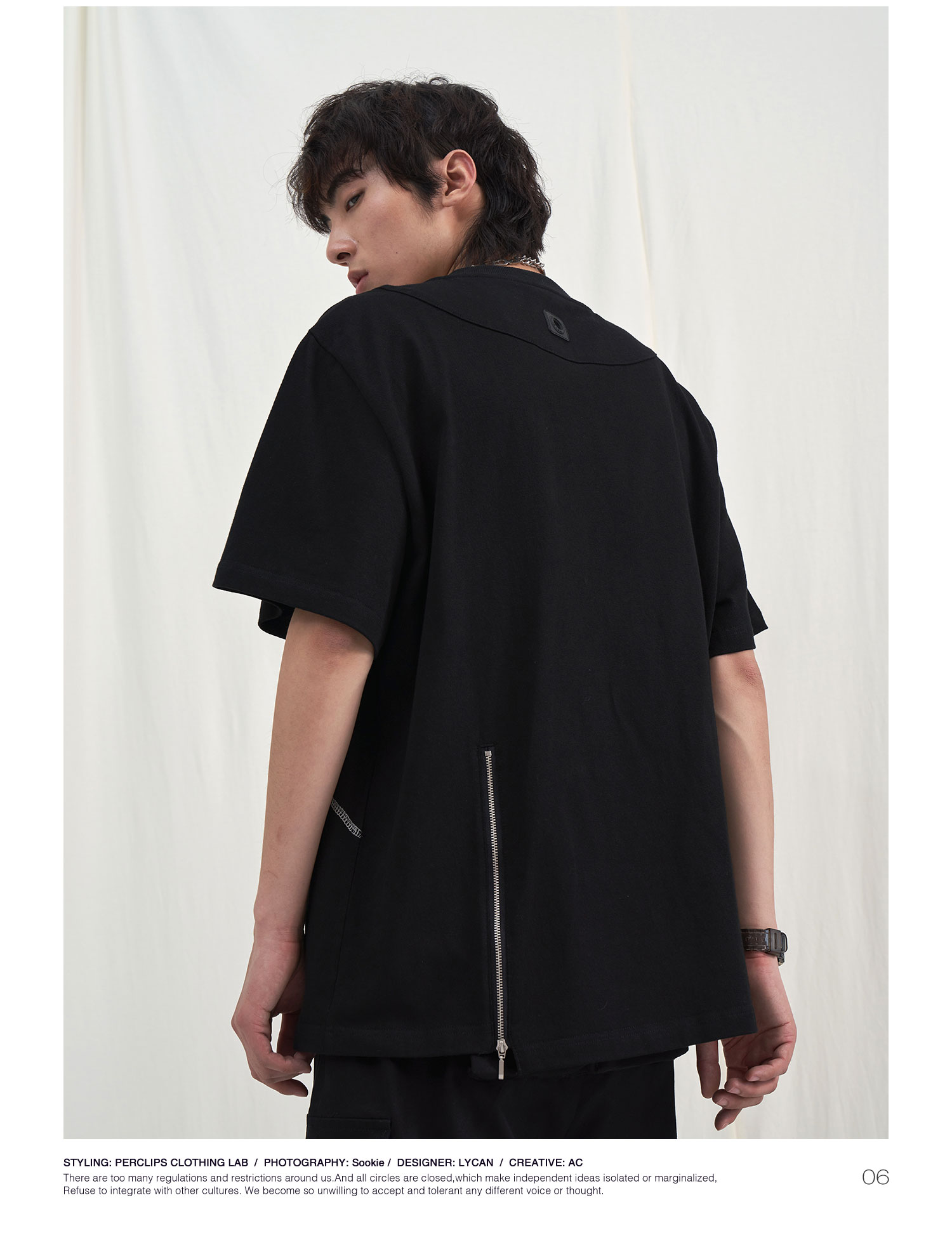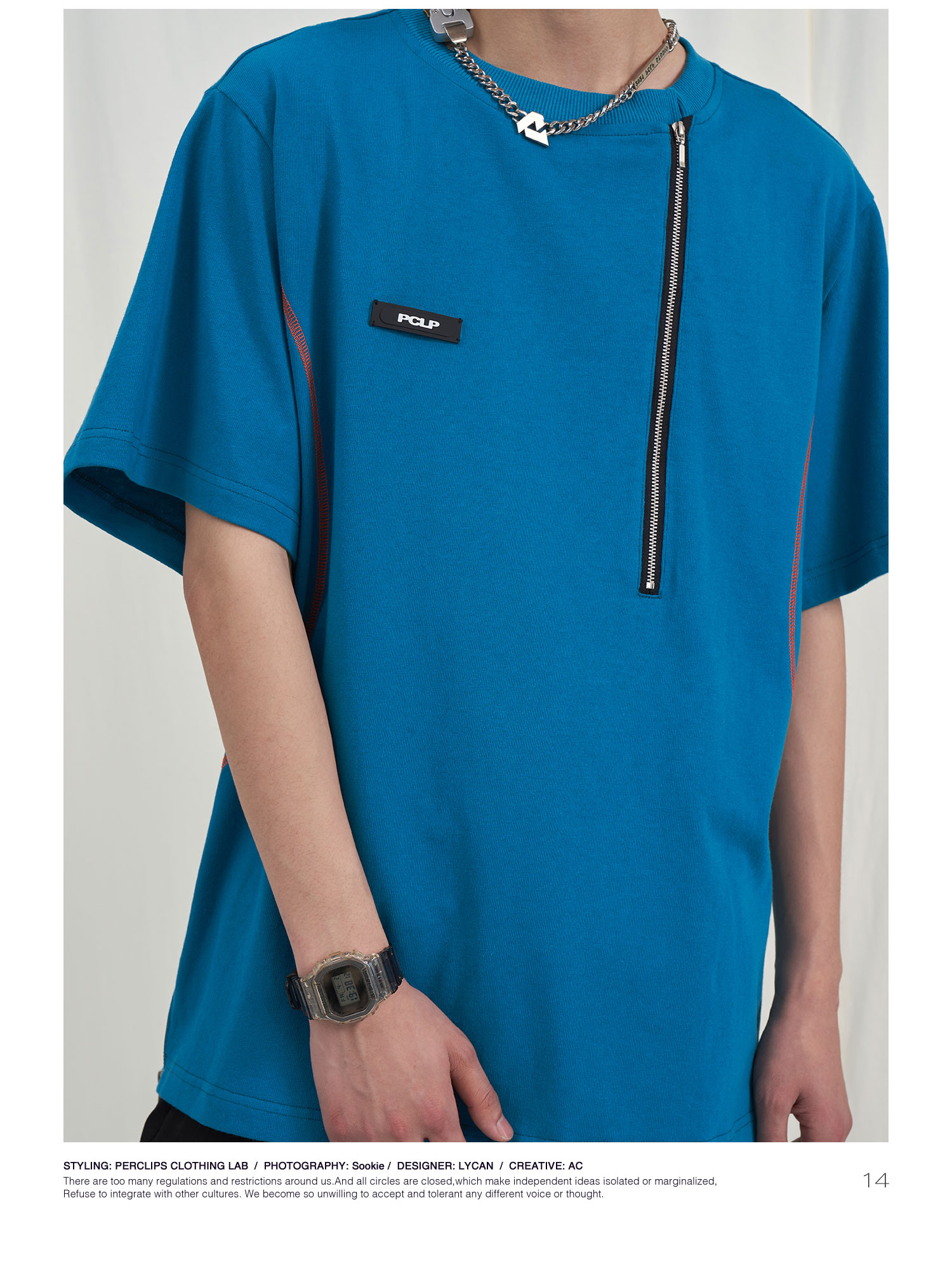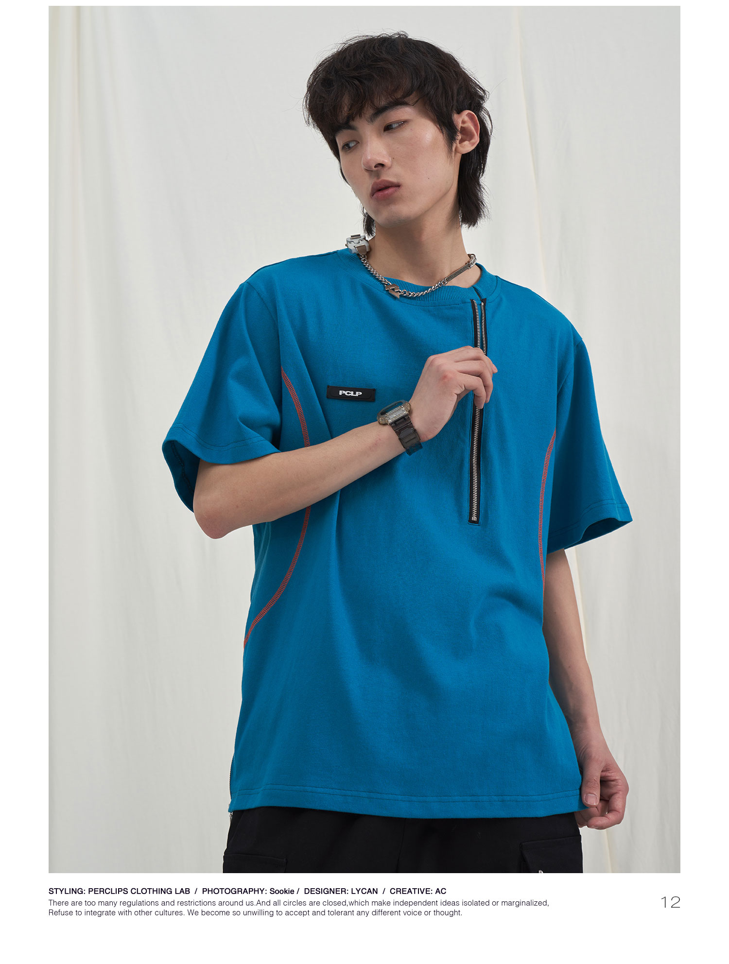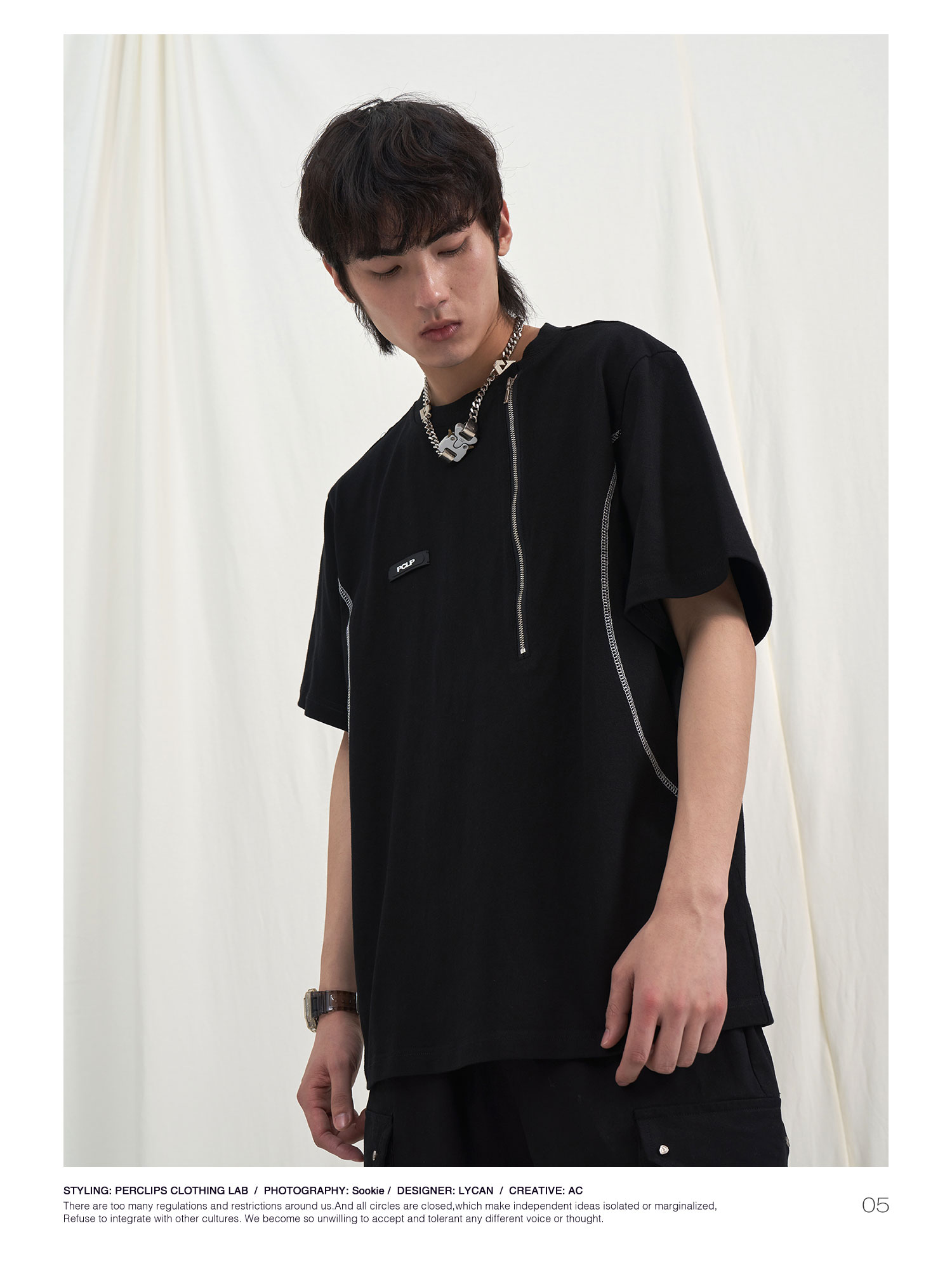 PCLP(PERCLIPS) 拉链坎线胶牌短袖夏季国潮牌潮流宽松圆领半袖t恤