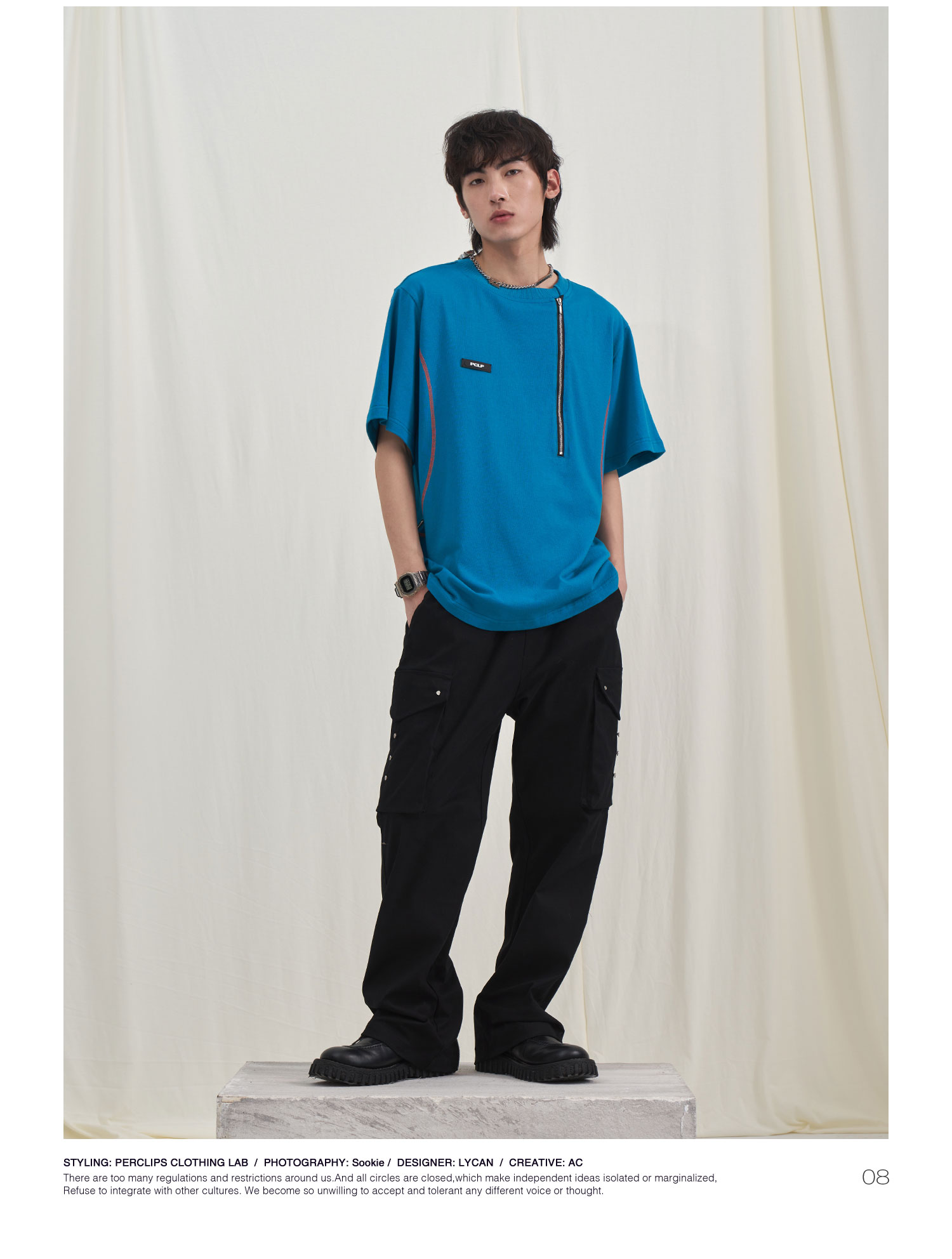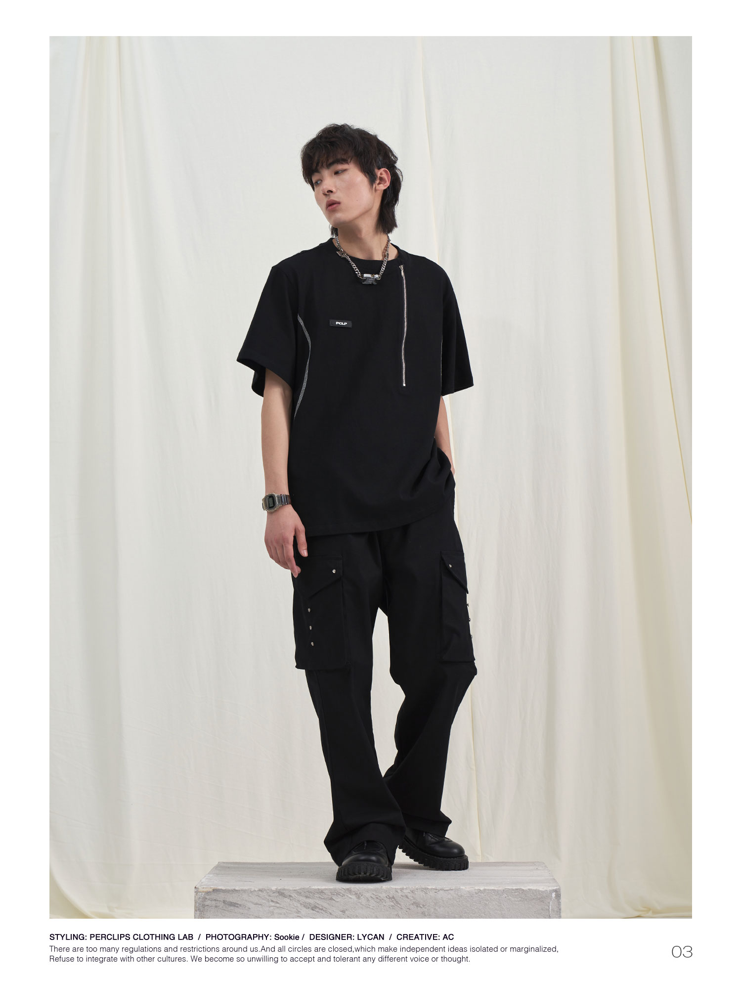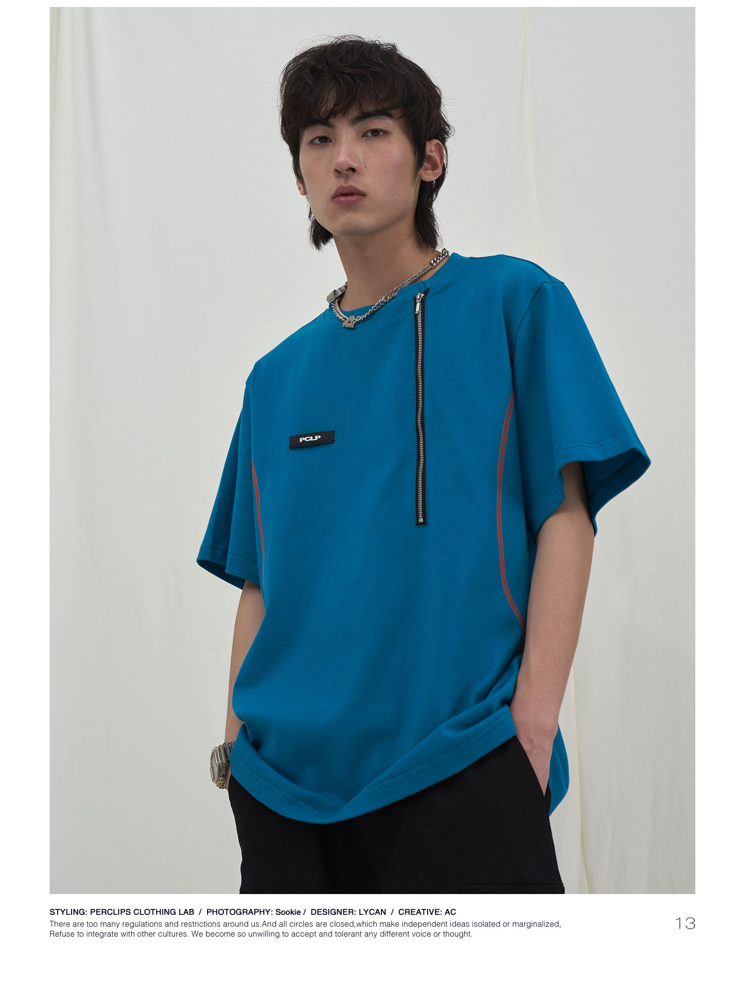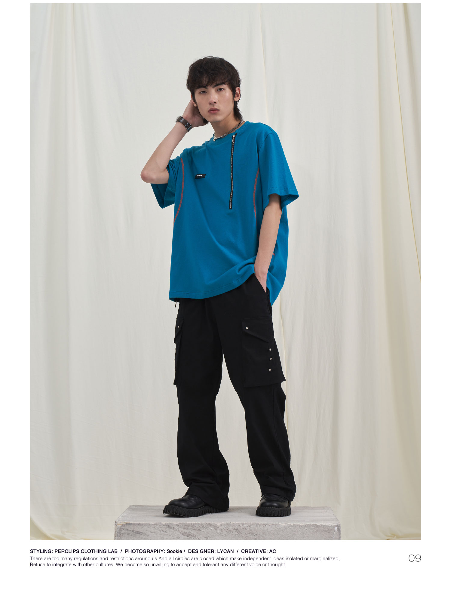 PCLP(PERCLIPS) 拉链坎线胶牌短袖夏季国潮牌潮流宽松圆领半袖t恤