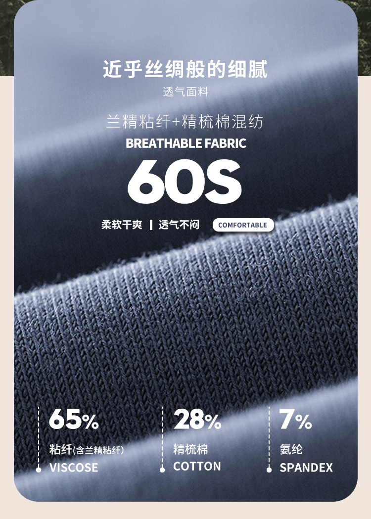 【材质】65%粘纤(含兰精粘纤)28%精梳棉7%氨纶;裆里:84%粘纤 9%桑蚕丝 4.5%氨纶2.5%锦纶