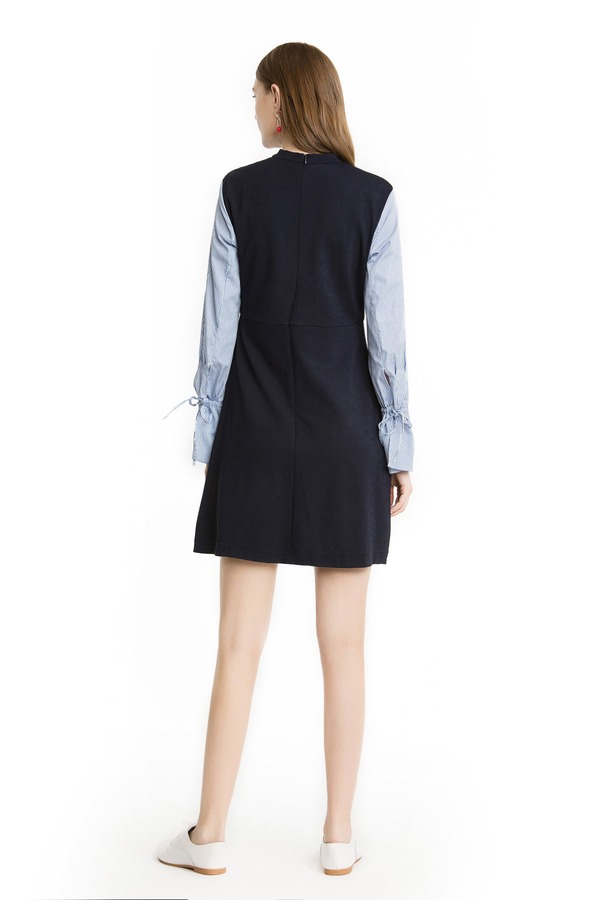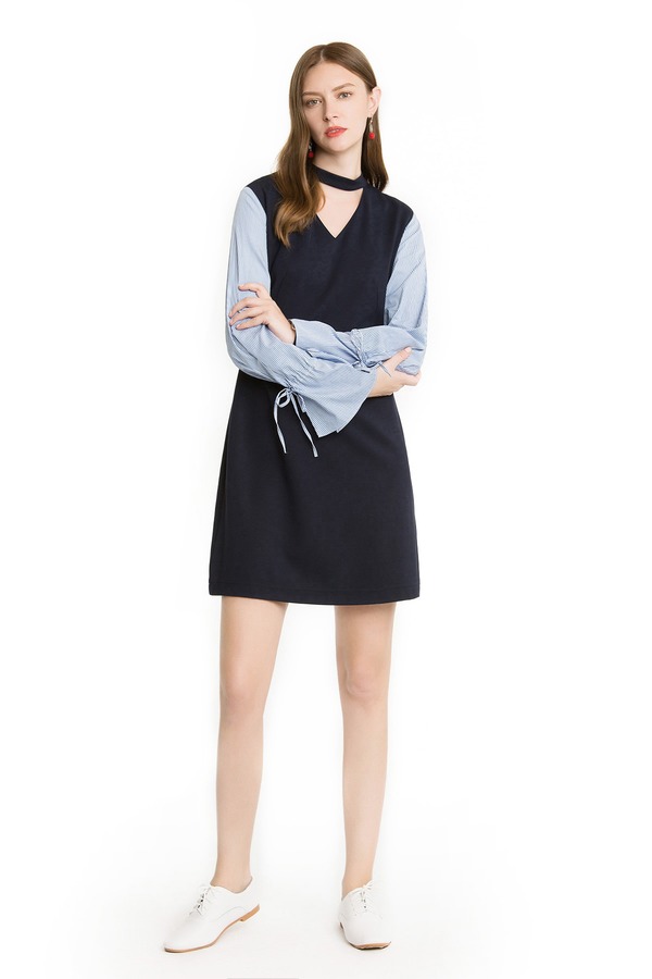 Eifini伊芙丽 深蓝色拼接袖choker连衣裙 1503