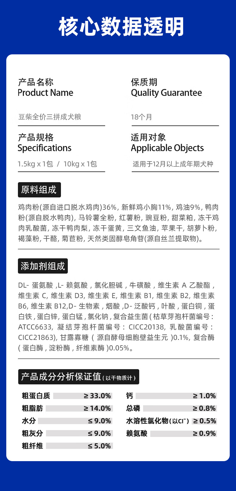 豆柴(docile)冻干三拼成犬狗粮添加有益菌蛋黄鸡肉鸭肉粒泰迪比熊柯基金毛小中大型全价通用无谷粮1.5kg