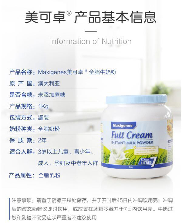【澳洲仓】Maxigenes 美可卓 全脂高钙奶粉1kg 1罐装(000136)