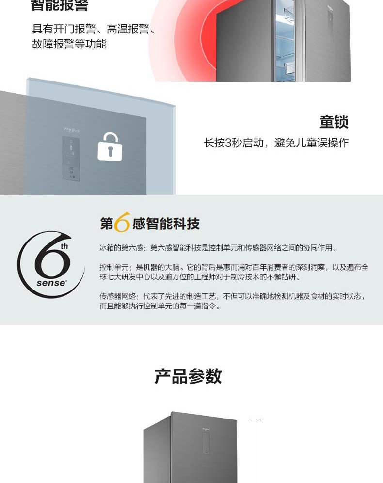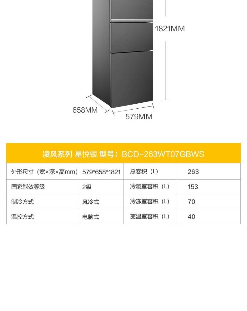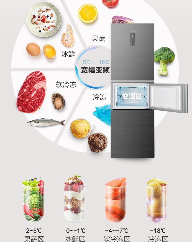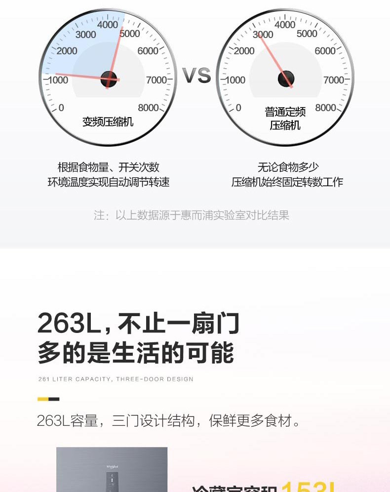 惠而浦(Whirlpool) BCD-263WT07GBWS星悦银 凌风系列三门变频冰箱