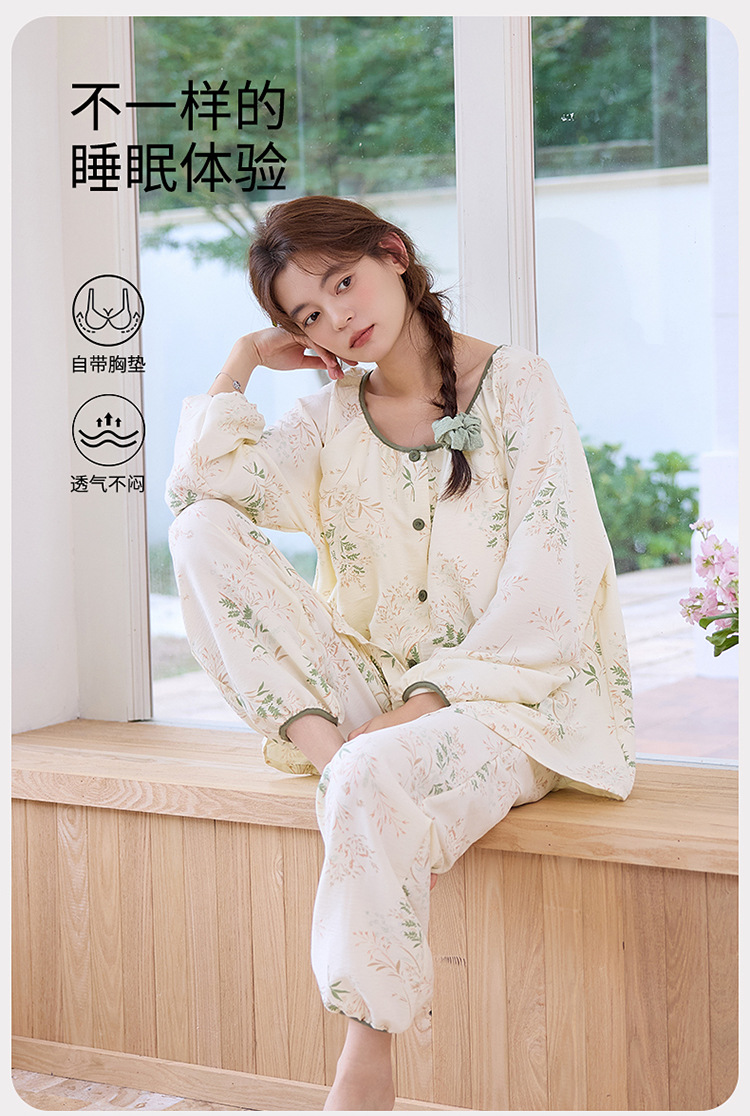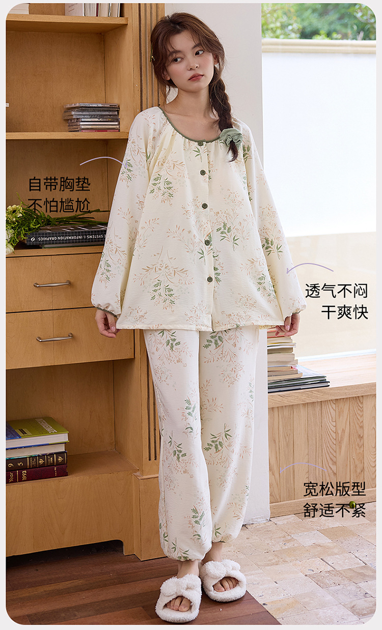 睡衣女春秋季云朵棉长袖长裤带胸垫可外穿秋冬国风大码家居服套装 商品图0