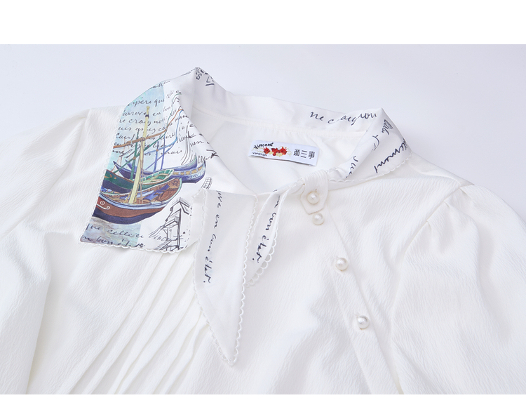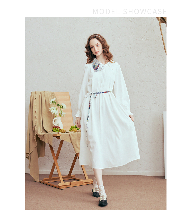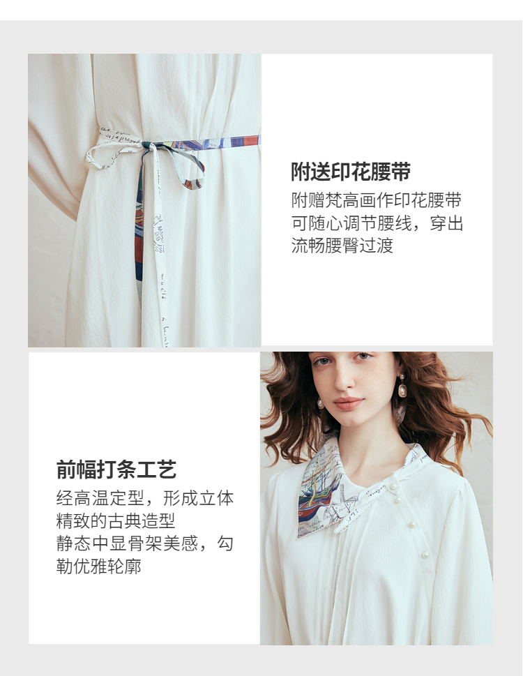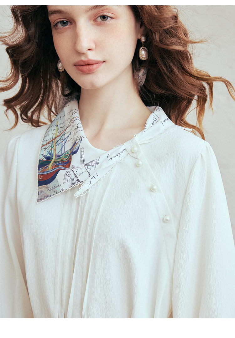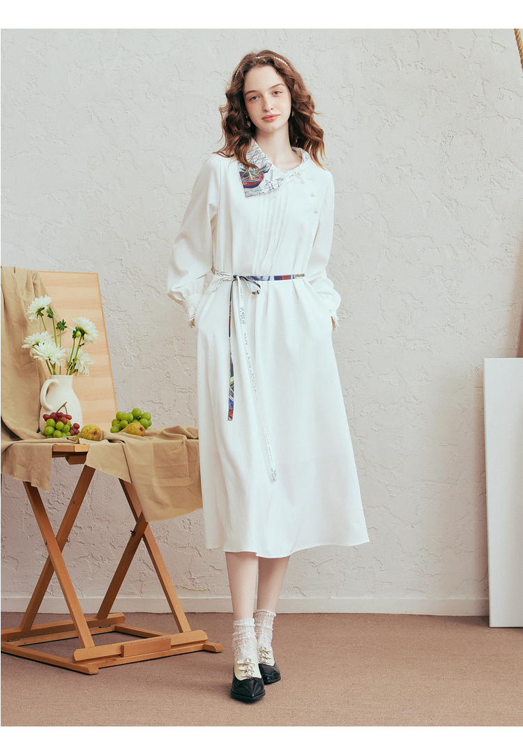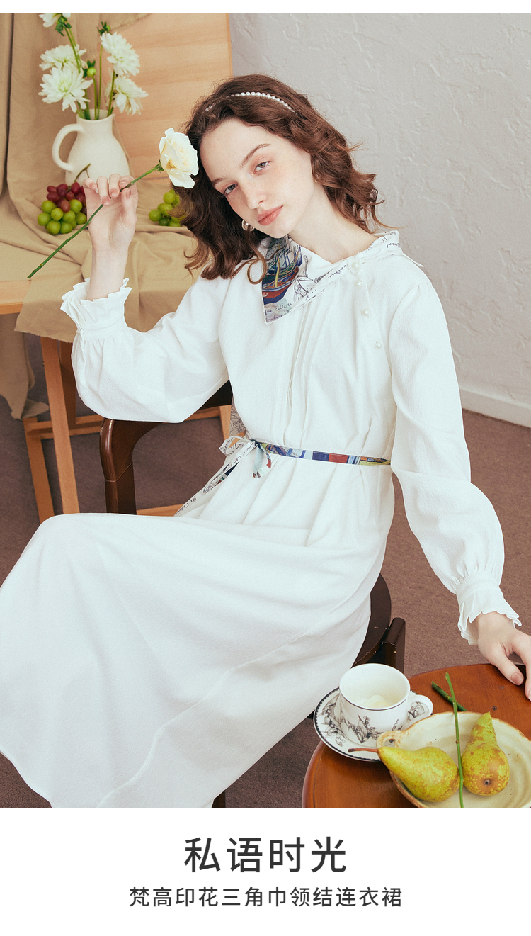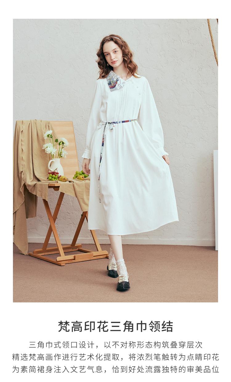 两三事梵高文艺私语时光2026春季新款印花三角巾领斜边纽扣连衣裙