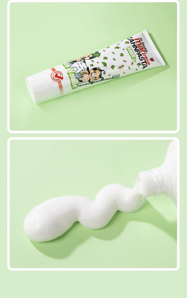 不含SLS起泡剂、塑化剂,软性水合硅石磨料,清洁力在线还不伤牙釉质,吞一点也不怕(当然还是要引导吐掉啦)!