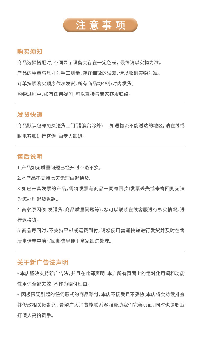 4、留错地址、电话等信息导致货物不能正常送达均不在售后范围内。