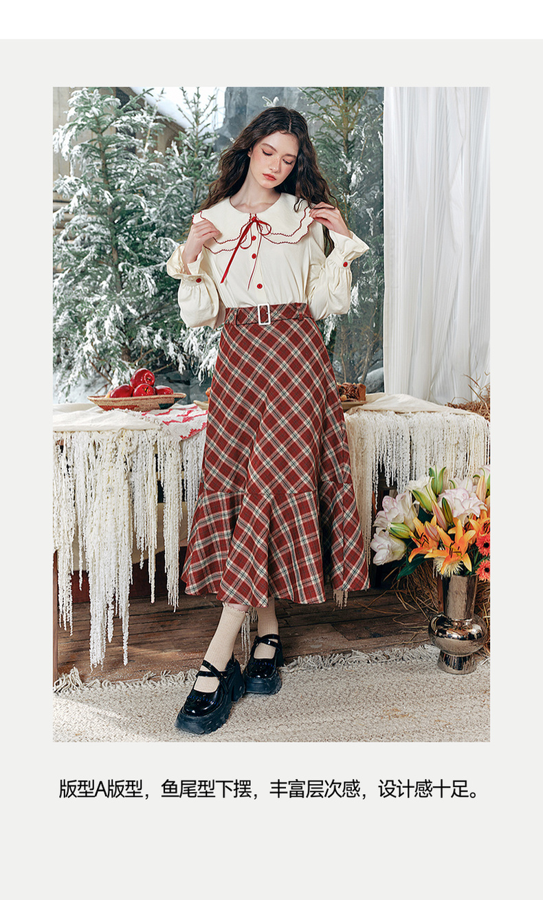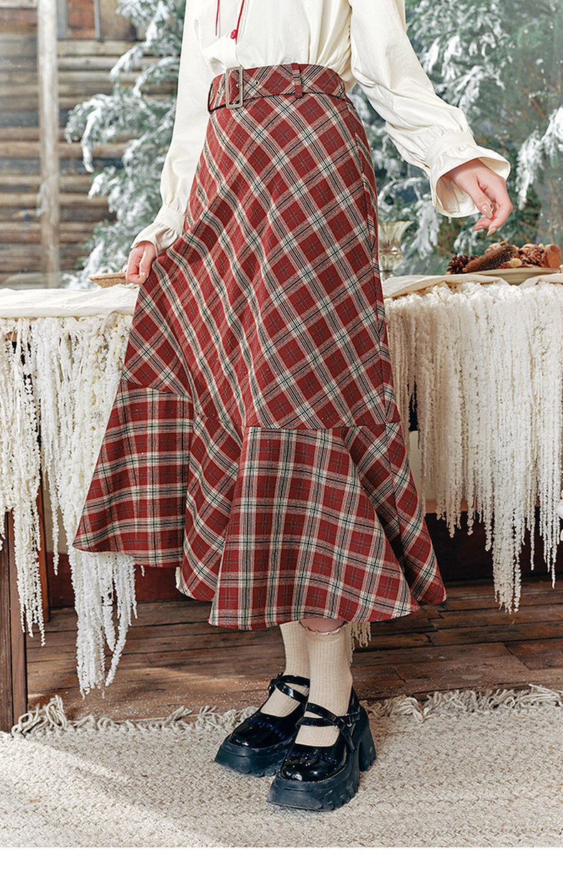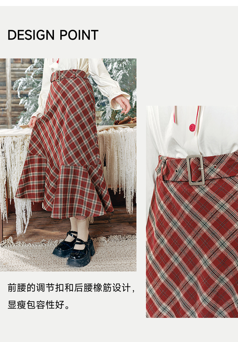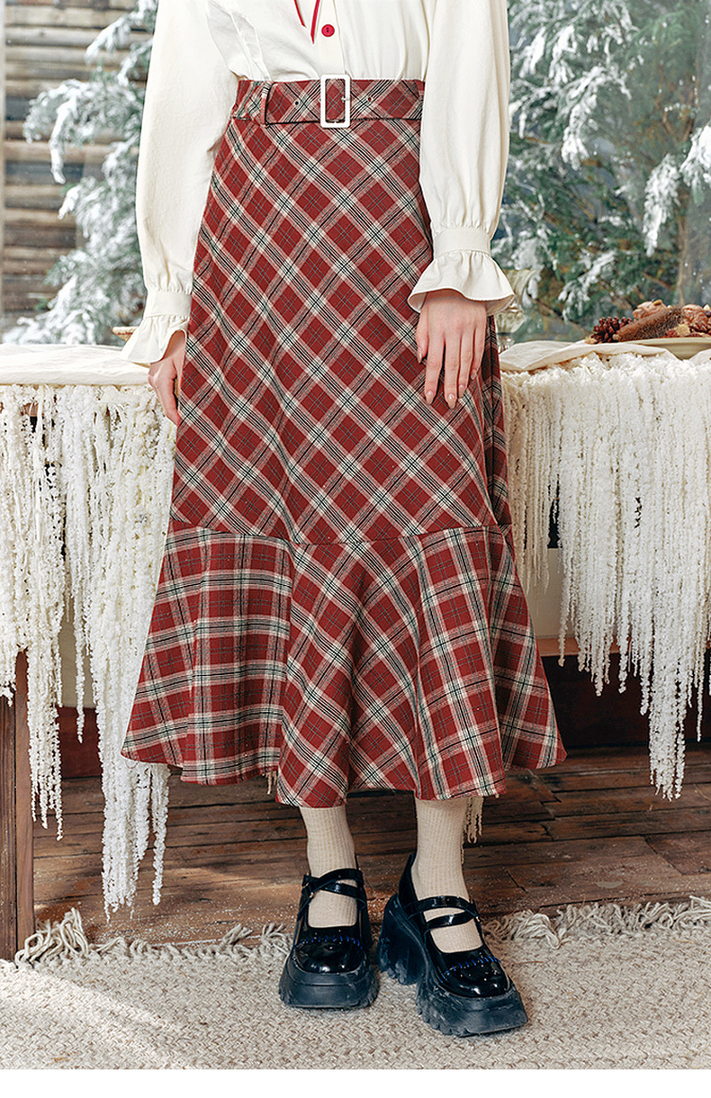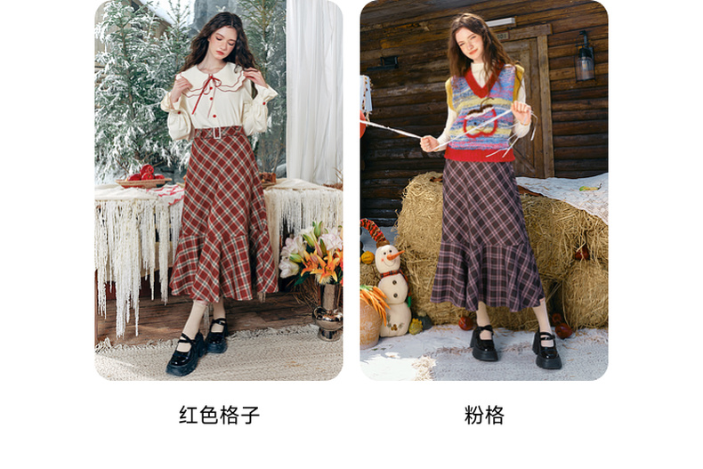 两三事 冬野霜糖 2024冬季新款复古系带荷叶边裙摆格子半身裙