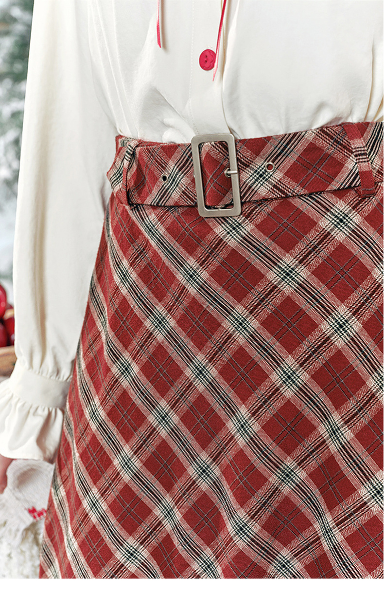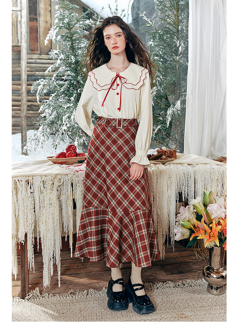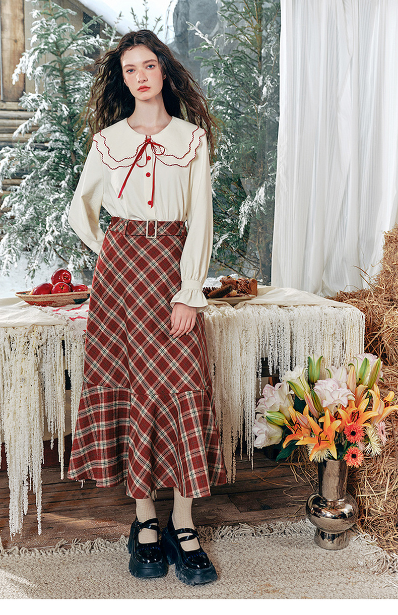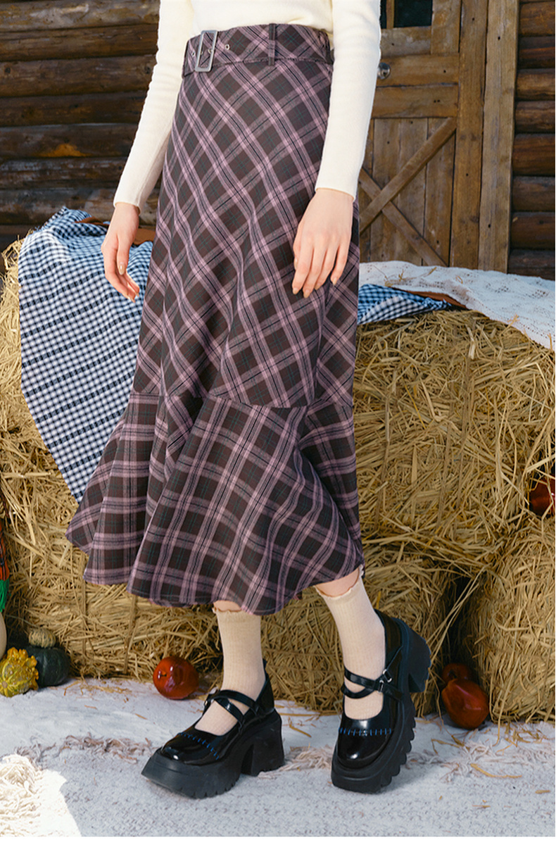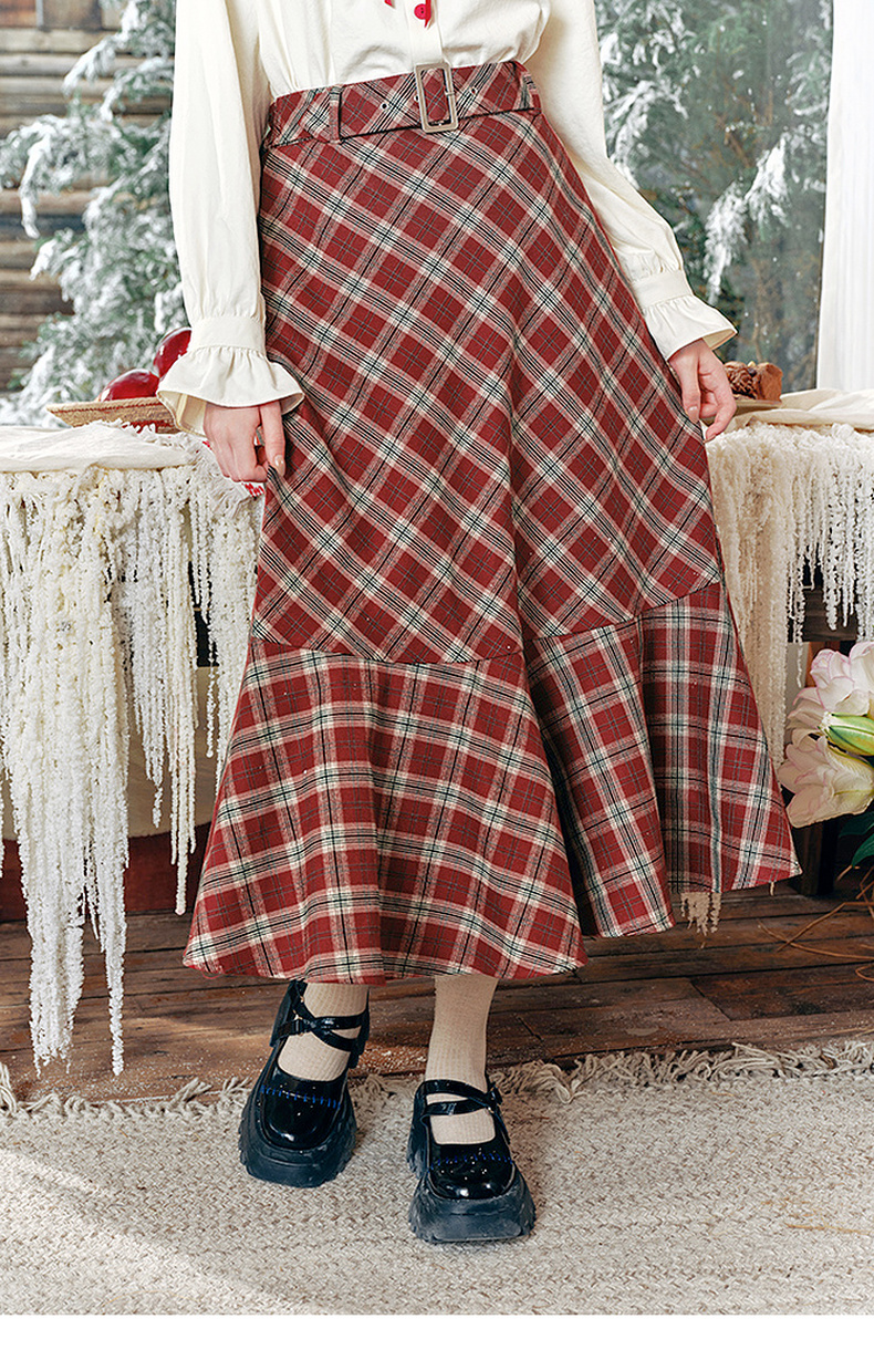两三事 冬野霜糖 2024冬季新款复古系带荷叶边裙摆格子半身裙
