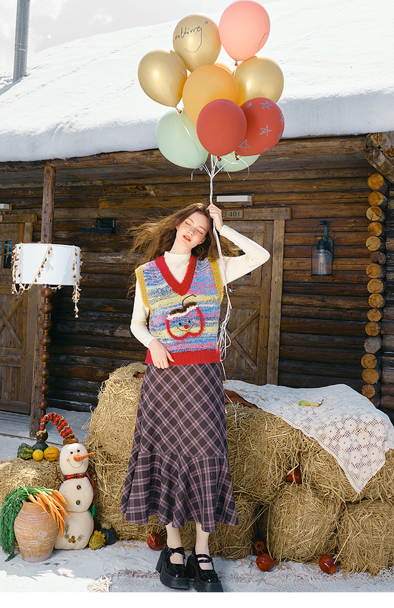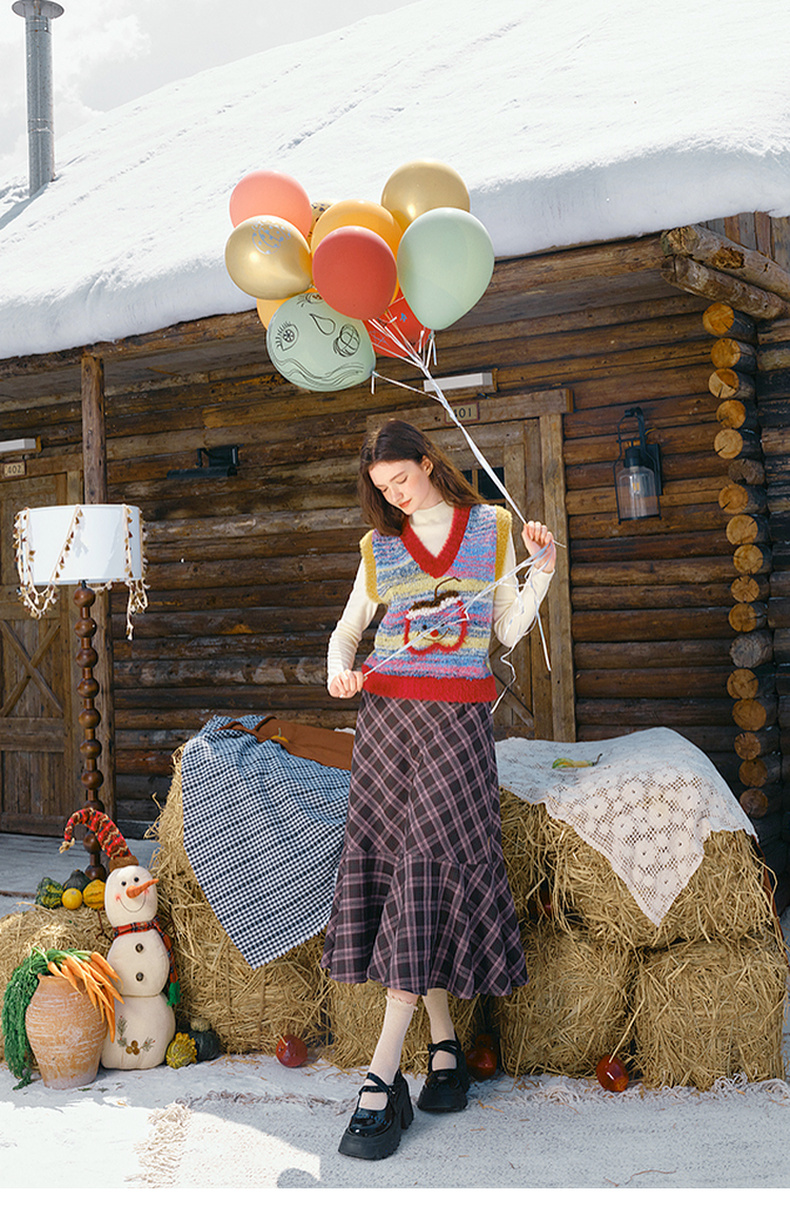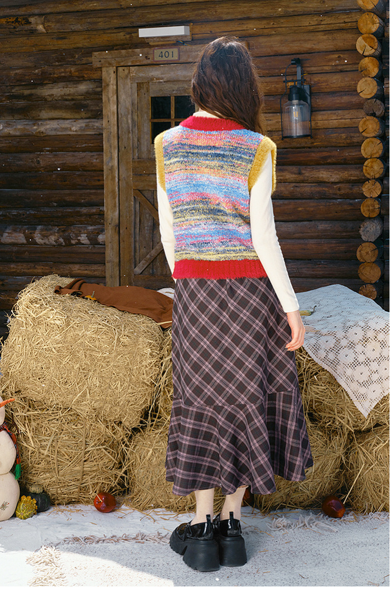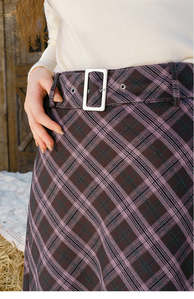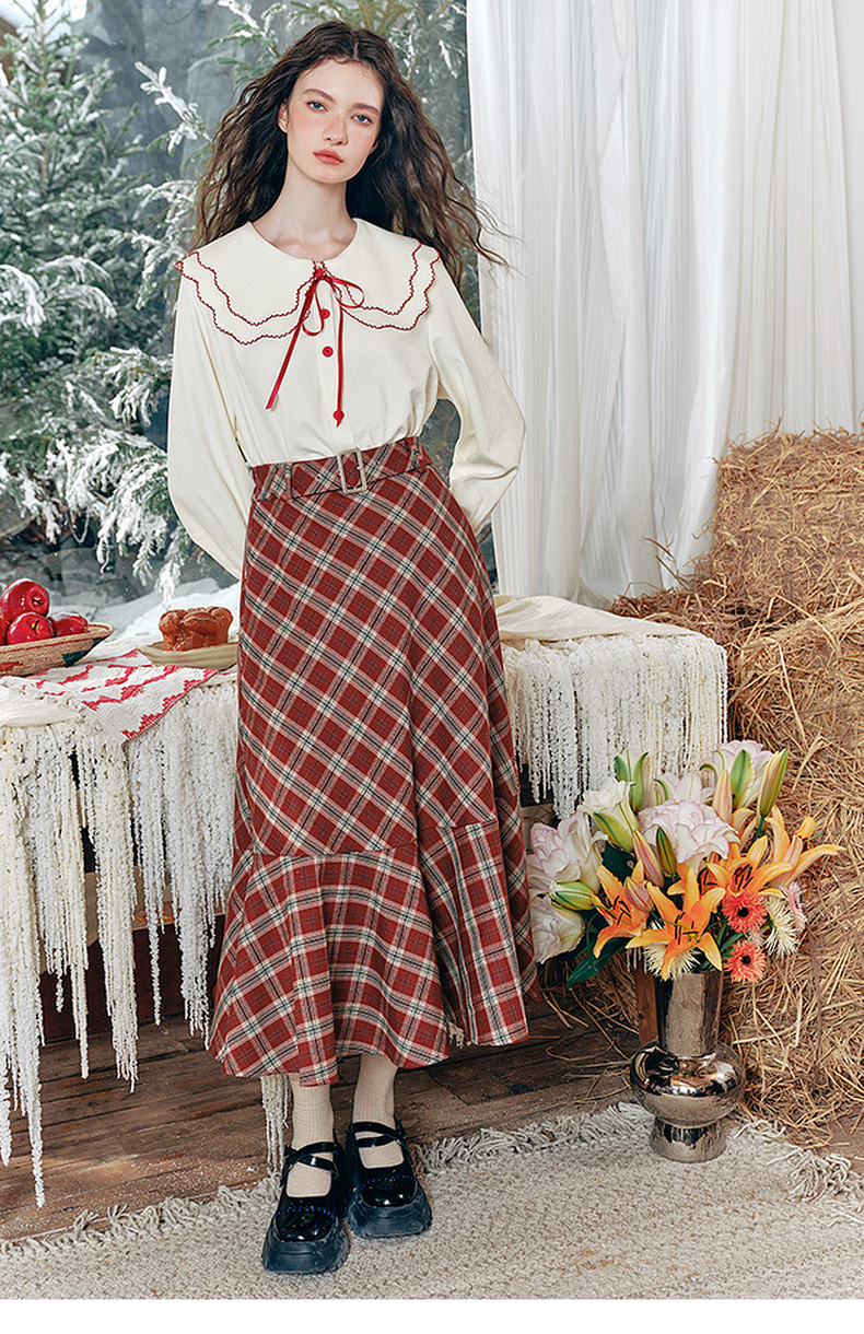 两三事 冬野霜糖 2024冬季新款复古系带荷叶边裙摆格子半身裙