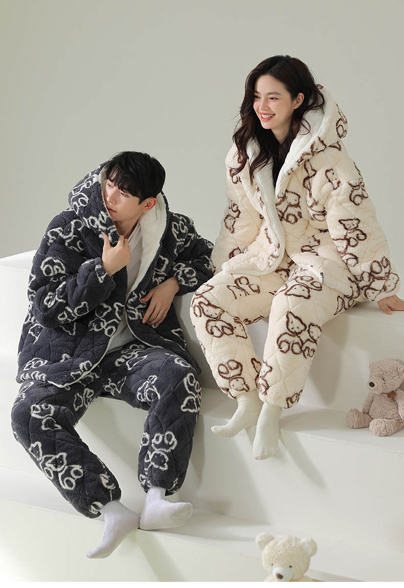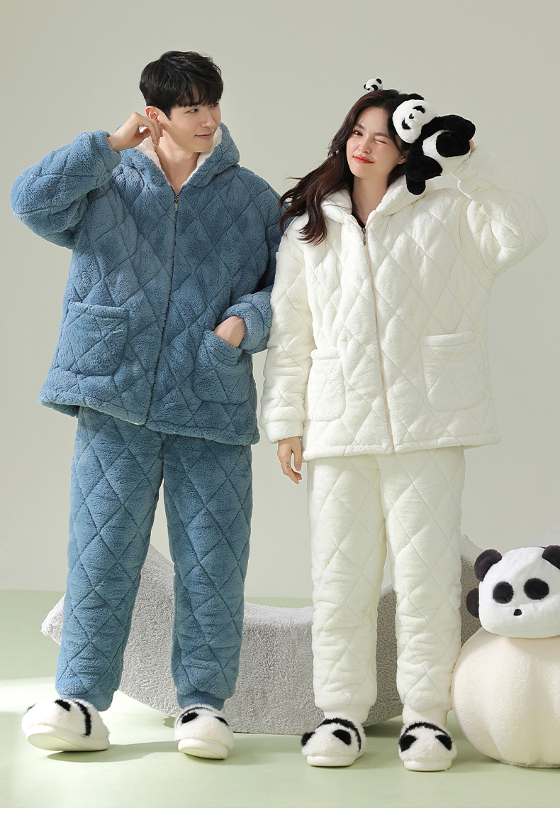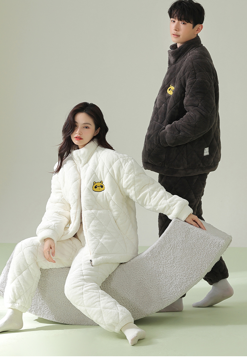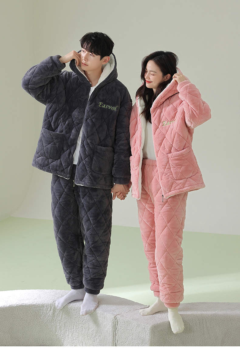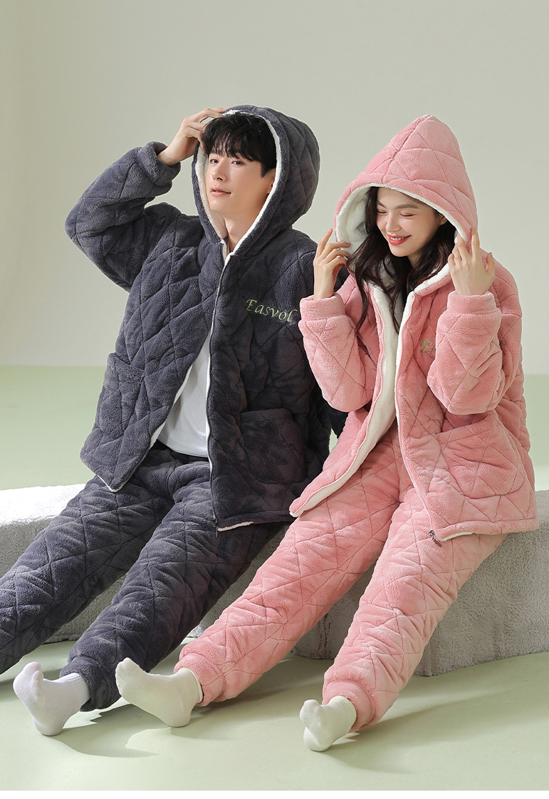 【夹棉暖衣】自然醒「怦然心动」贵妃绒三层加厚夹棉情侣睡衣冬季保暖珊瑚绒家居服女大码男士套装JLM