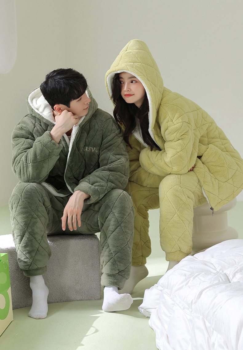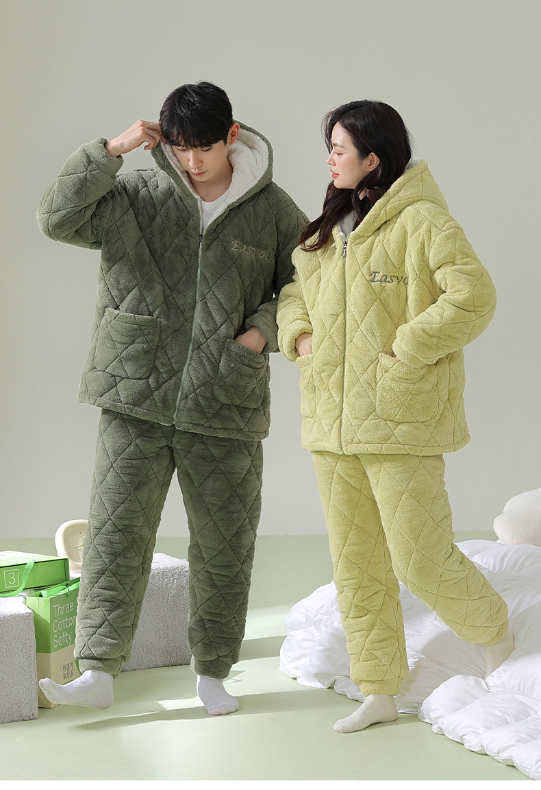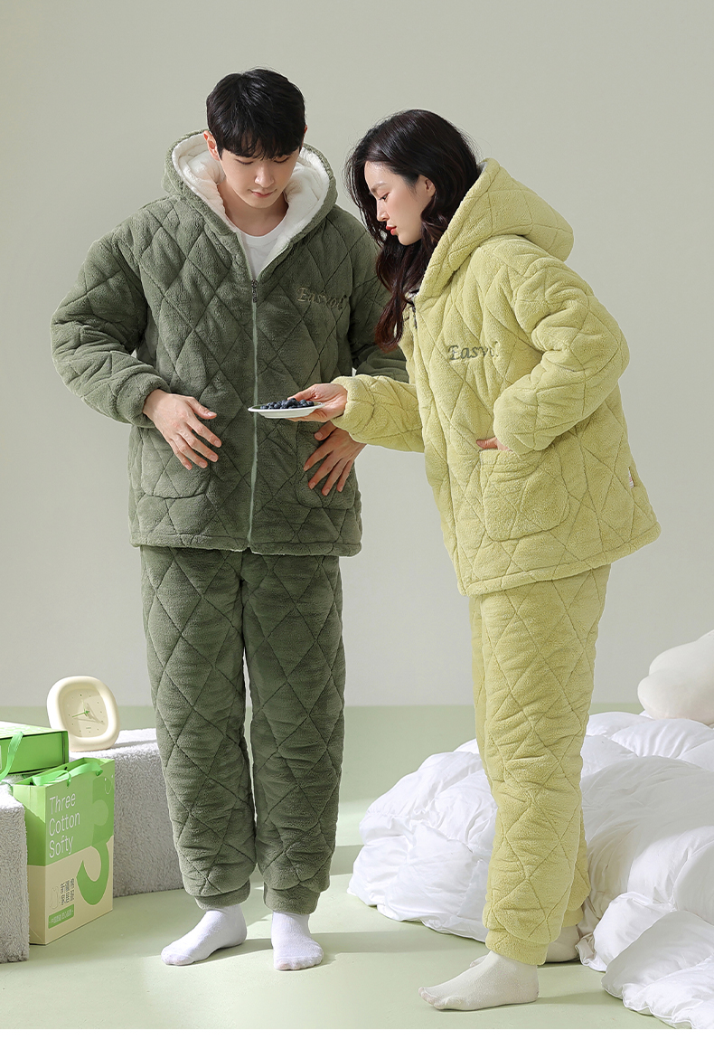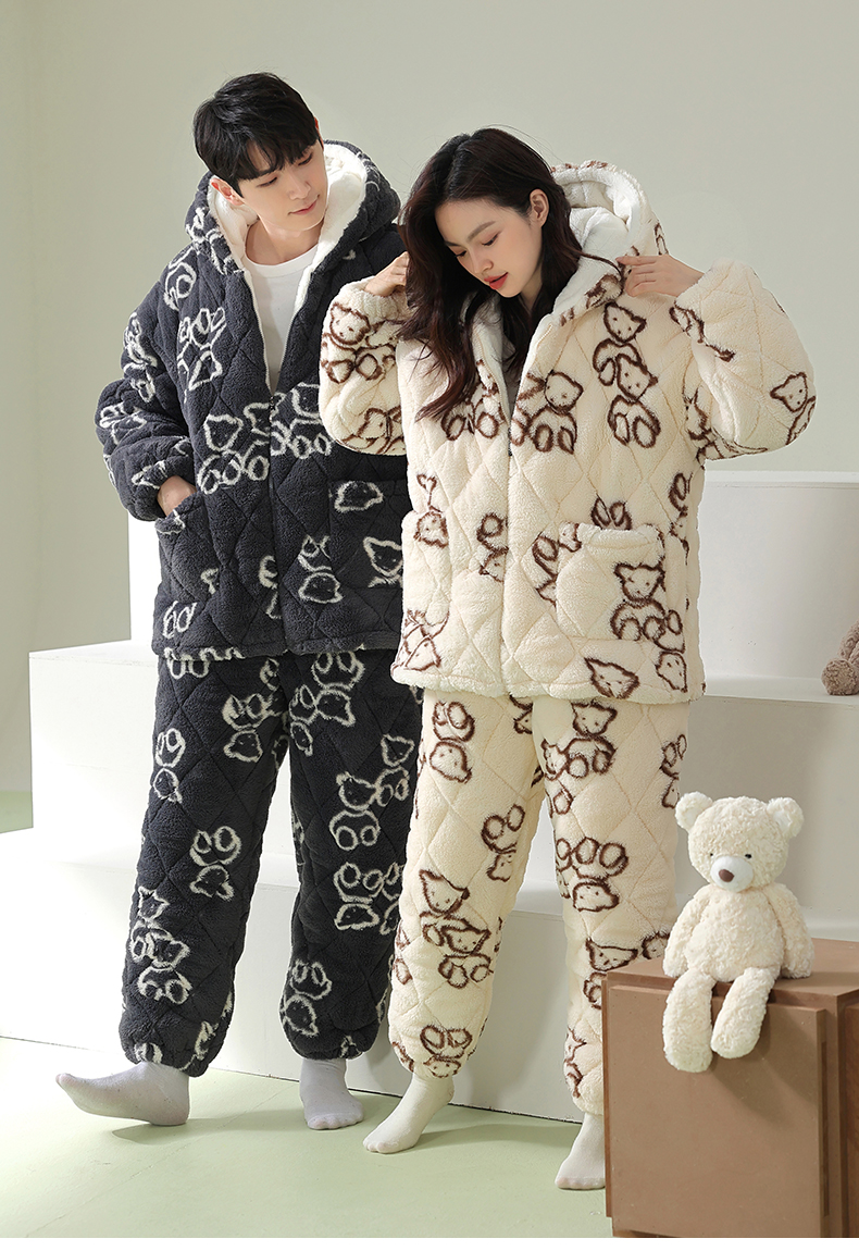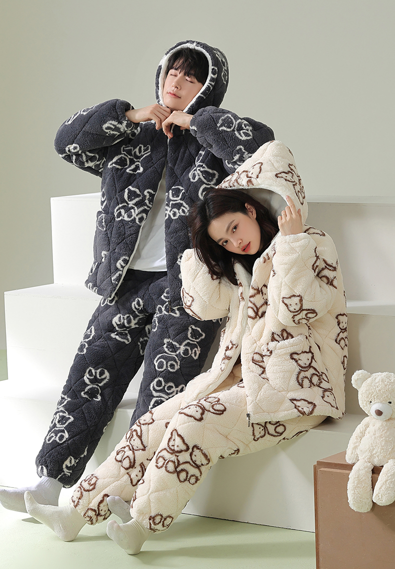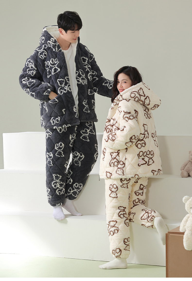 【夹棉暖衣】自然醒「怦然心动」贵妃绒三层加厚夹棉情侣睡衣冬季保暖珊瑚绒家居服女大码男士套装JLM