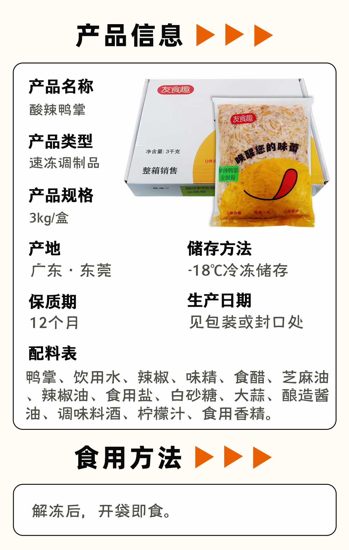 25H友食趣酸辣鸭掌(35g-40g/只,全脱骨,固形物≥80%) 3kg/盒