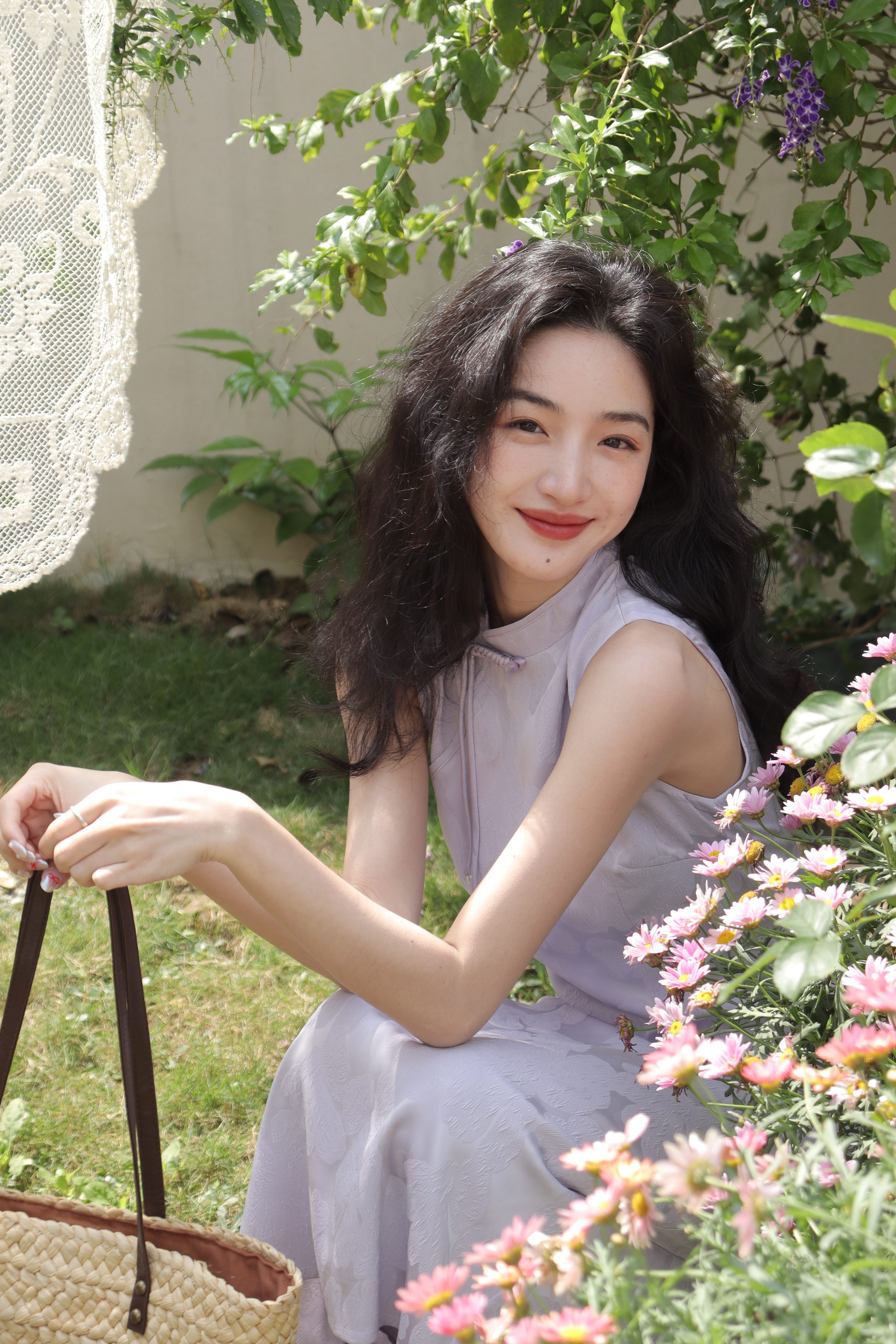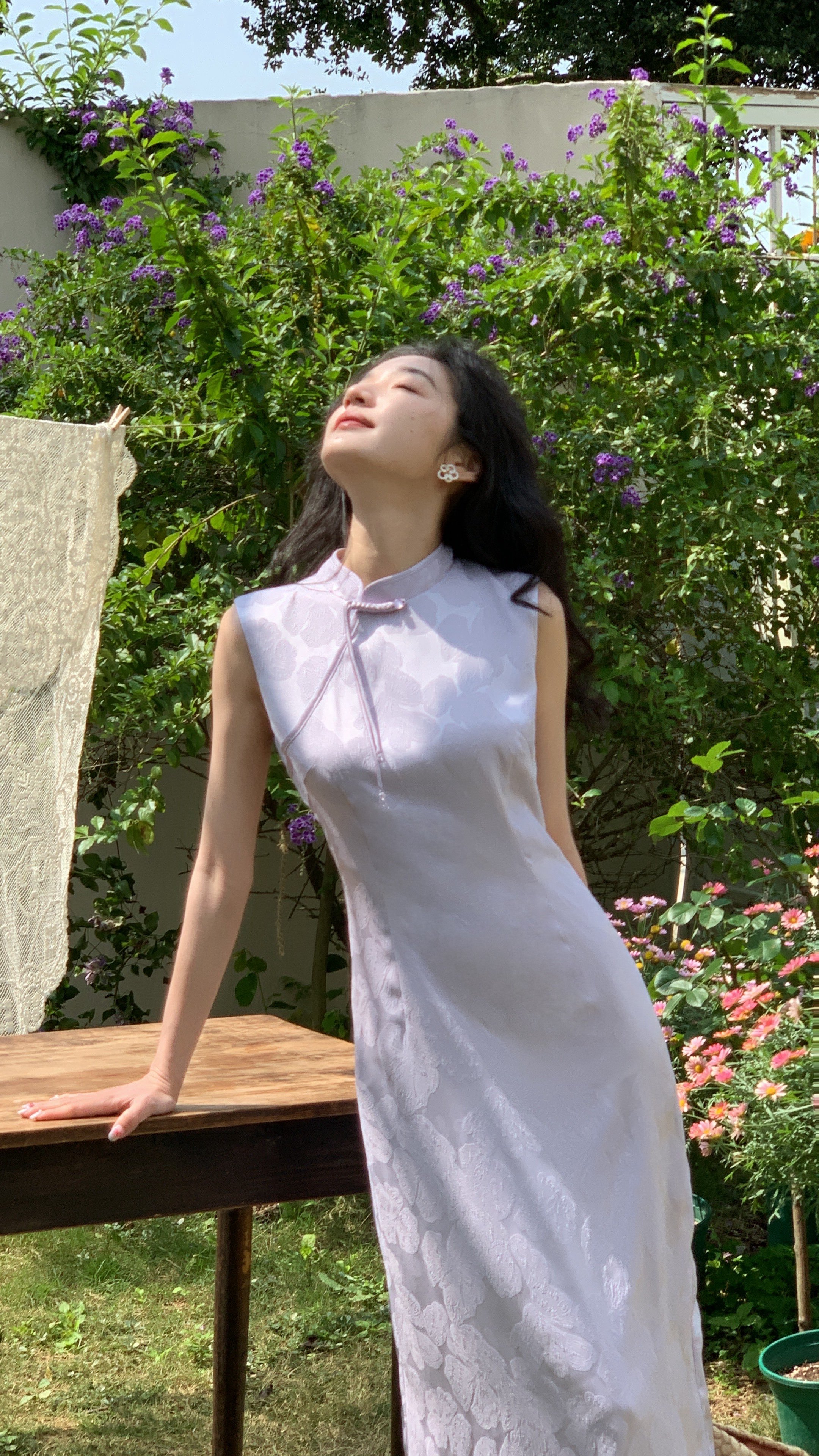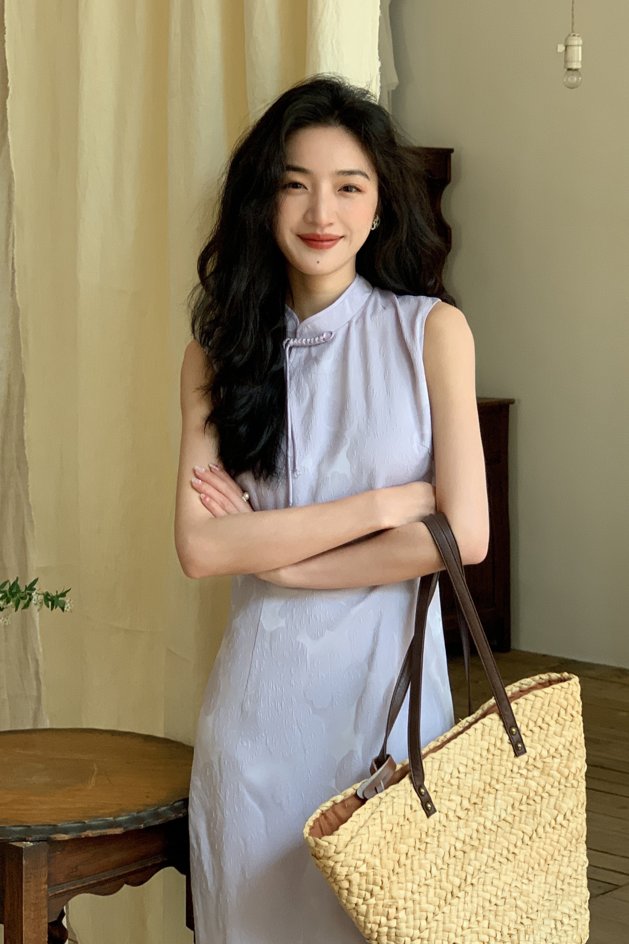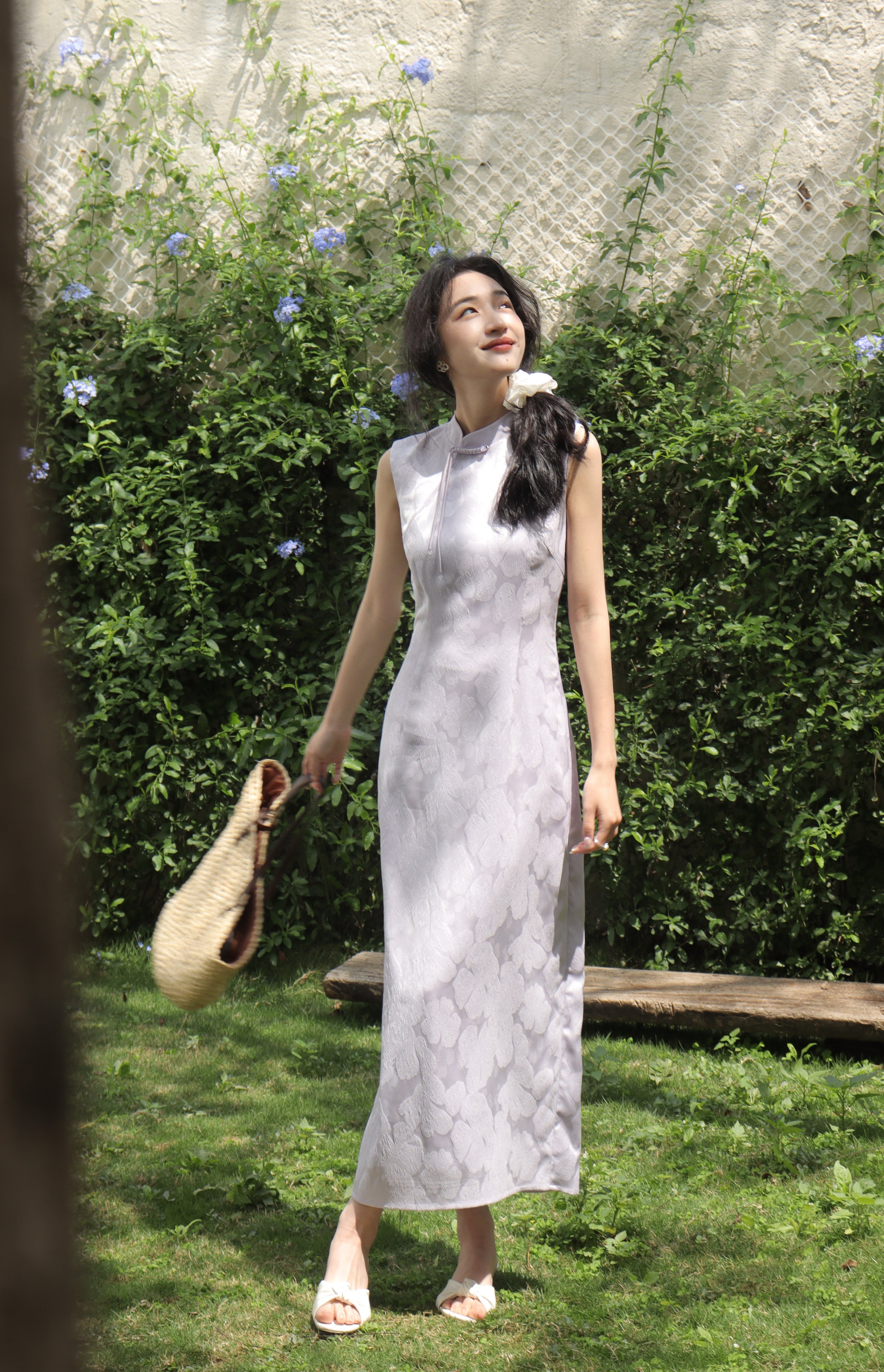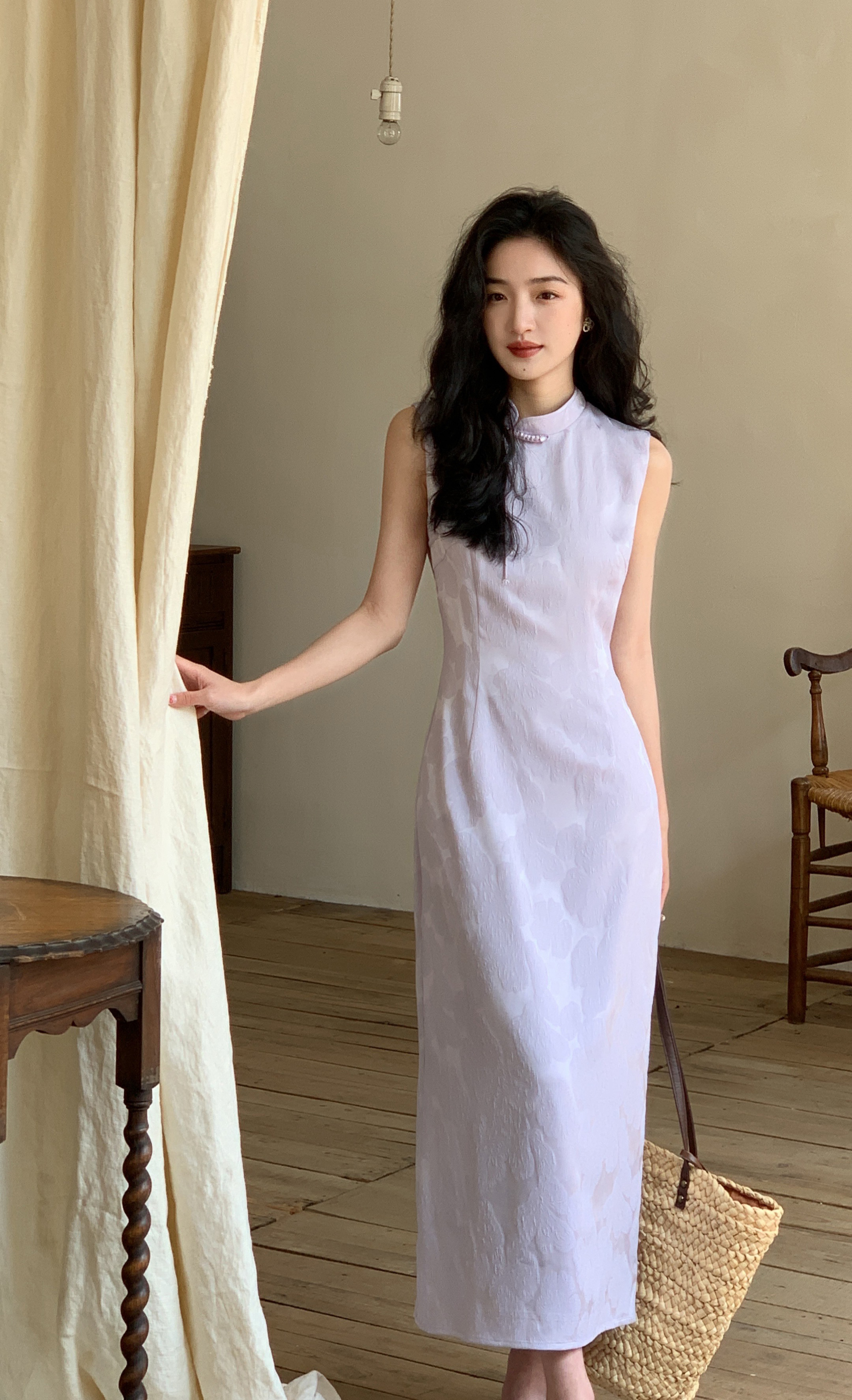 西遇新中式无袖连衣裙女新款淡紫色复古提花收腰旗袍长裙SS150113