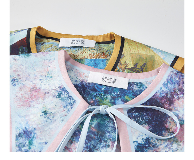 两三事梵高文艺 弦外智音 2025夏季新款彩绳绑带领印花短袖t恤女