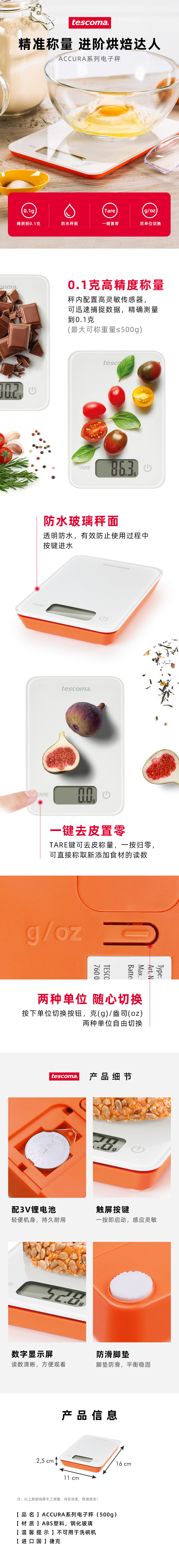 进口进口/tescoma 厨房烘焙工具电子称克称 双单位切换家用厨房称 防水玻璃称面 电子称