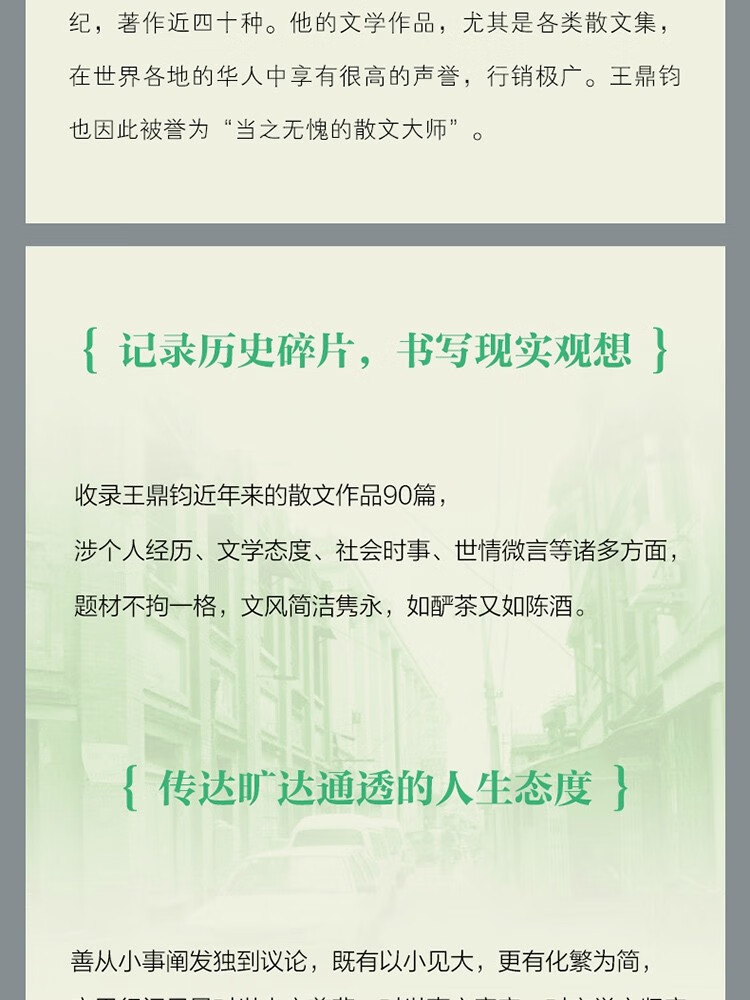 ②文章体裁灵活,风格淳厚,技巧圆熟,书写独特的晚年况味,尽显作者旷达、通透的人生态度,令人可读、可思、可悟。