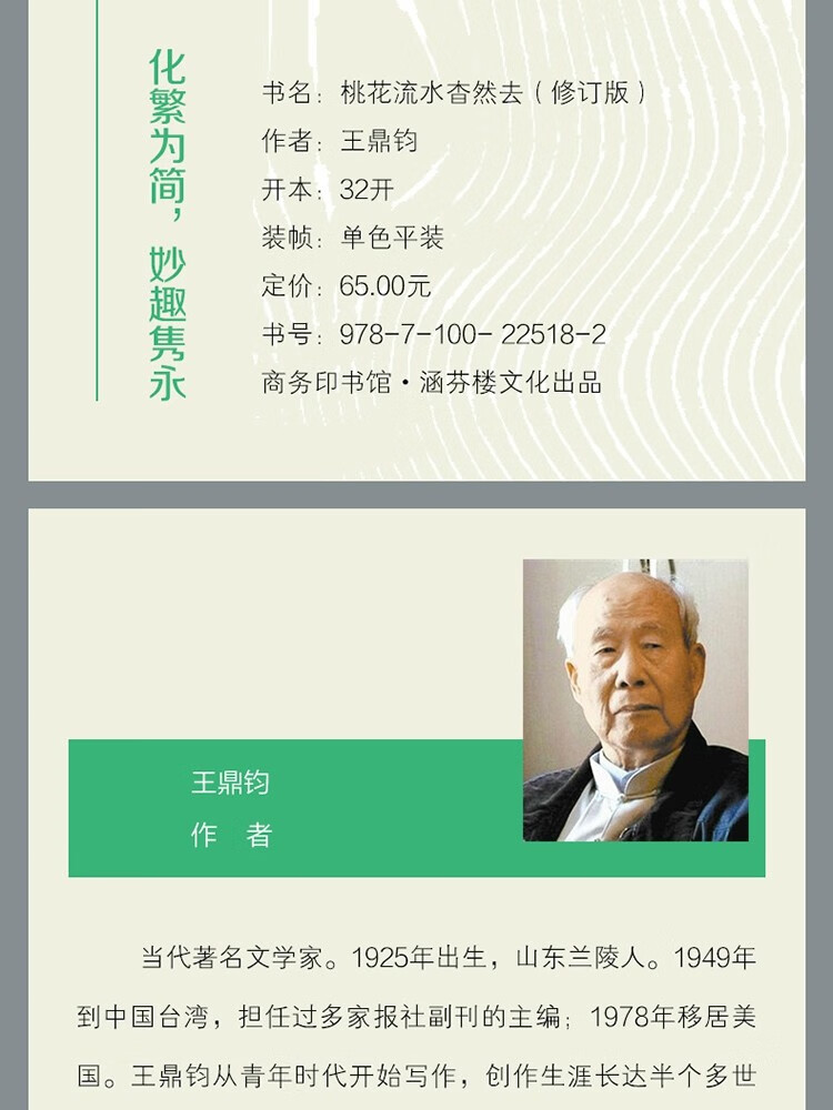 王鼎钧,当代著名文学家。1925年出生,山东兰陵人。1949年到中国台湾,担任过多家报社副刊的主编;1978年移居美国。王鼎钧从青年时代开始写作,创作生涯长达半个多世纪,著作近四十种。他的文学作品,尤其是各类散文集,在世界各地的华人中享有很高的声誉,行销极广。王鼎钧散文因丰富的阅历、深沉的家国情怀、圆熟的文学技巧而呈现丰厚多样的文学生命样貌,作者也因此被誉为“当之无愧的散文大师”。