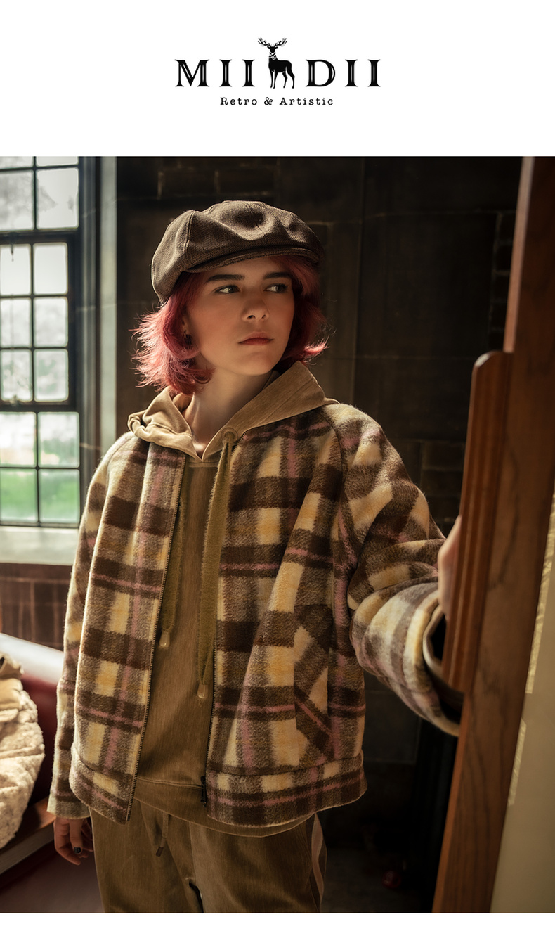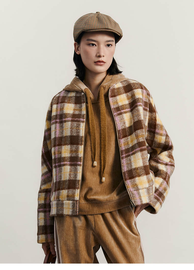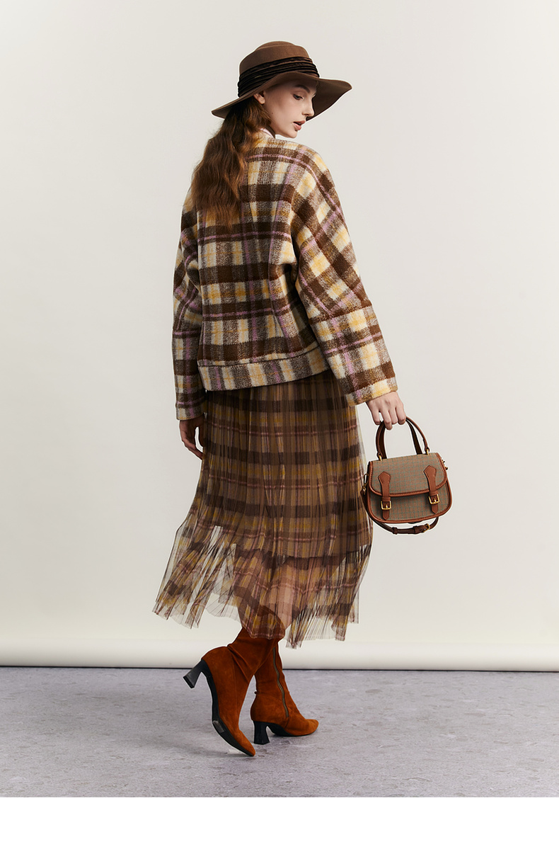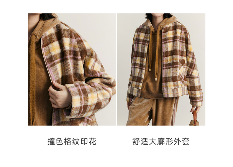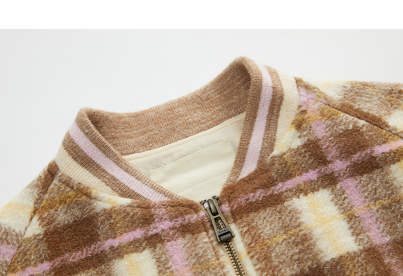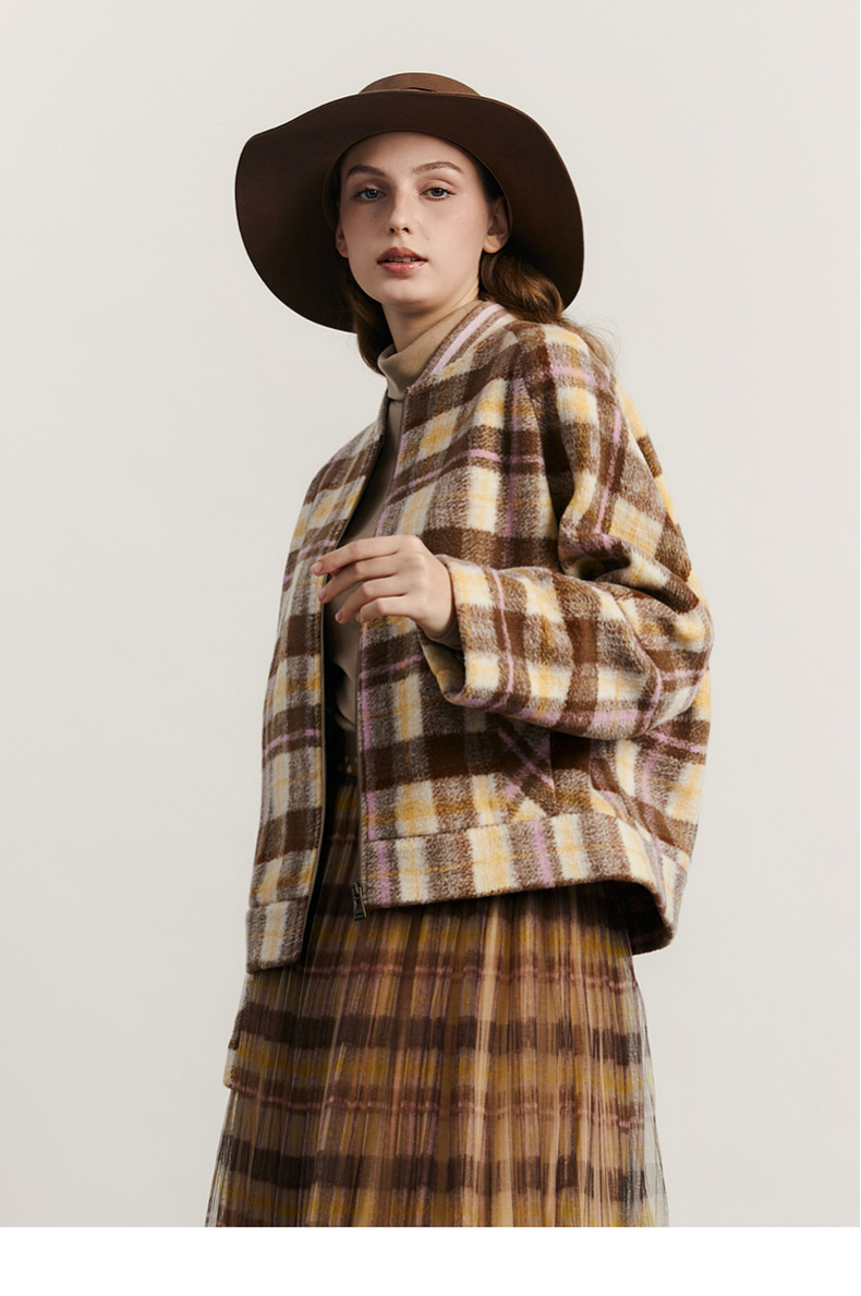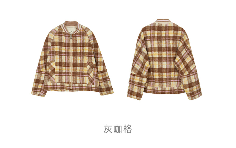谜底粗花呢外套女2023冬季新品复古格子棒球领呢子大衣234MW1460