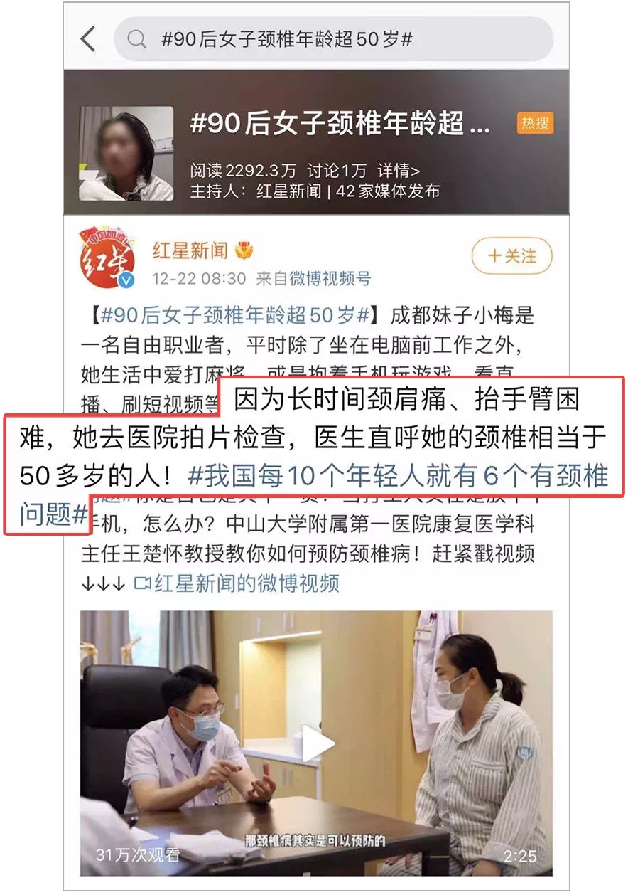 根据国家卫计委全国健康普查数据,全国颈椎病患者已经突破了整整2亿人!90后年轻人颈椎年龄超50岁、每10个年轻人就有6个有颈椎问题......