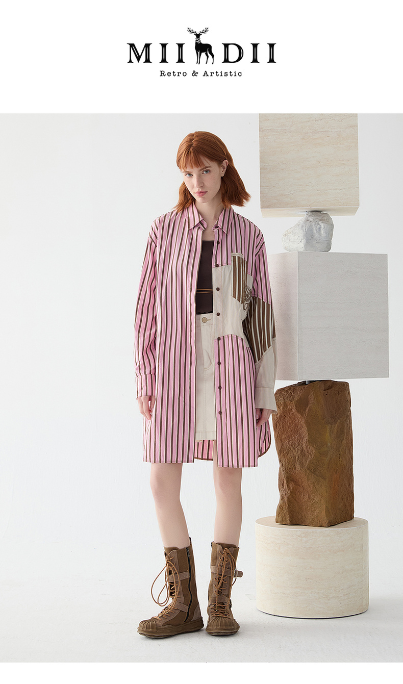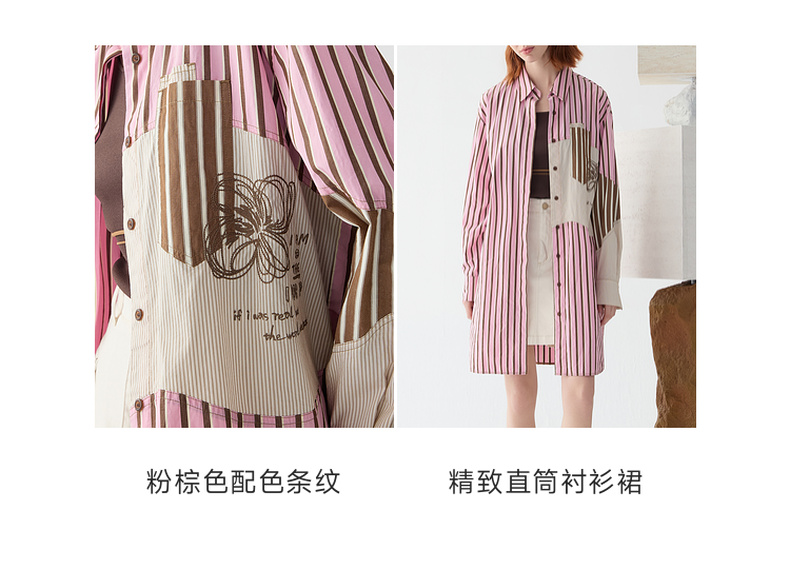 谜底粉色条纹衬衫裙2025春季新品复古文艺绣花H型连衣裙251ML0114