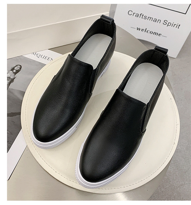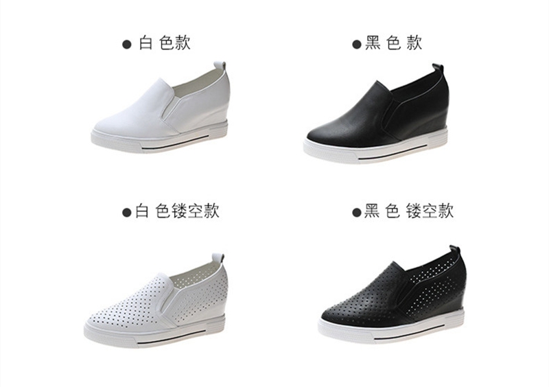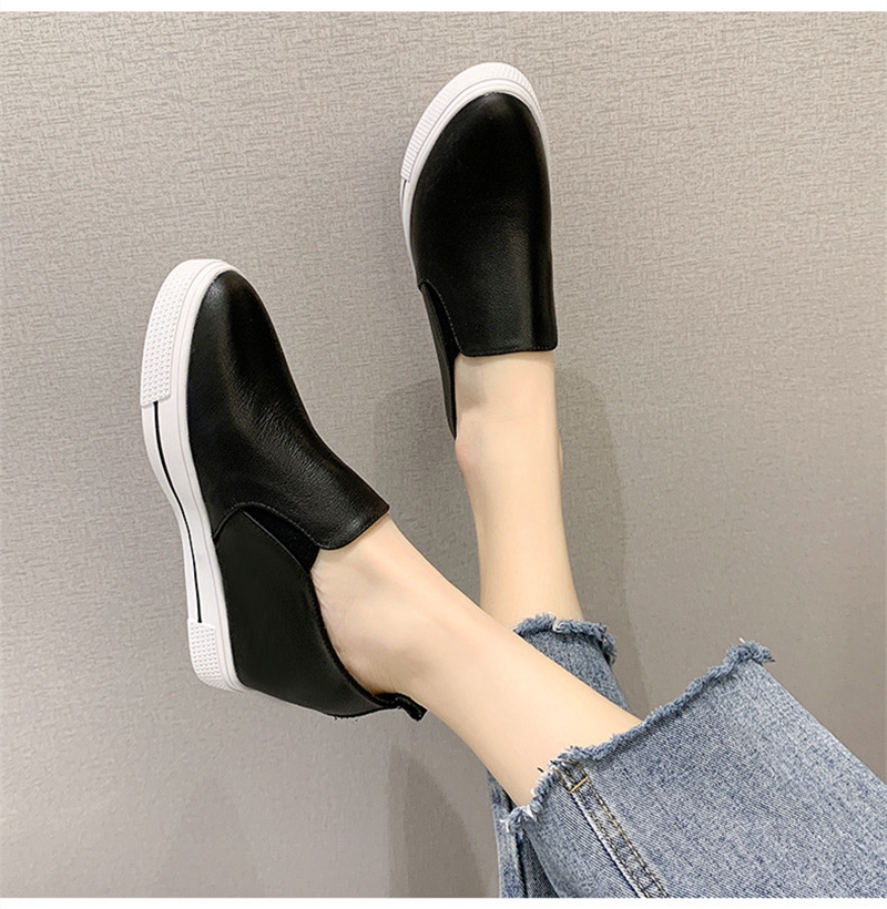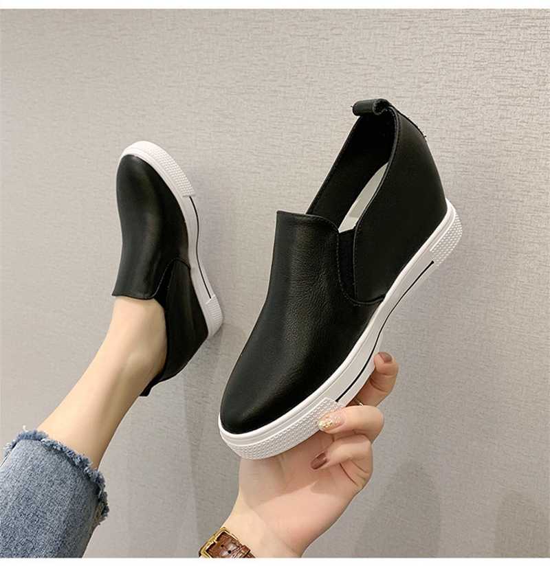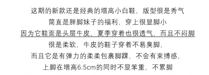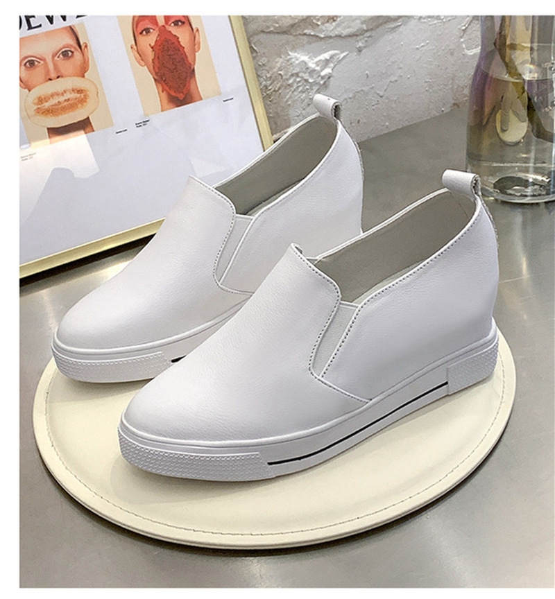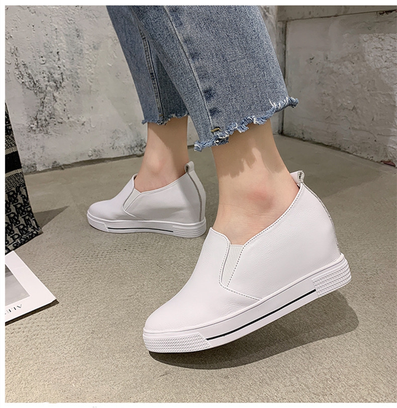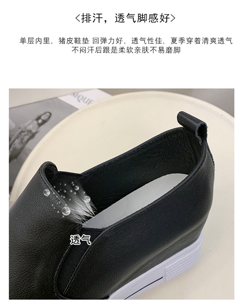 头层牛皮圆头低帮坡跟内增高厚底小白鞋