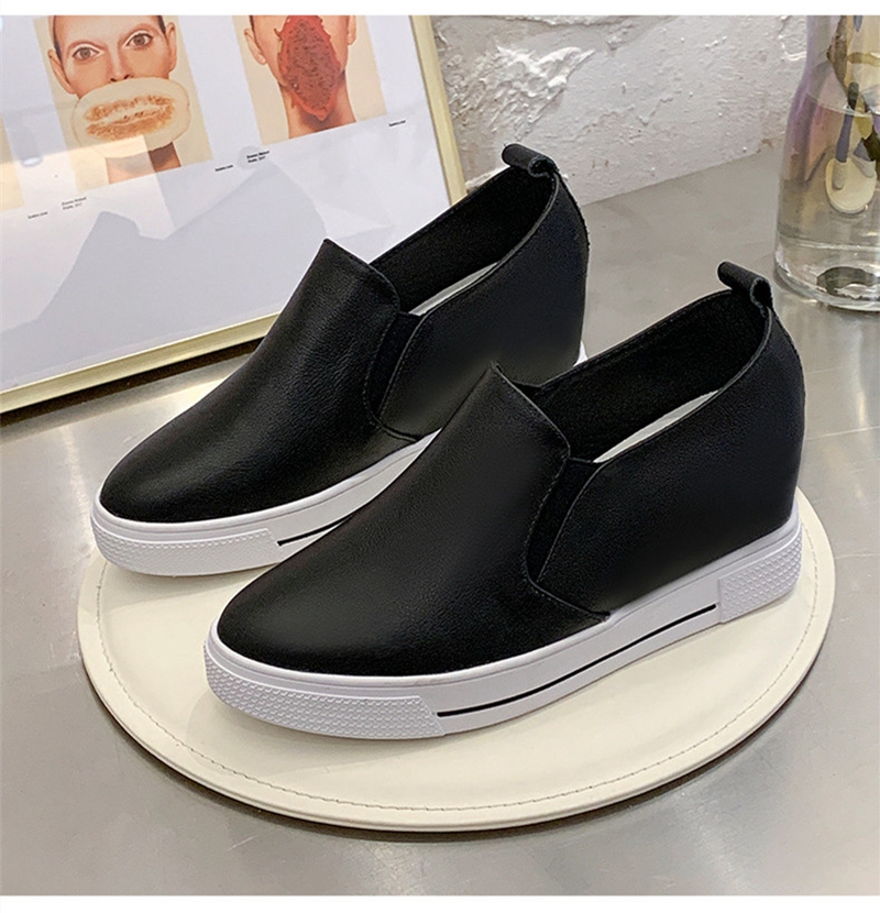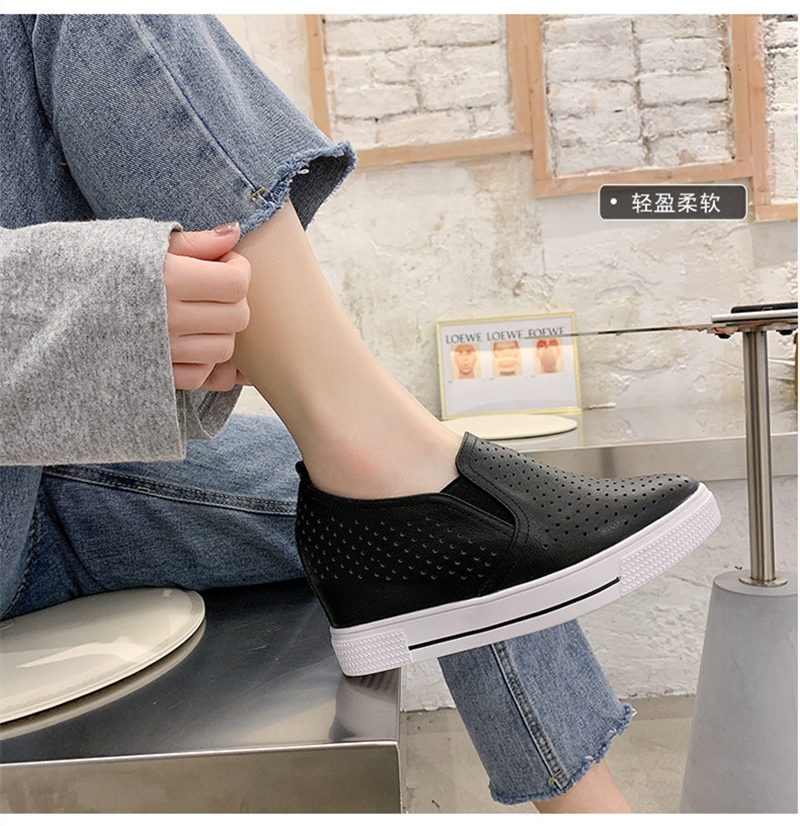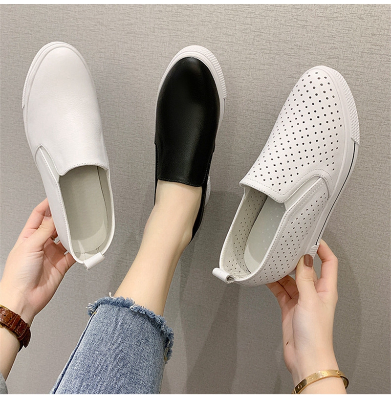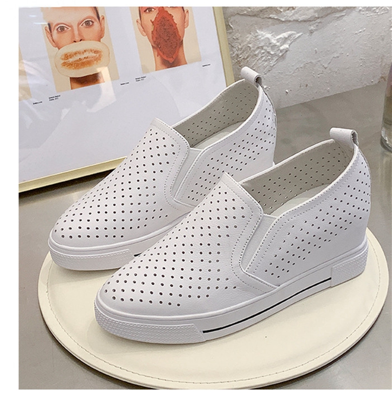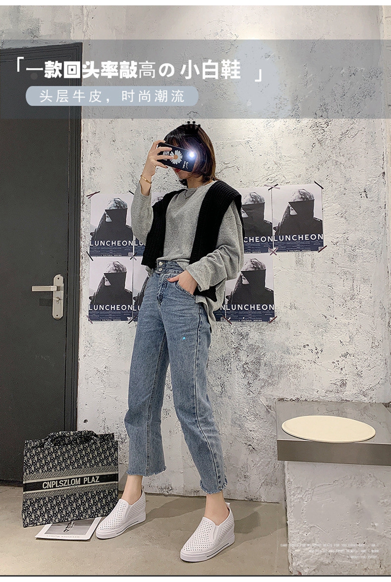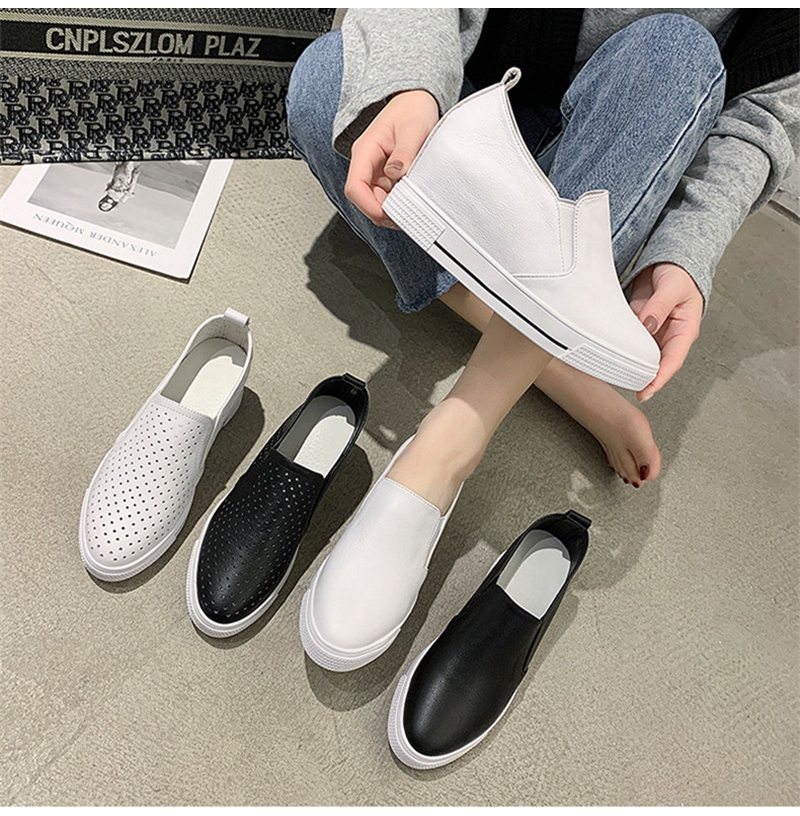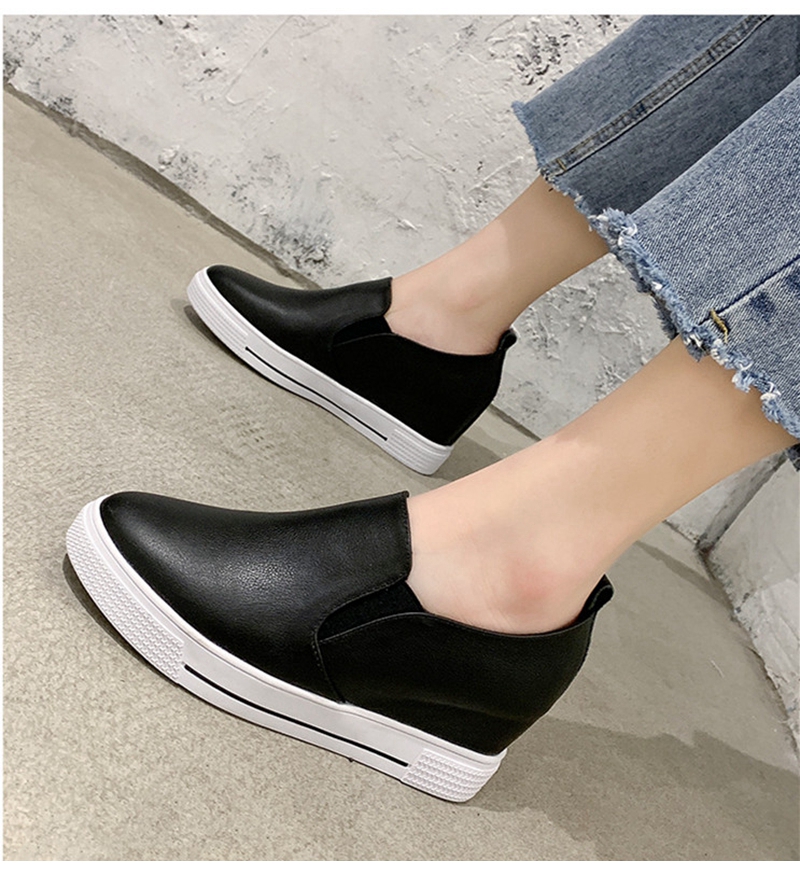 头层牛皮圆头低帮坡跟内增高厚底小白鞋
