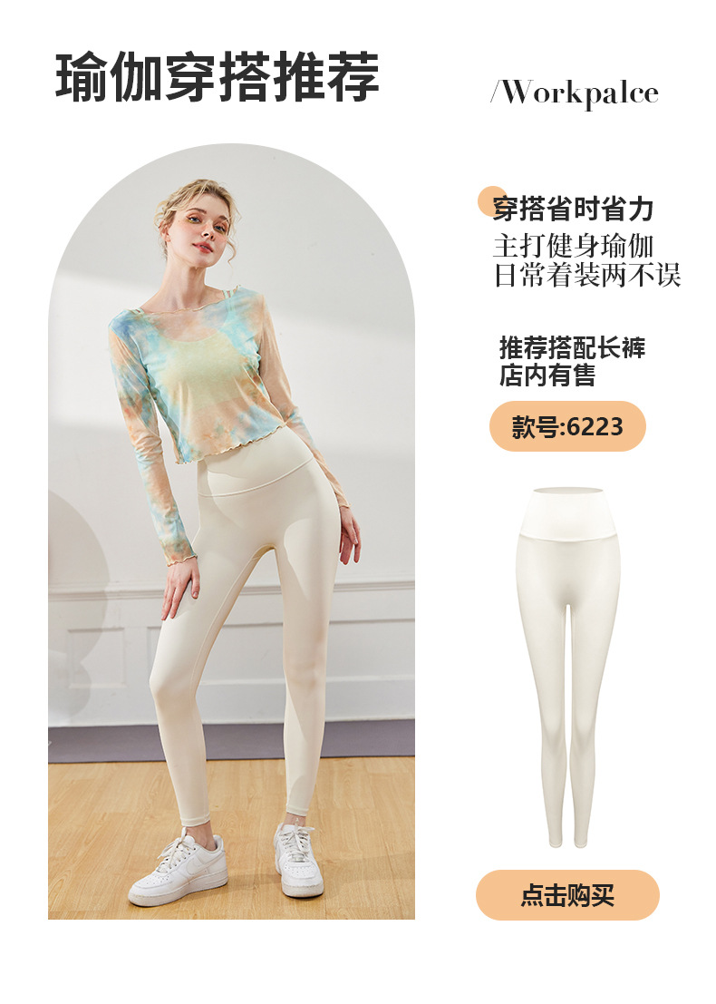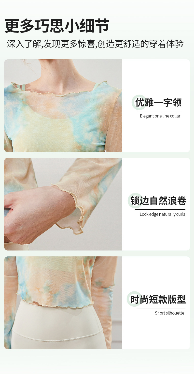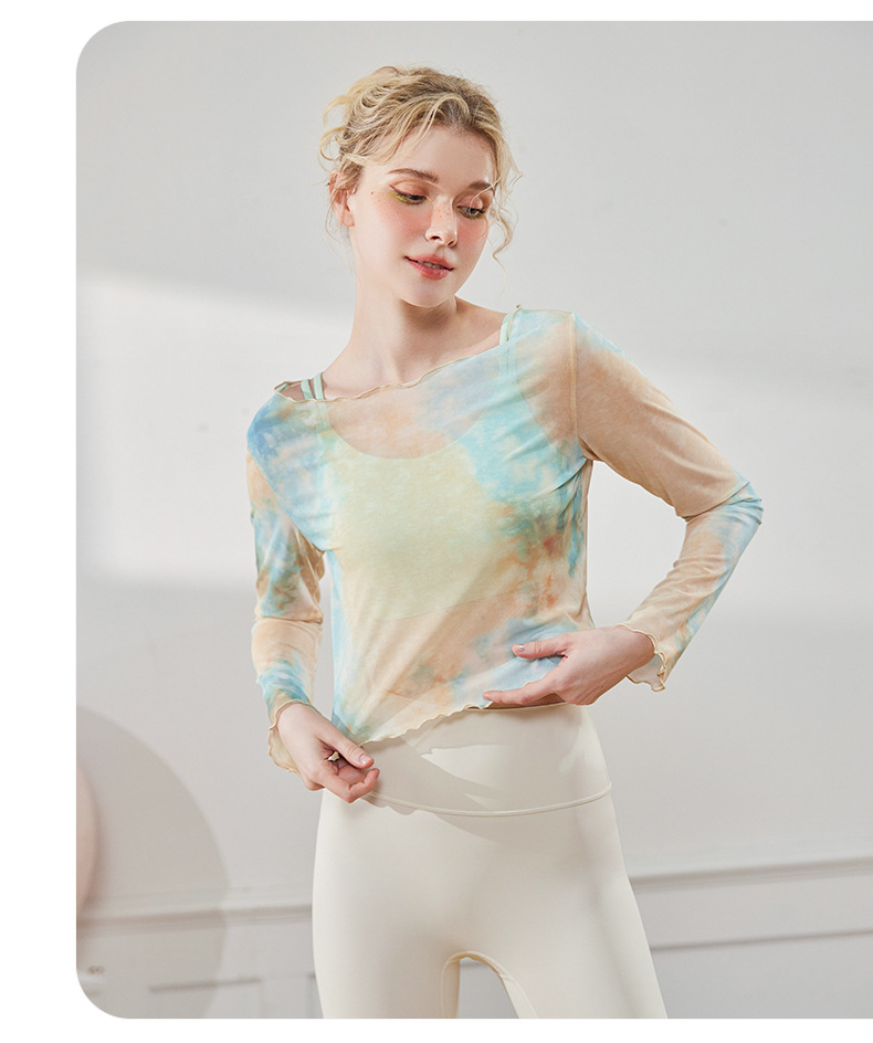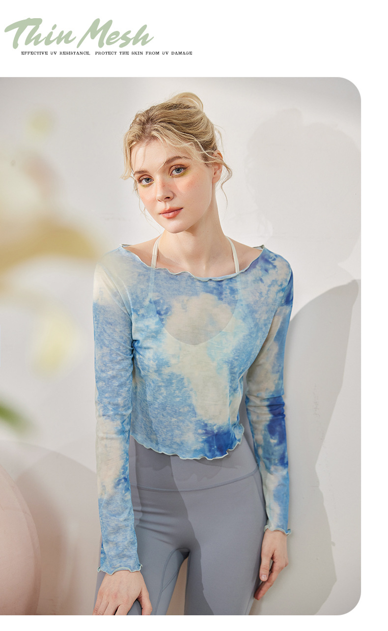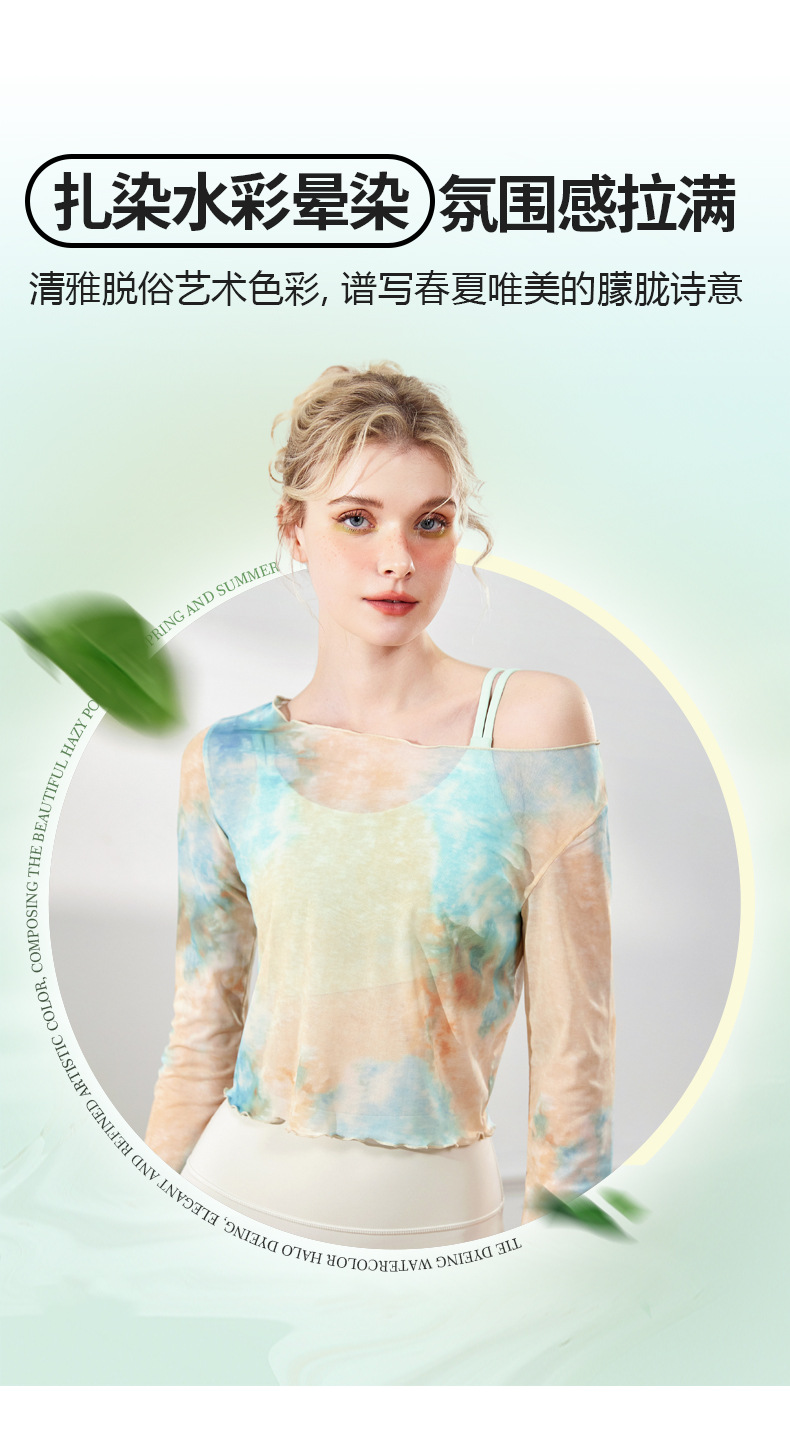 瑜伽服女夏季新款长袖扎染上衣健身网纱宽松薄款一字肩t恤罩衫女
