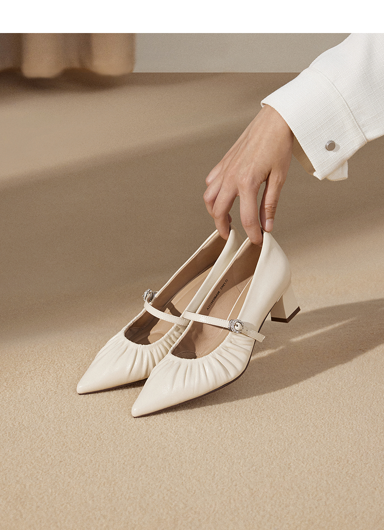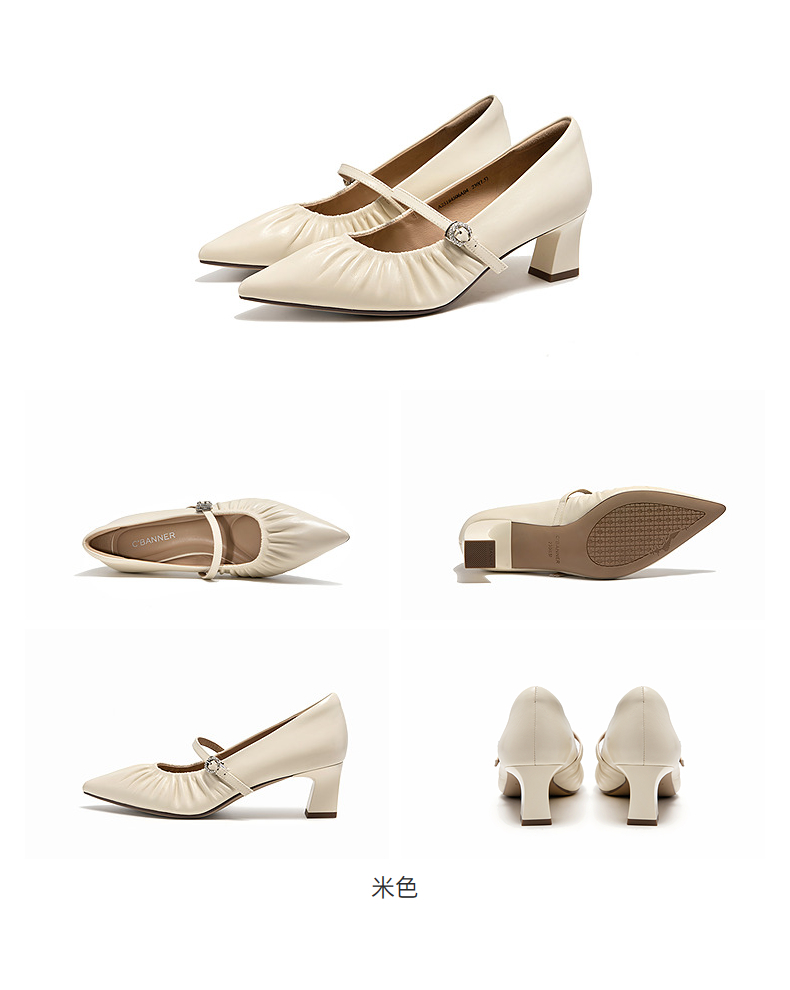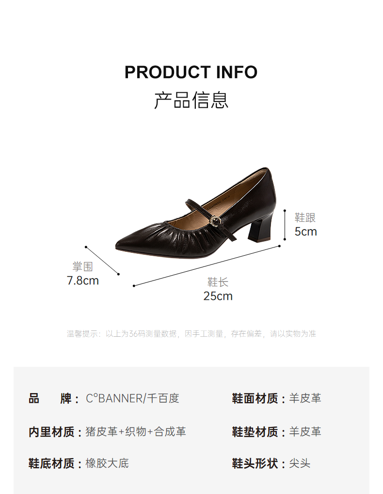 【静音系列】千百度粗高跟鞋女款褶皱羊皮玛丽珍鞋A25184506
