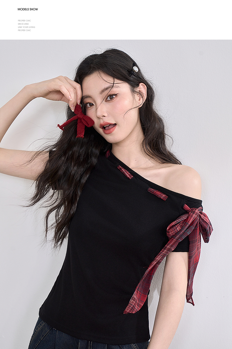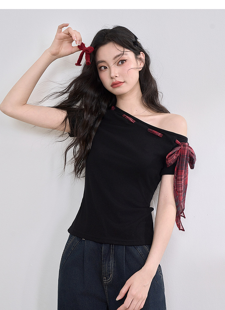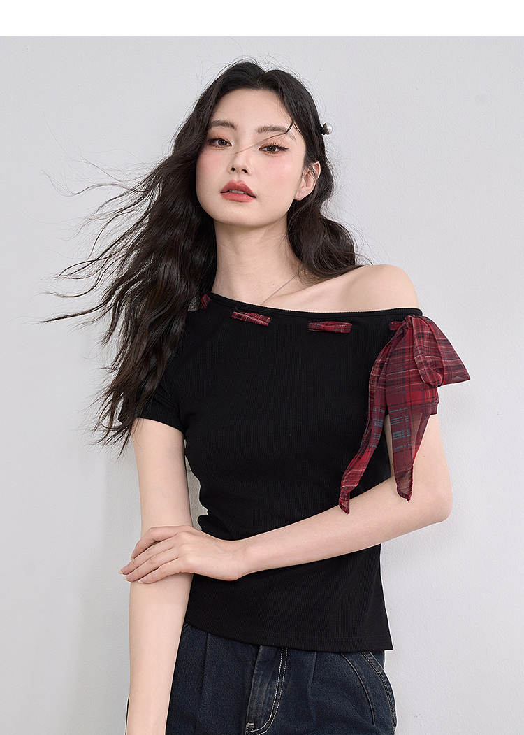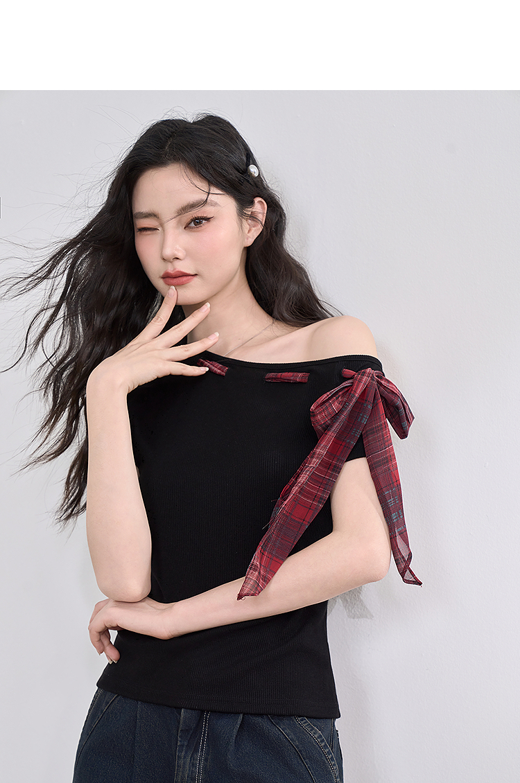 美式复古性感辣妹斜肩设计感格纹绑带T恤女收腰上衣V0050632