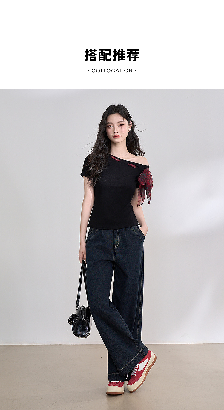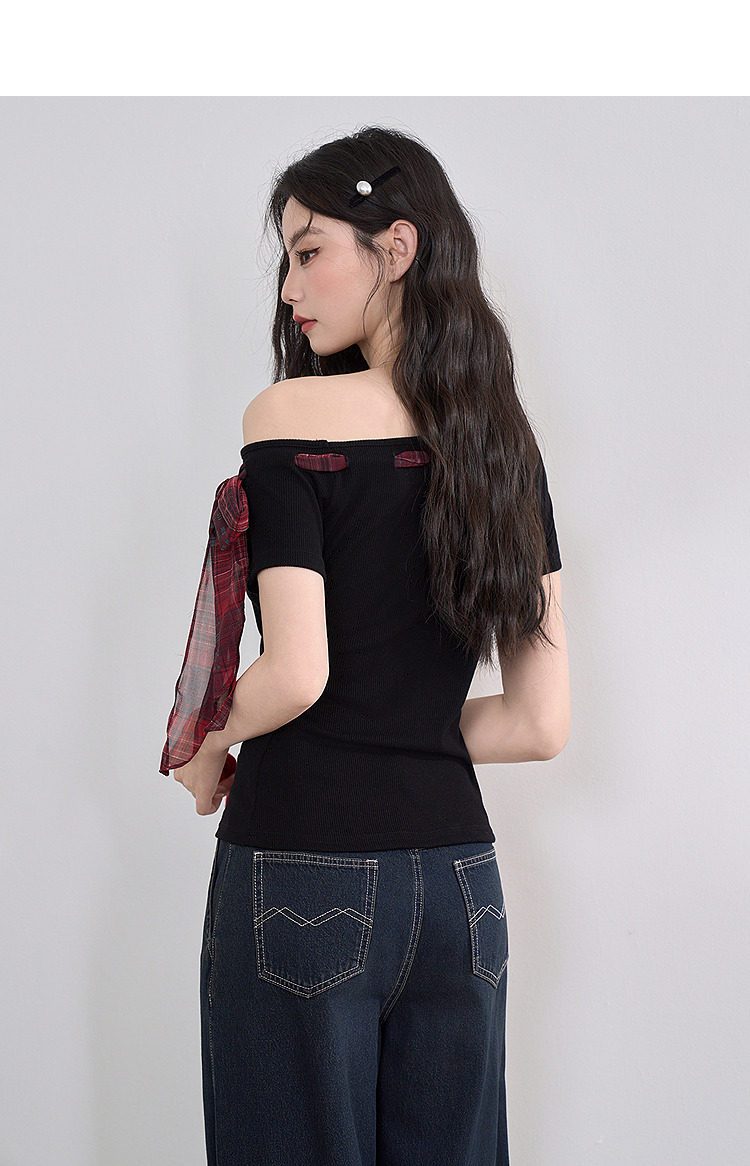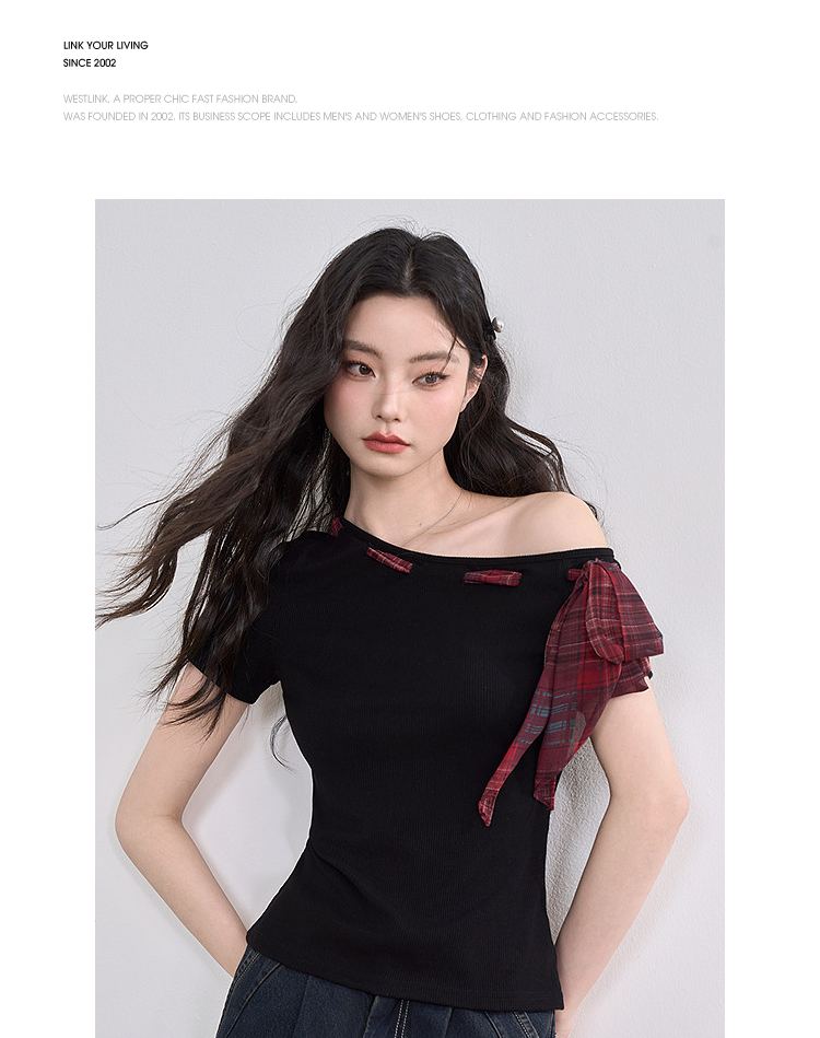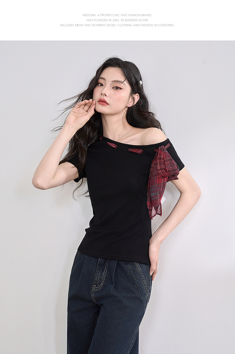 美式复古性感辣妹斜肩设计感格纹绑带T恤女收腰上衣V0050632