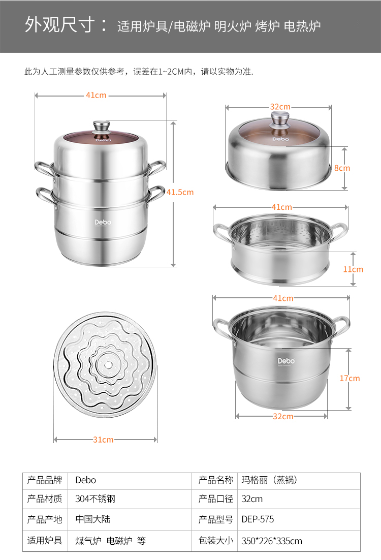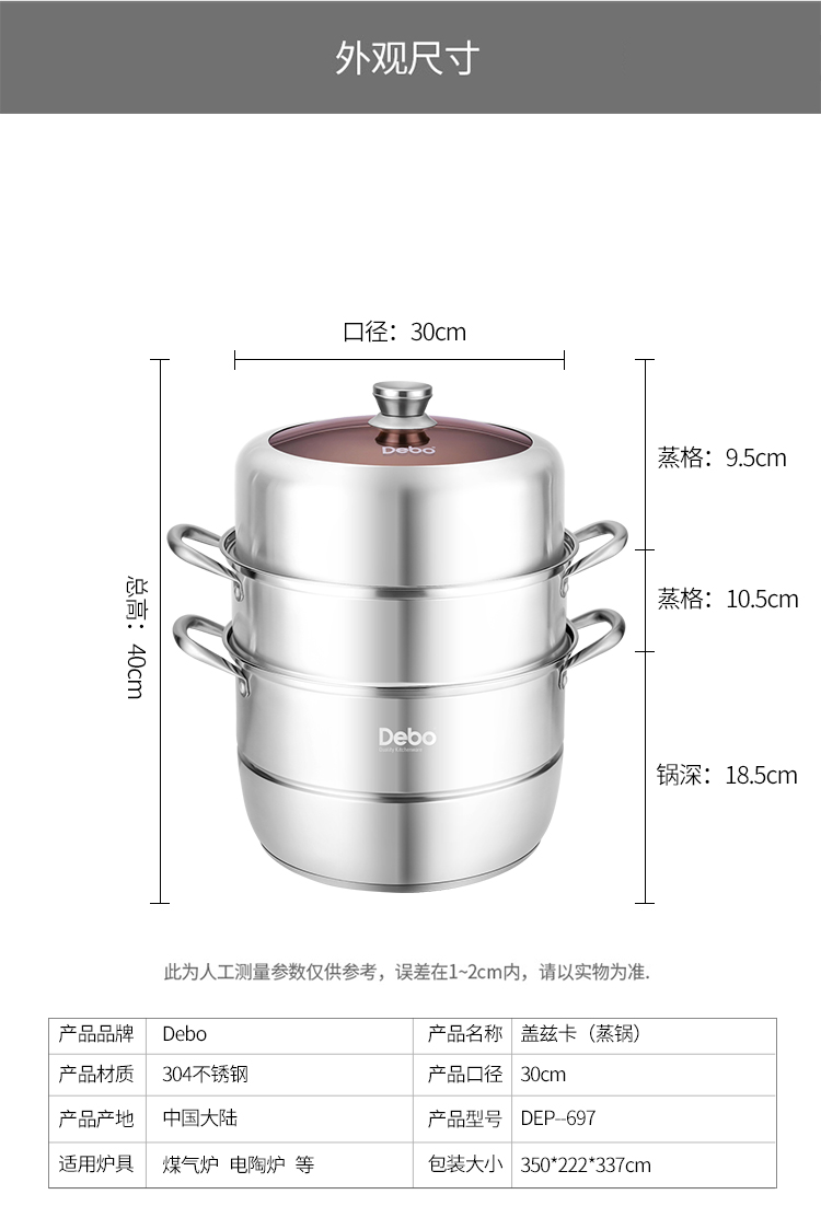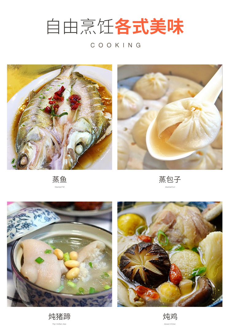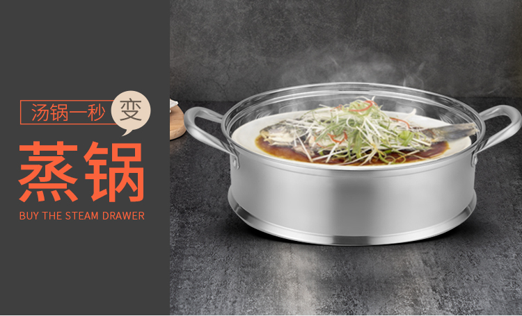 配置:锅身*1、组合盖*1、蒸片*2、蒸格*1