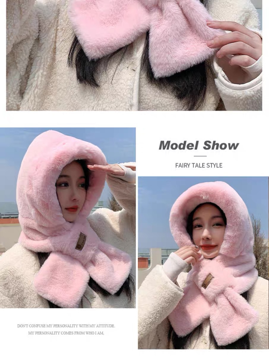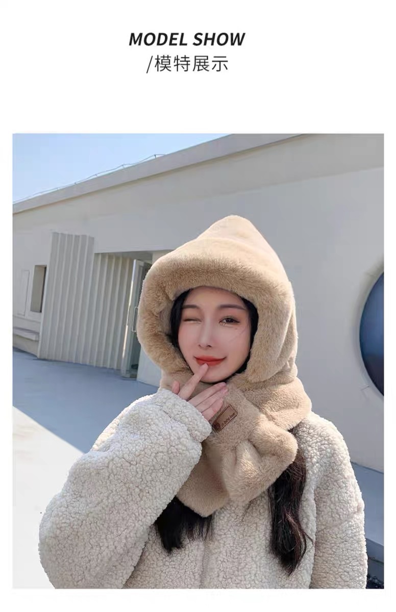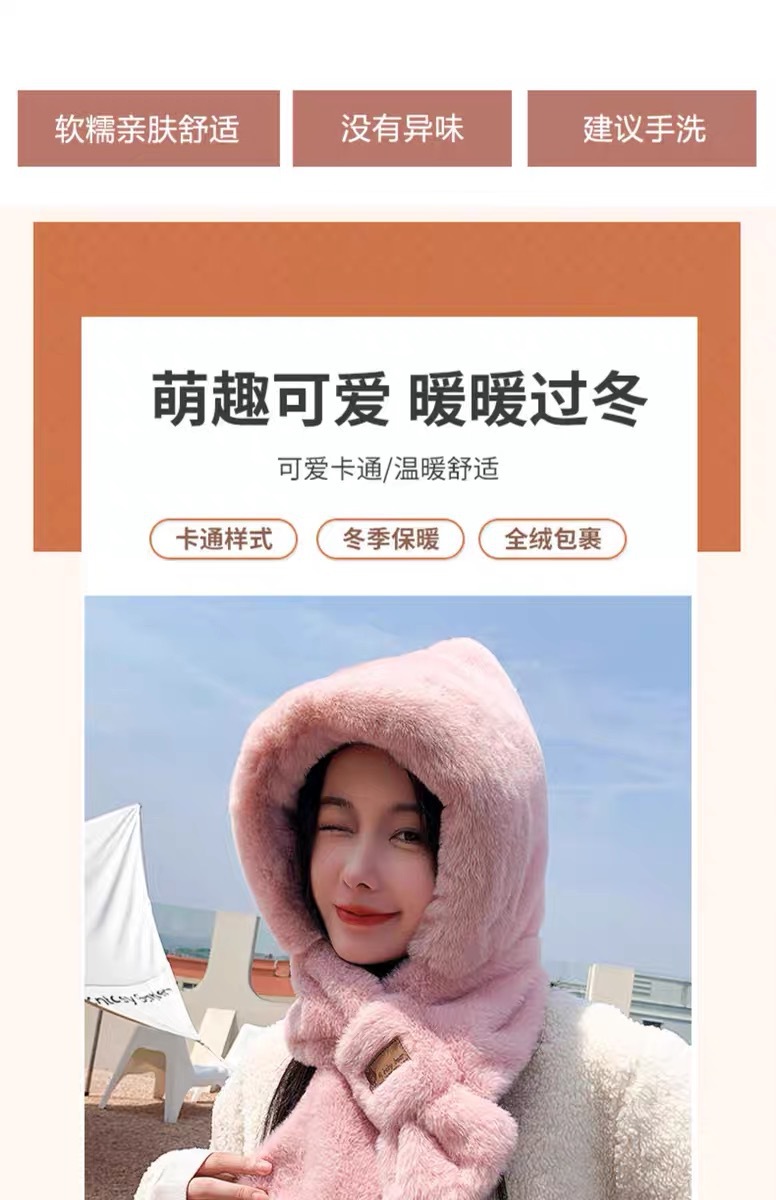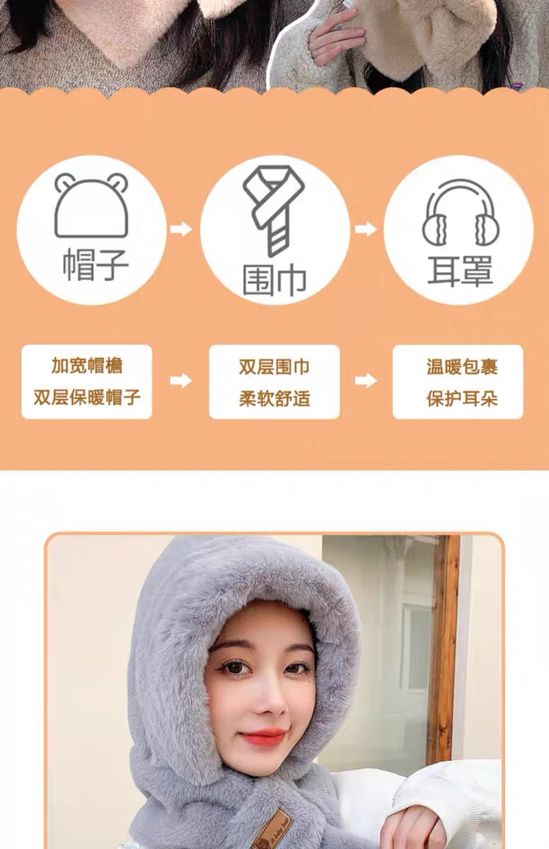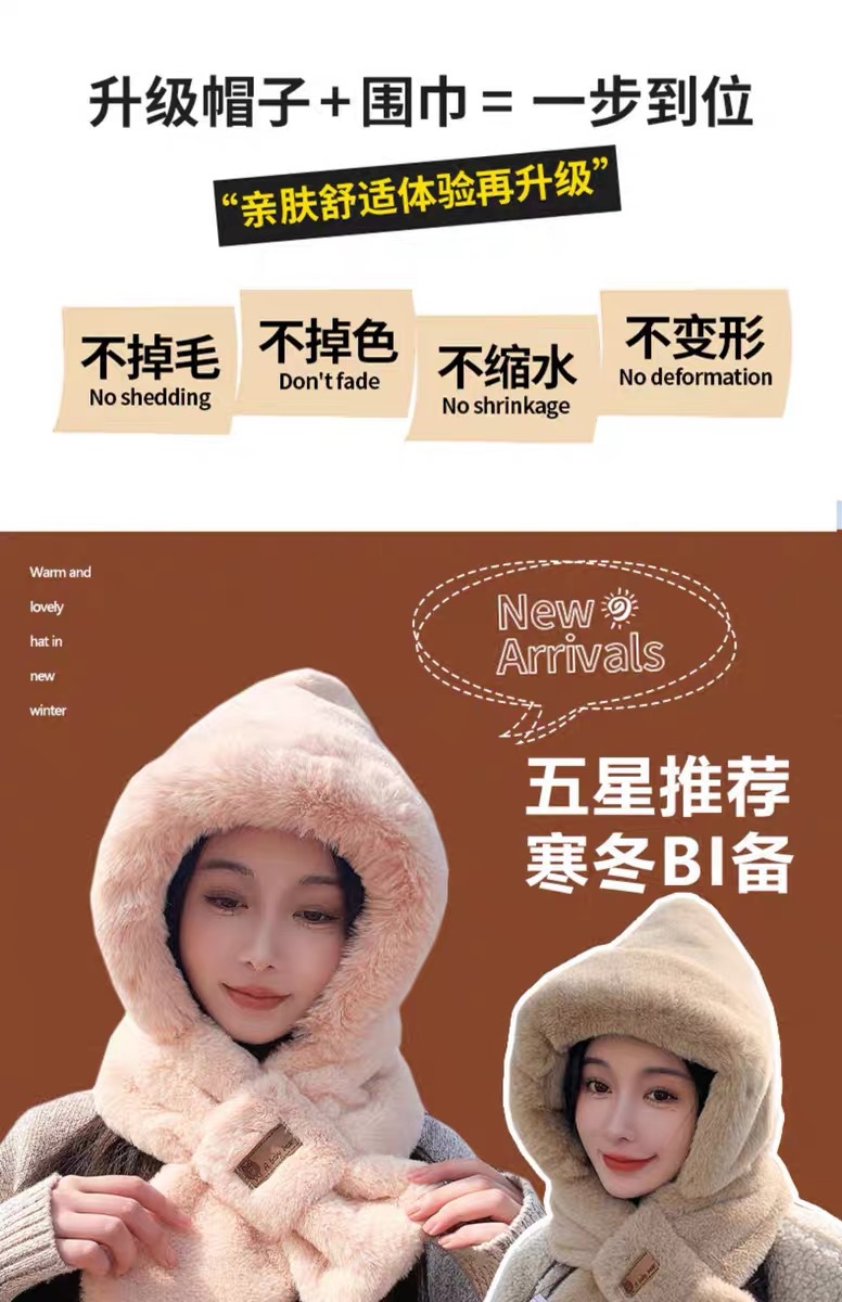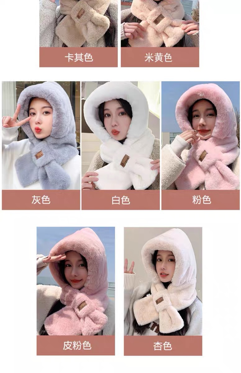 「四色可选!围巾帽子二合一」秋冬季保暖毛绒加厚可爱护耳帽子防寒围脖连帽配饰