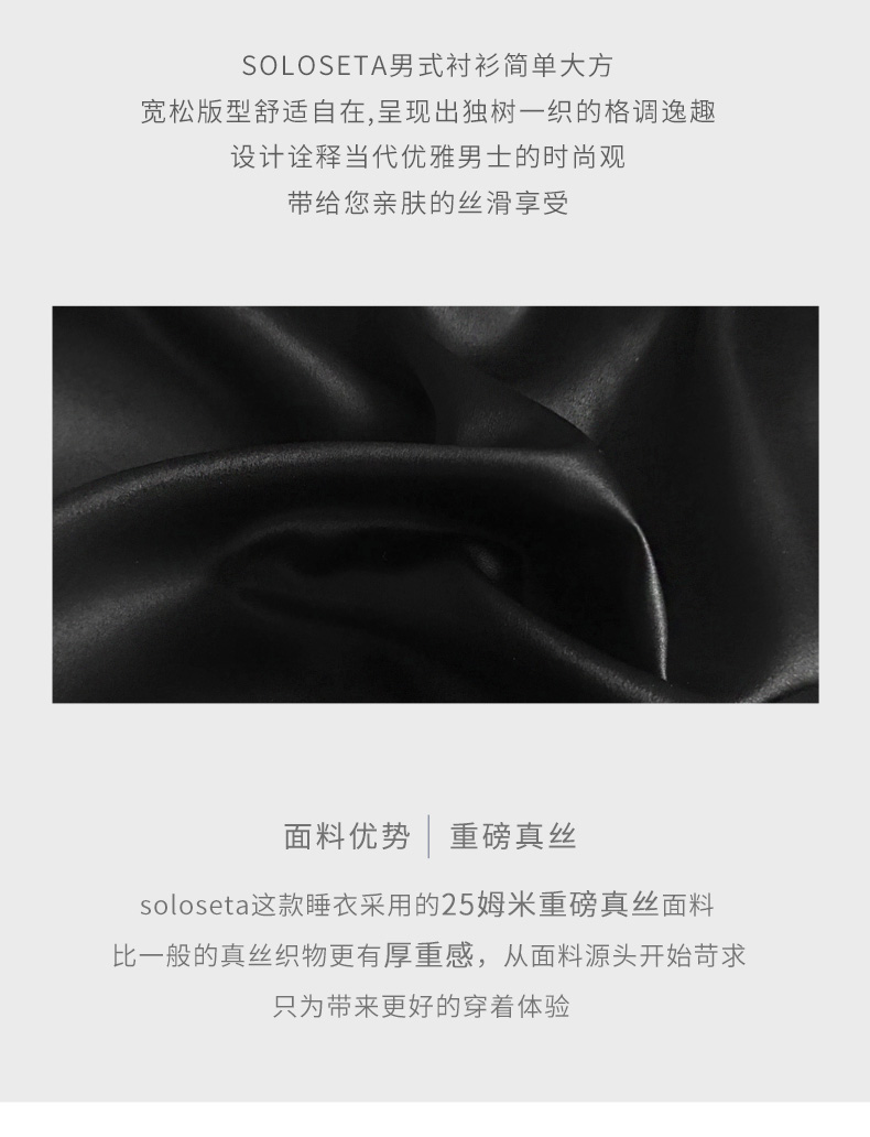 - soloseta专注于真丝织物,灵感源自意大利语,中文含义为“只做真丝”的意思。让睡衣变时尚,居家和外出瞬间切换,使其更具有出街,度假,参加宴会等功能。