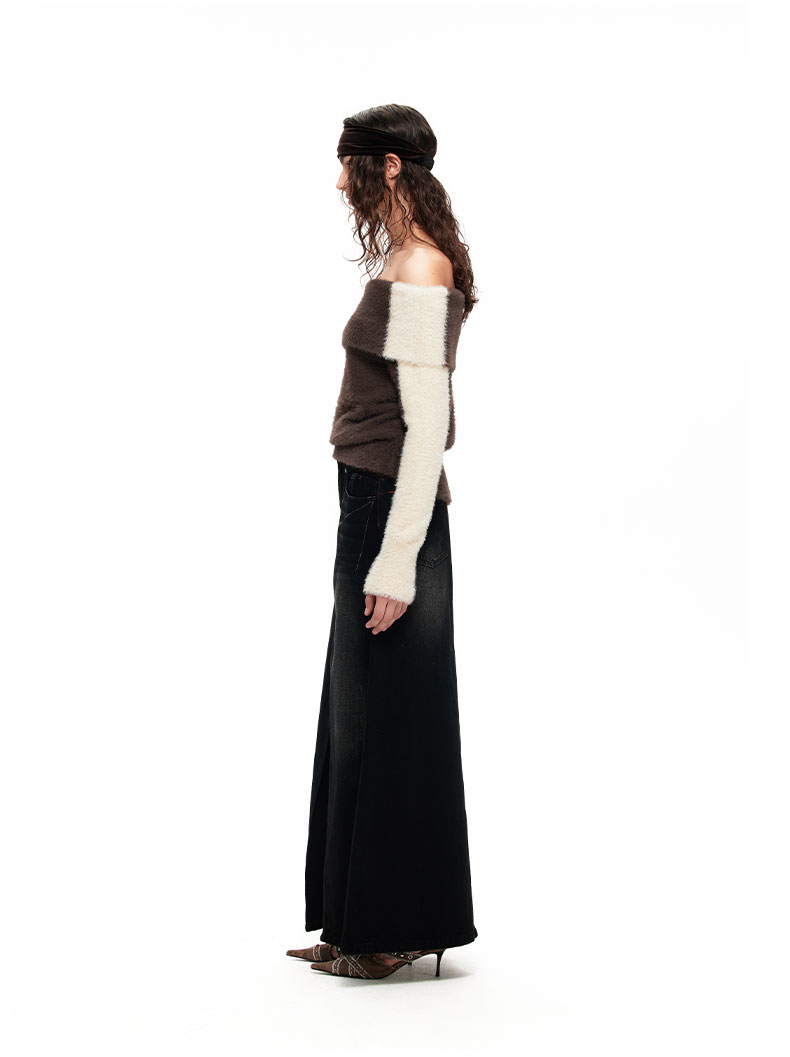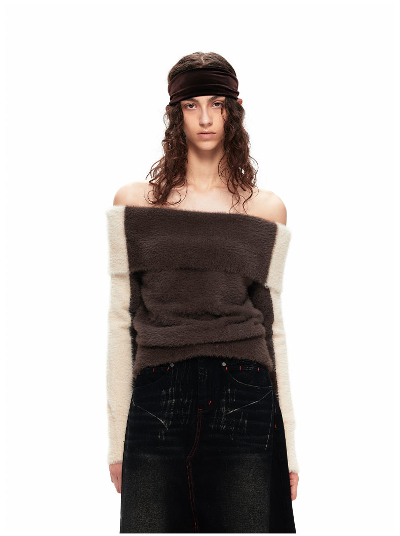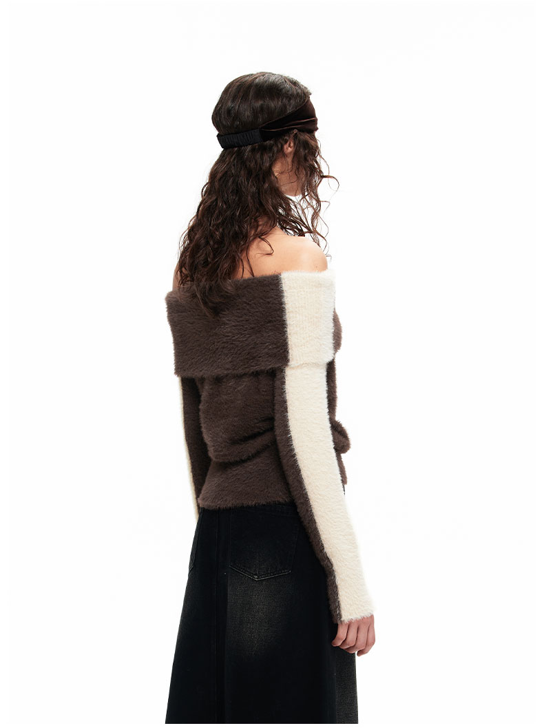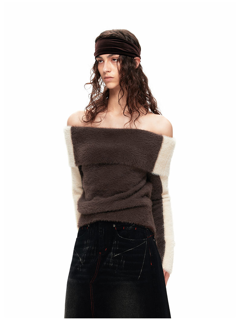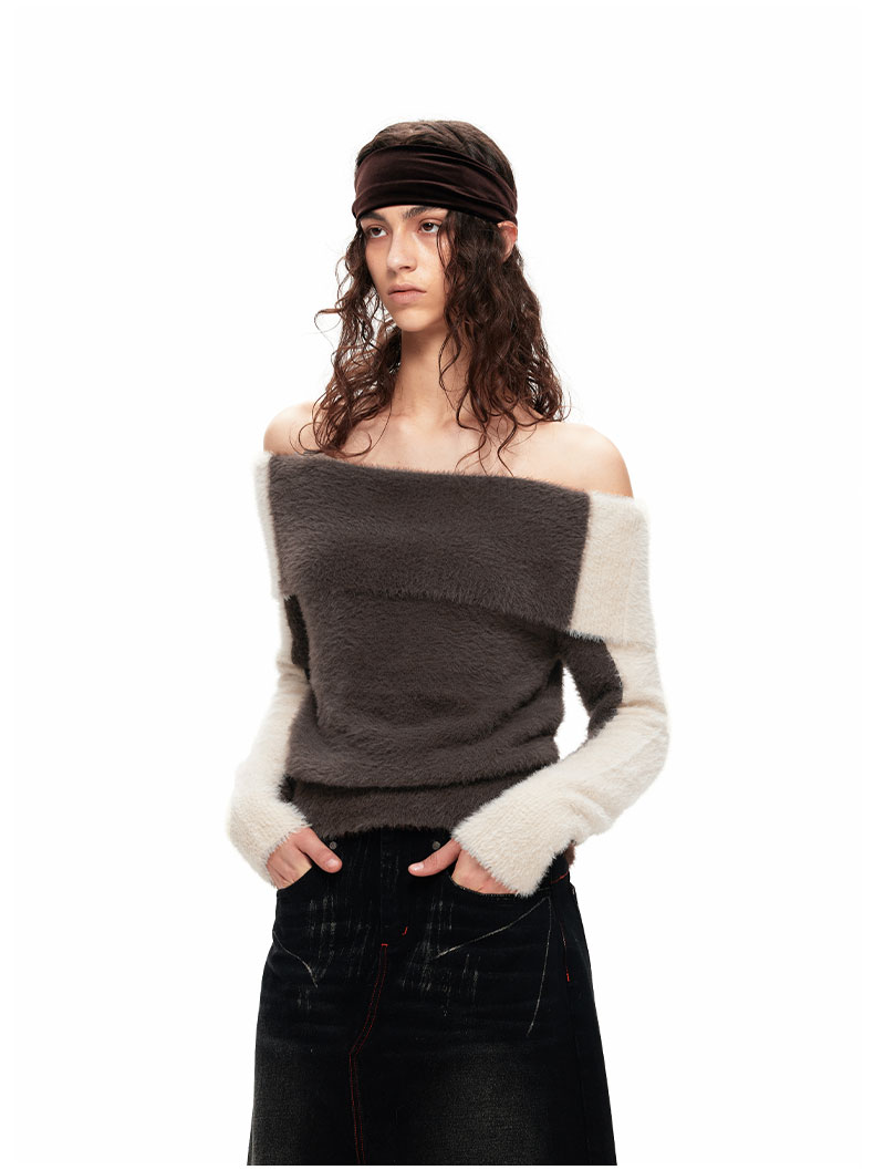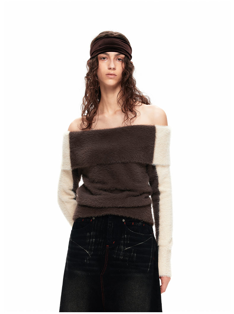 NUTH“盒子”|撞色仿貂毛露肩拼色慵懒一字肩毛衣女上衣美拉德