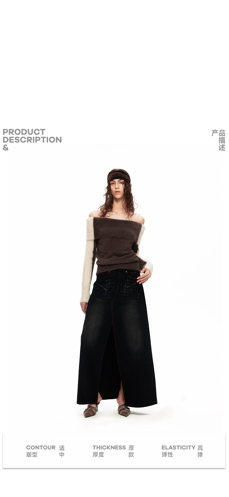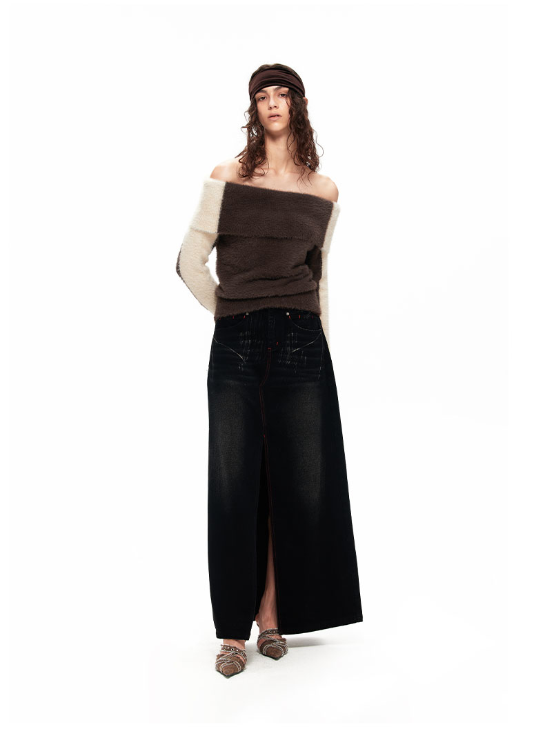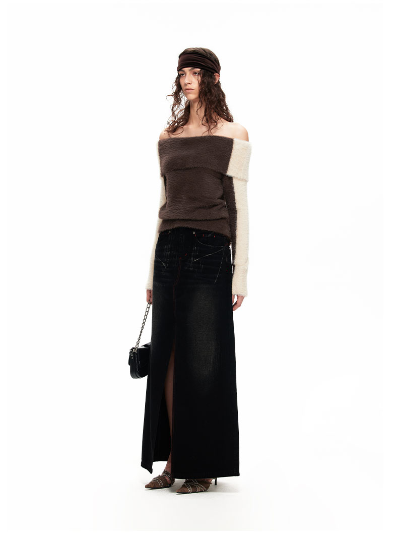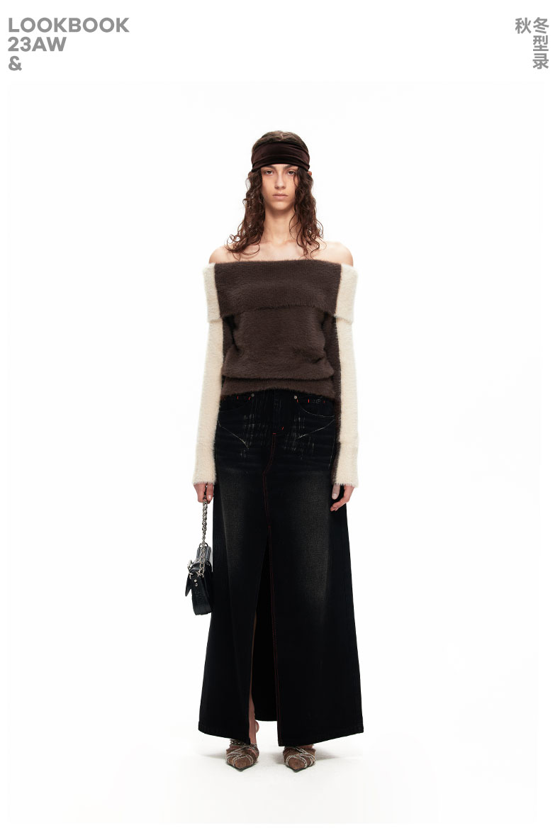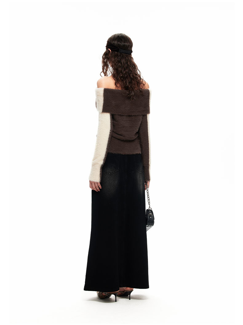 NUTH“盒子”|撞色仿貂毛露肩拼色慵懒一字肩毛衣女上衣美拉德