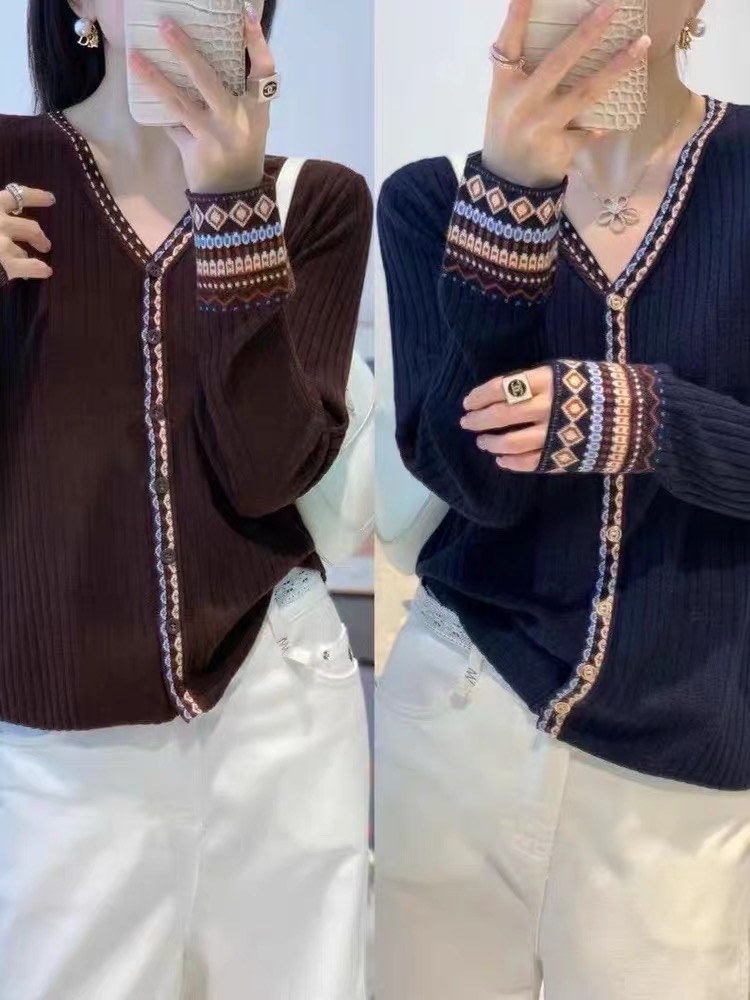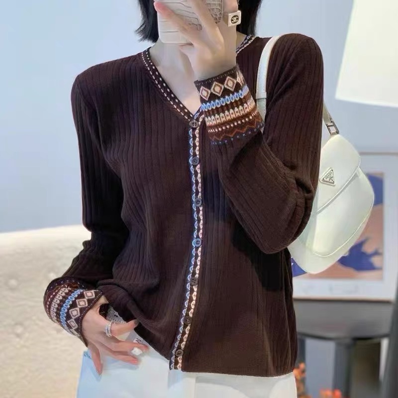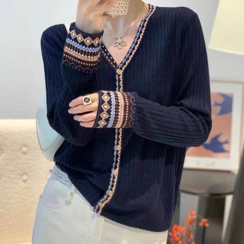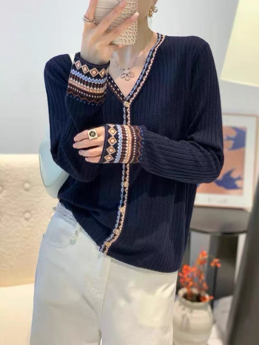 费尔岛提花~民族风v领拼色条纹长袖针织毛衣开衫