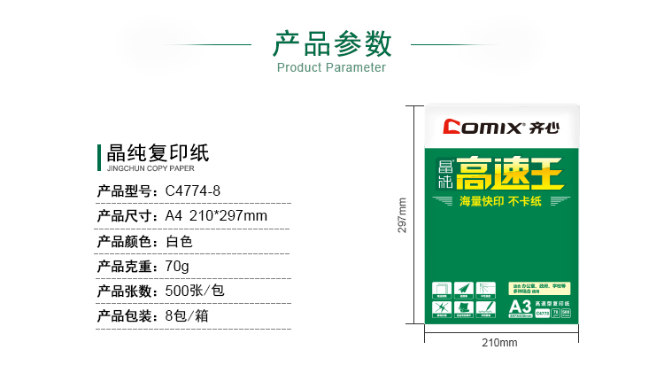 【仅供集采】齐心 C4774-8 晶纯高速王复印纸70克 A4 8包 白