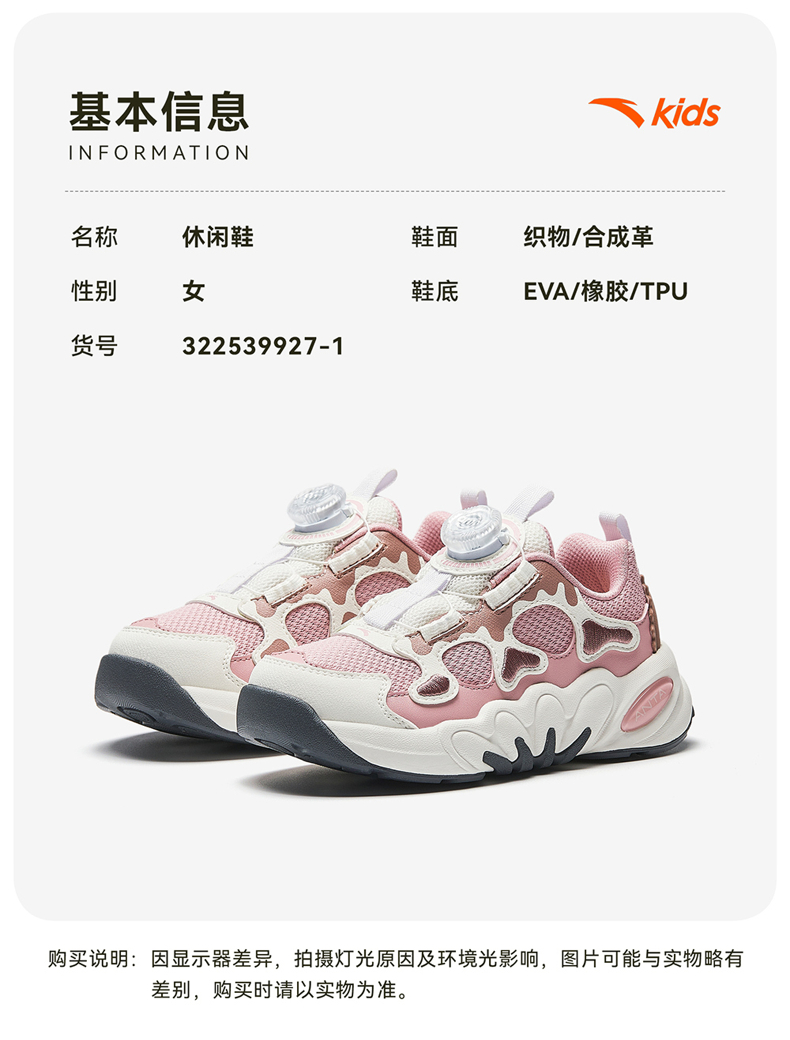 安踏儿童女小童休闲鞋2025秋季新款舒适防滑耐磨儿童旋钮运动童鞋322539927