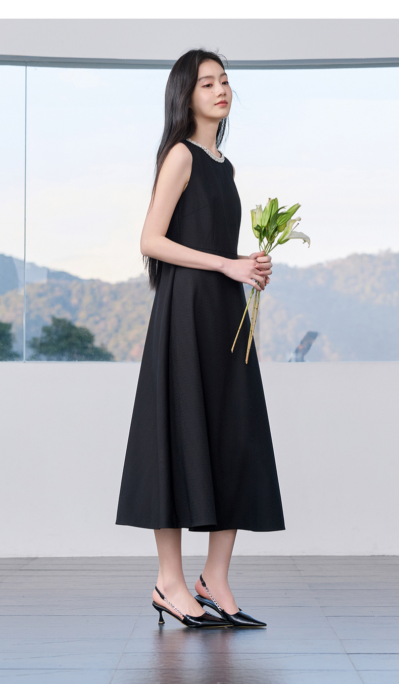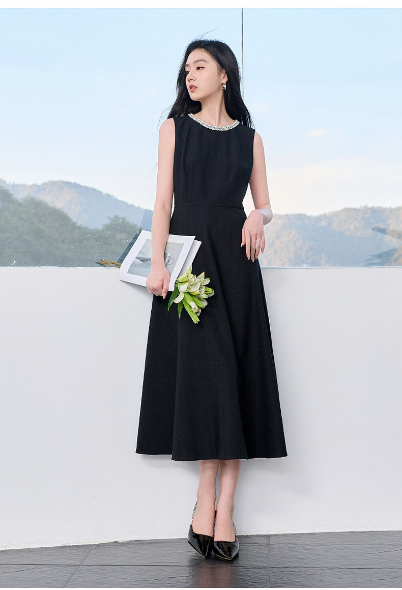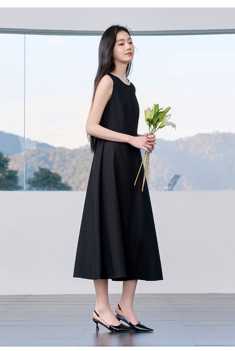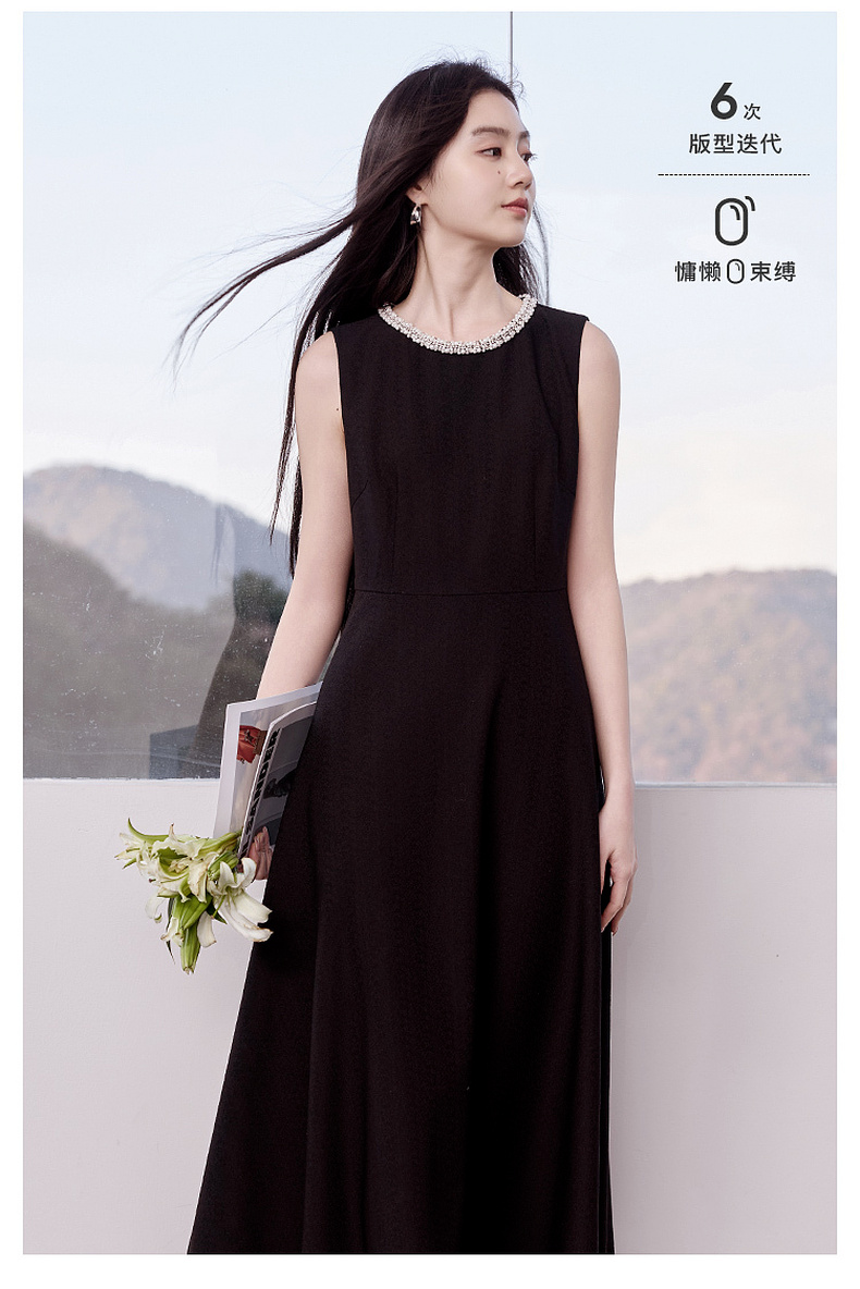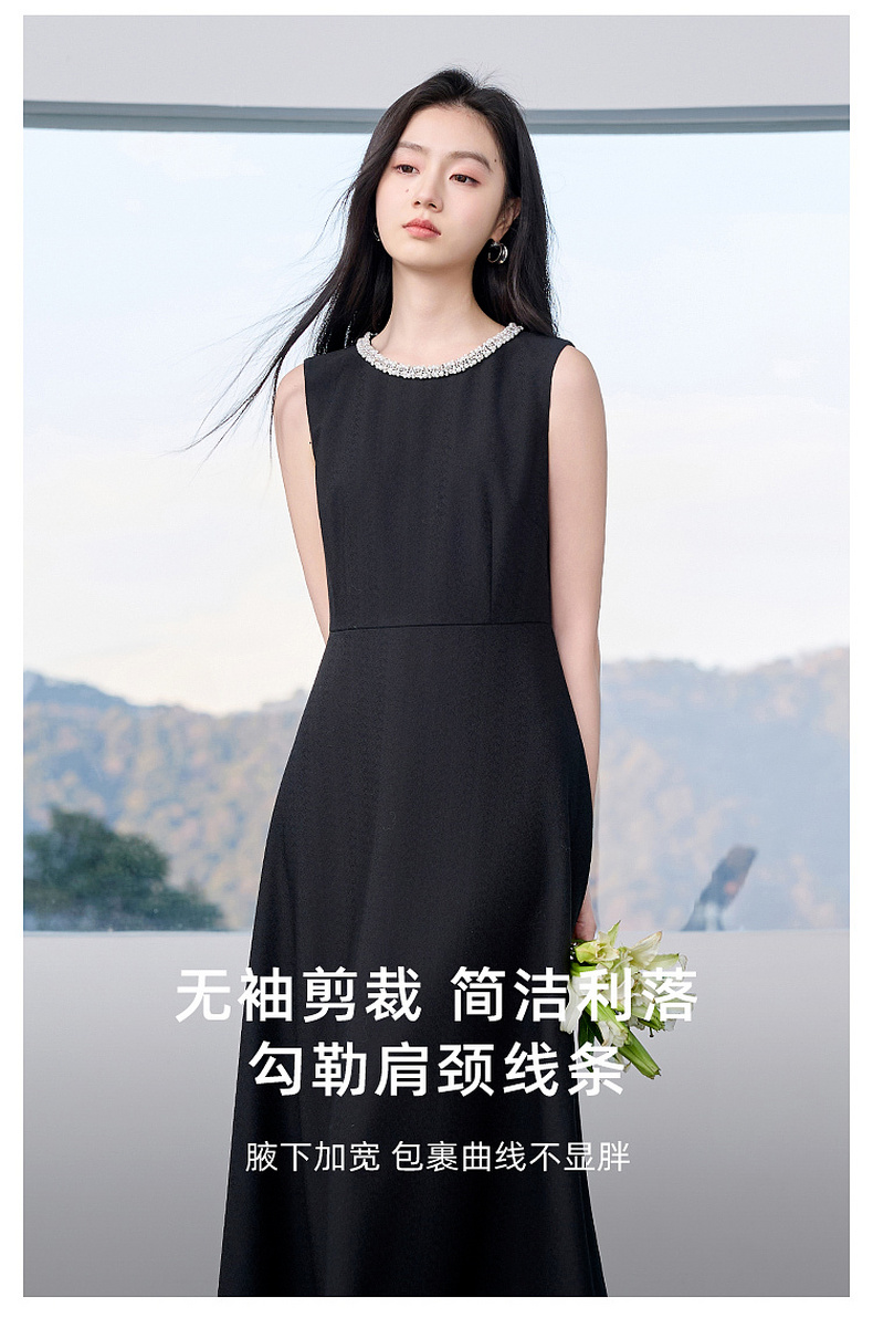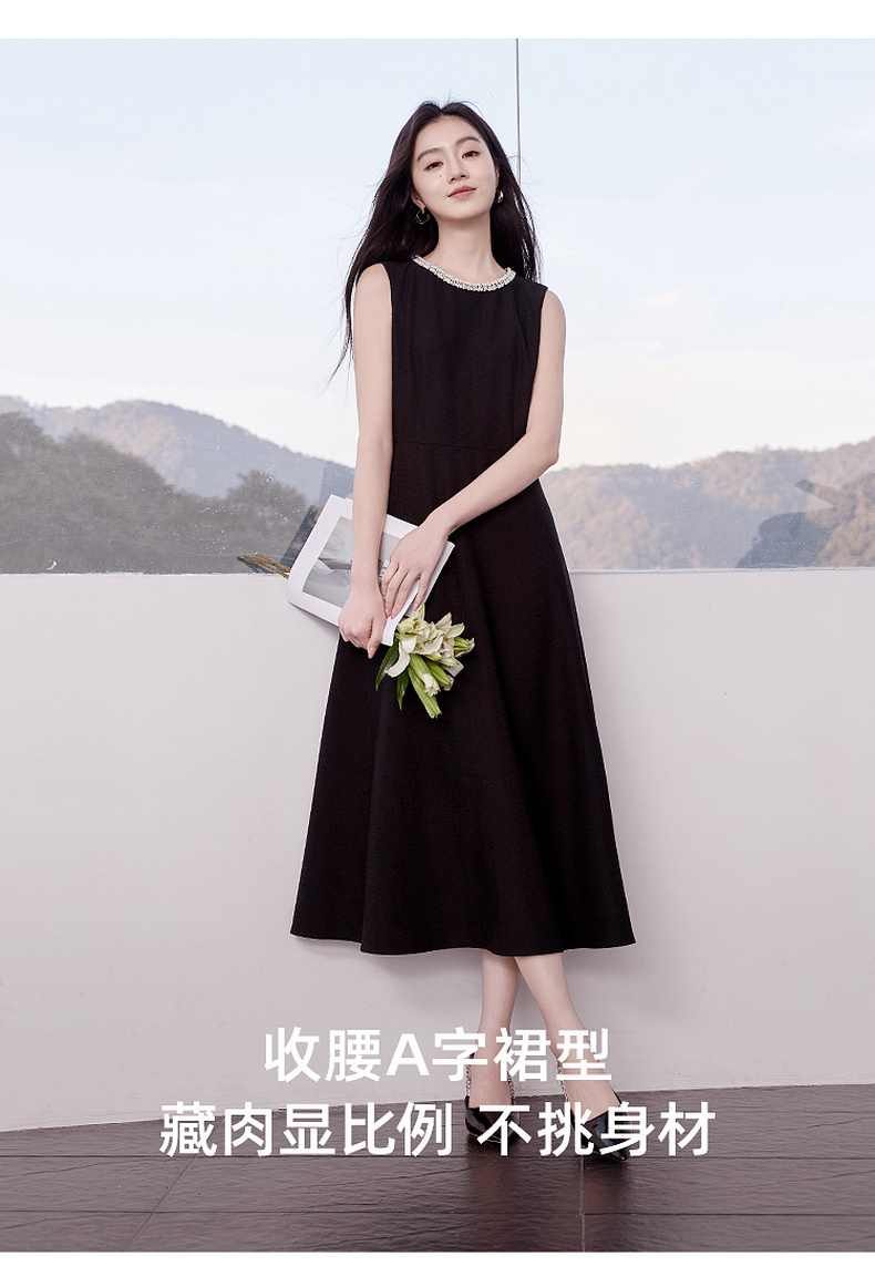 三彩2026春季新款圆领无袖收腰连衣裙A字裙大摆长裙背心裙简约M