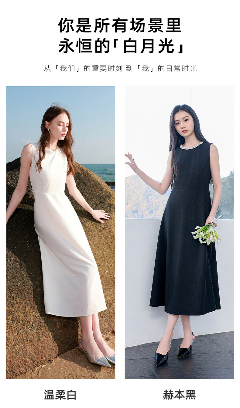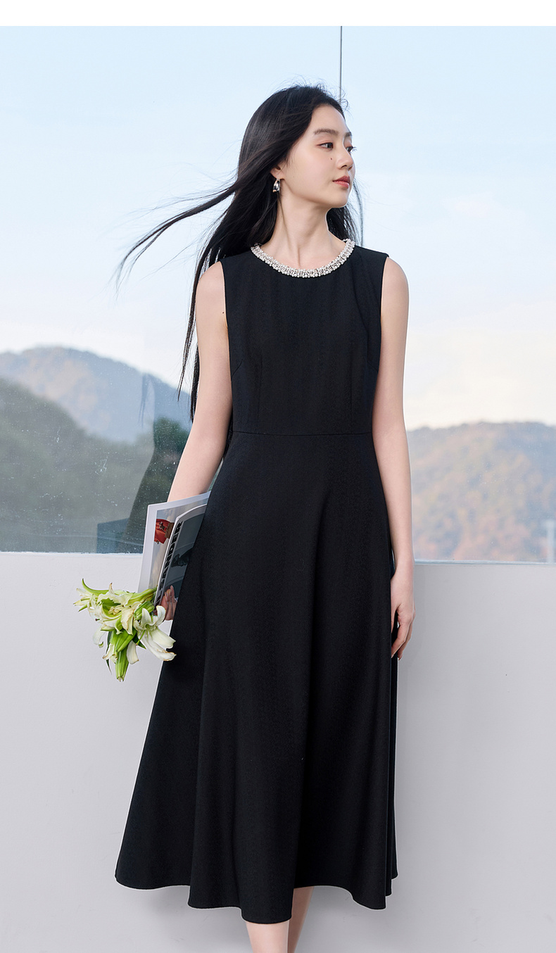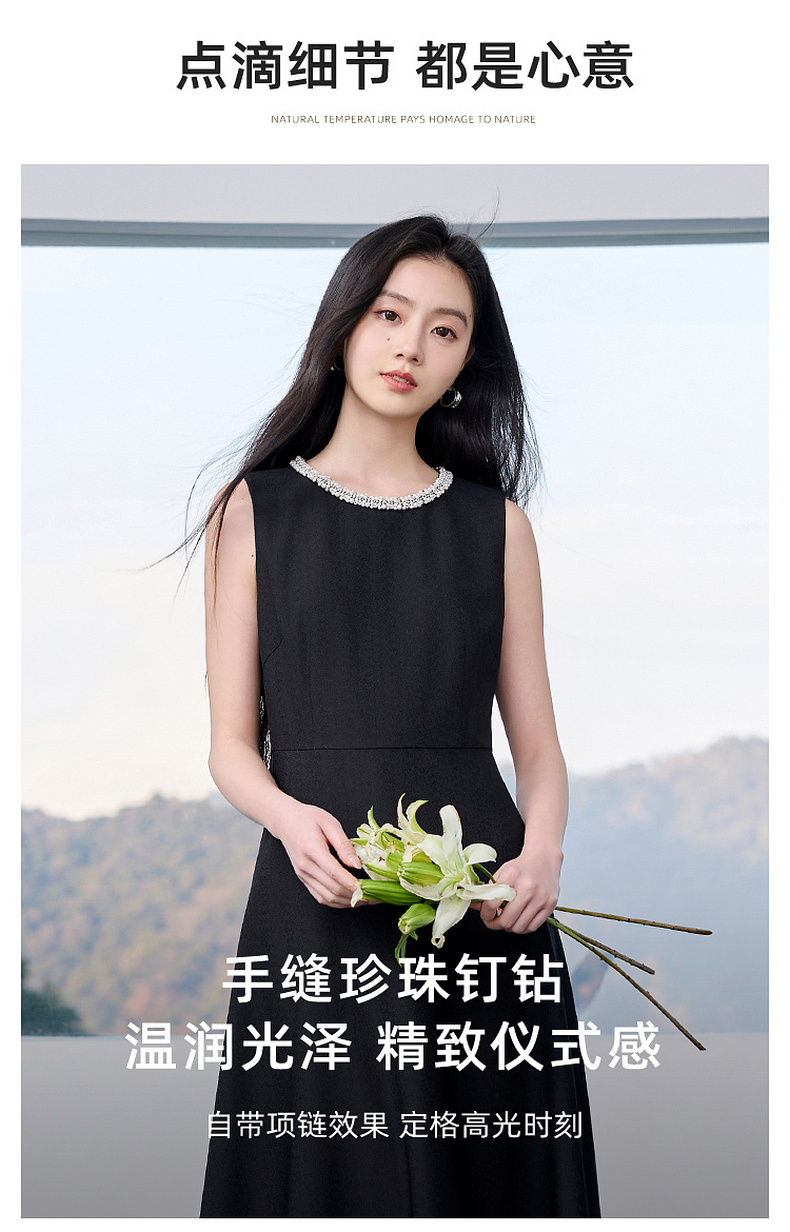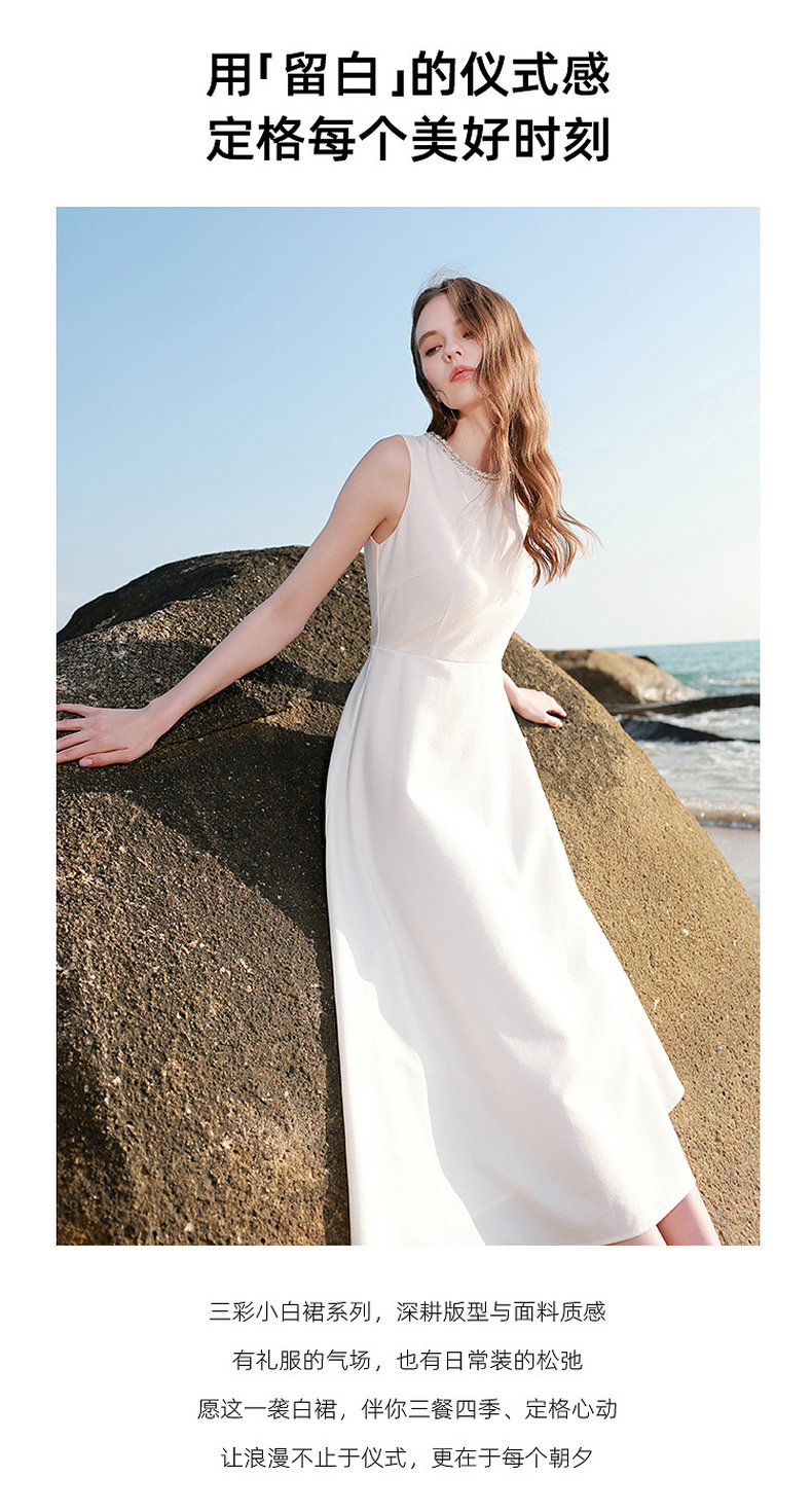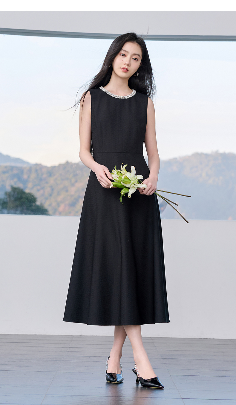 三彩2026春季新款圆领无袖收腰连衣裙A字裙大摆长裙背心裙简约M