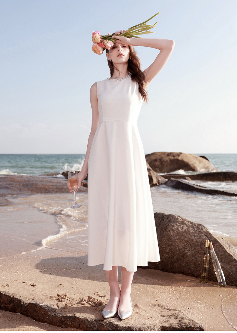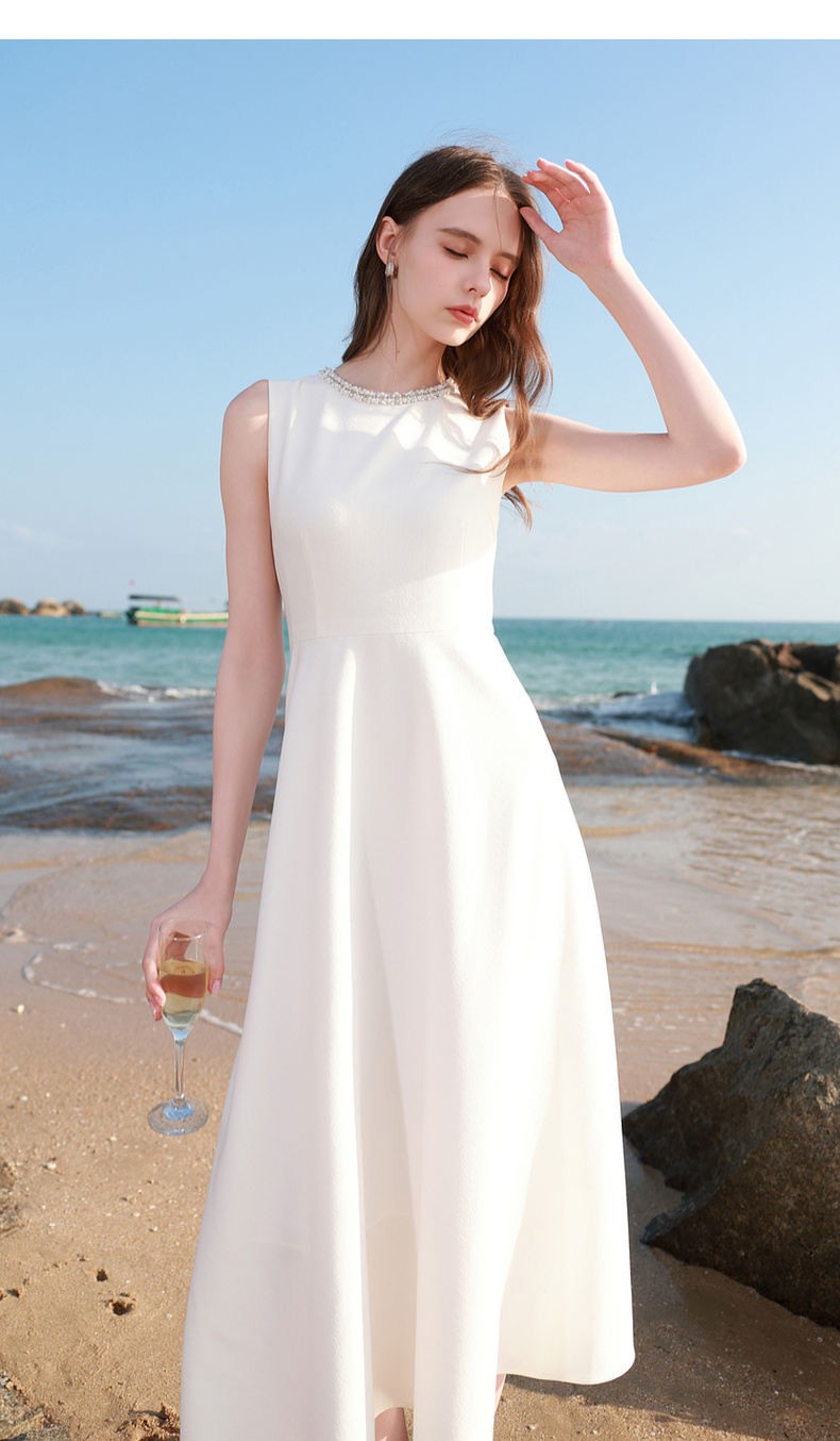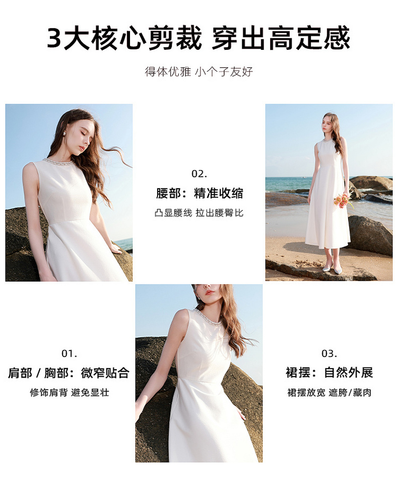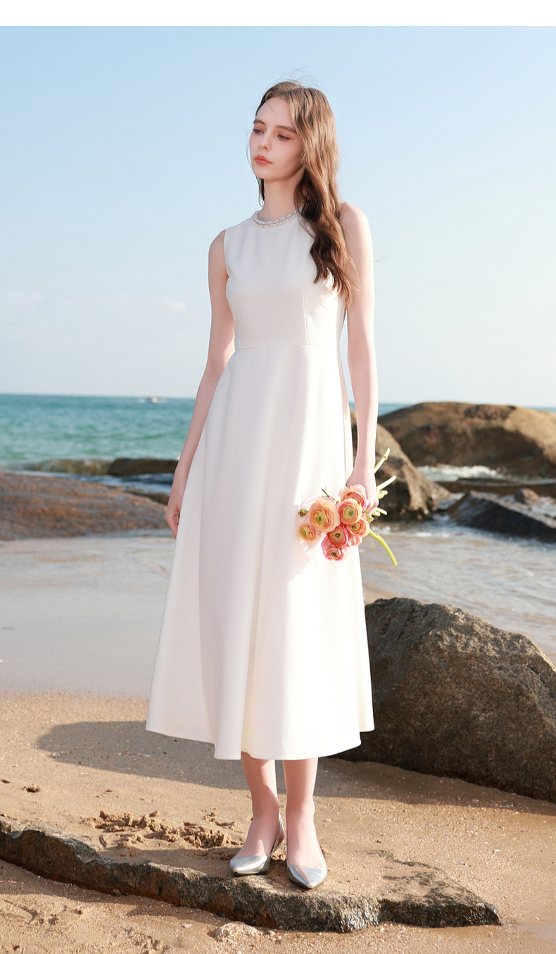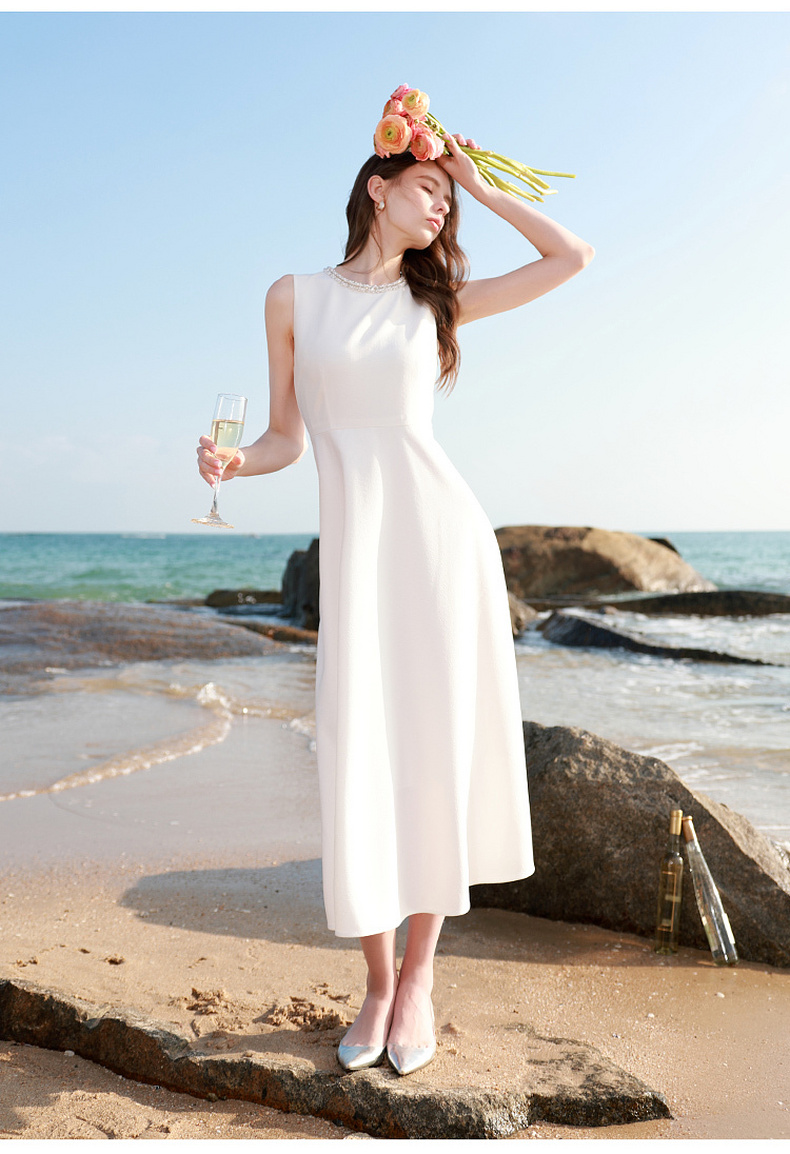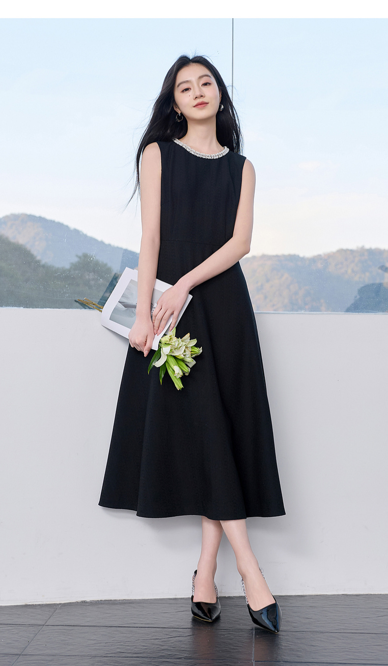 三彩2026春季新款圆领无袖收腰连衣裙A字裙大摆长裙背心裙简约M