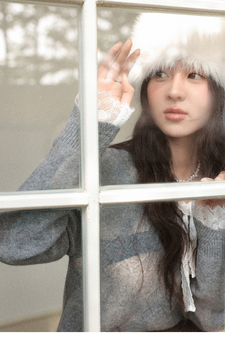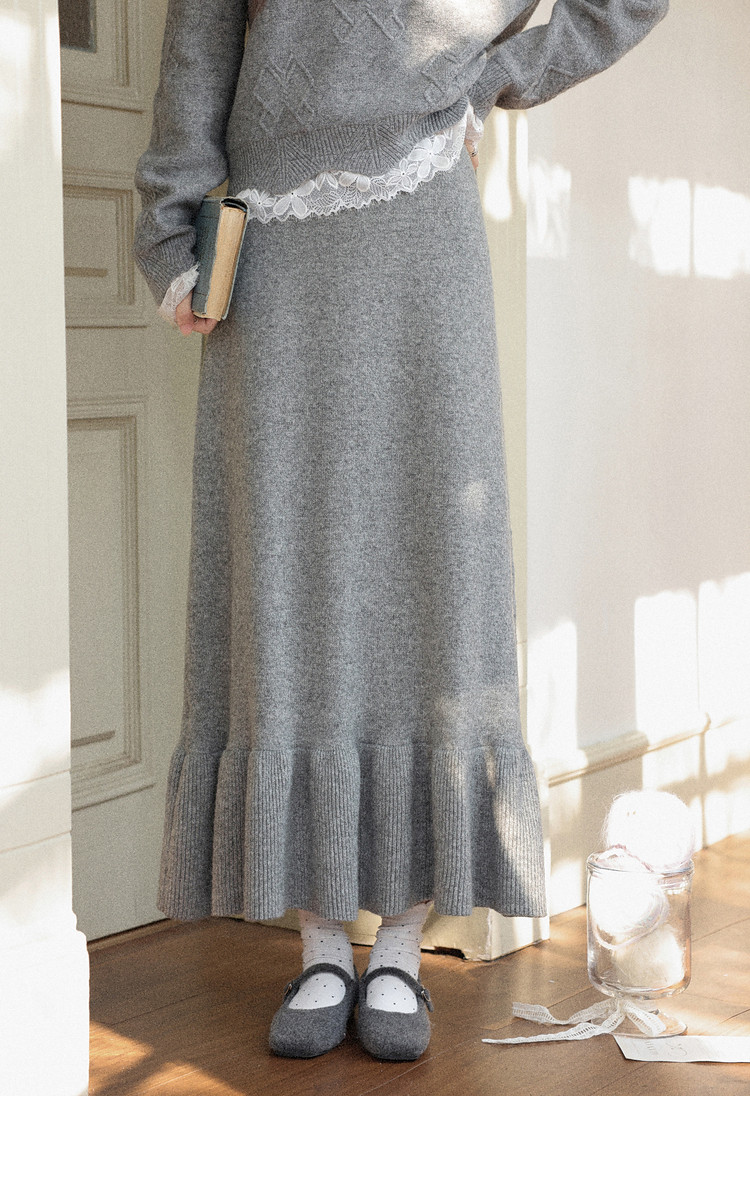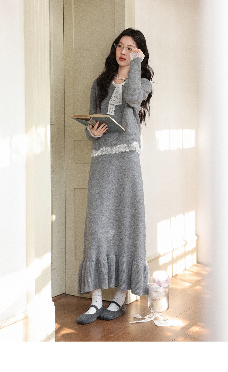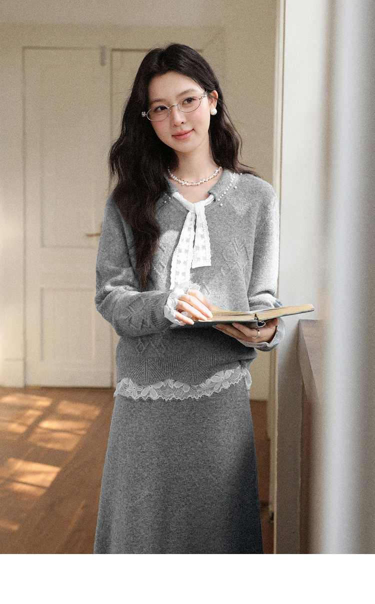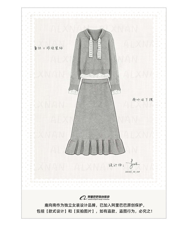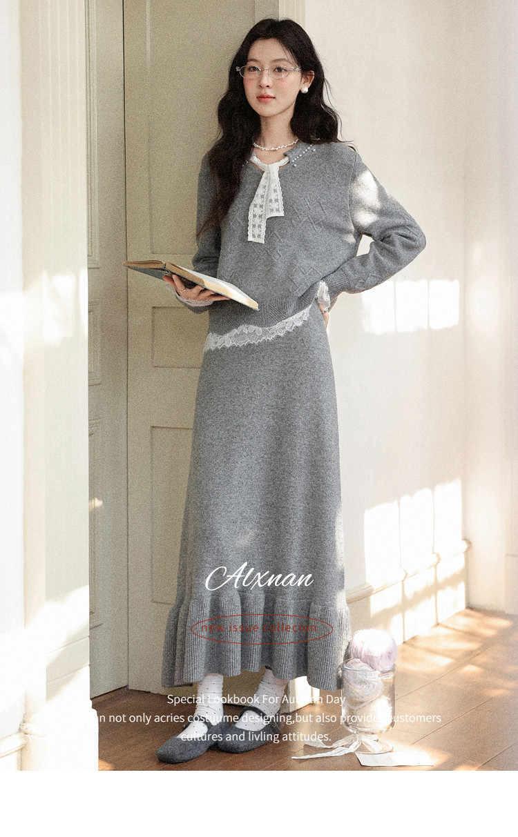 鹿向南「棕意霜柔」灰色设计感长袖毛衣秋冬新款灰色半身裙套装女