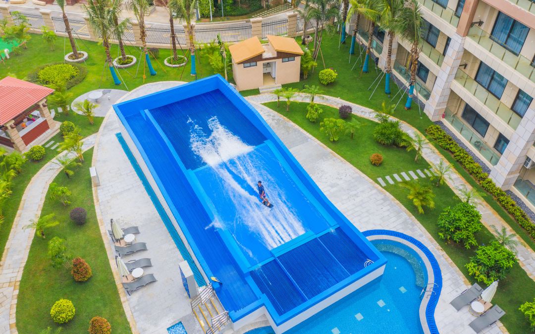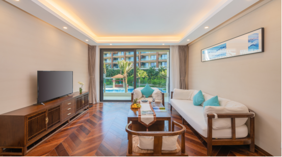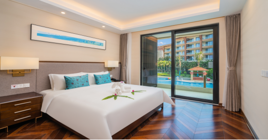 基地共有200间套房,设计风格融合现代简约与传统中式,宽敞舒适的双卧、三卧套房面积从90-122平米不等,所有房间均设有8米超大私人阳台,并可提供管家服务及私人医疗护理服务,满足各类型客人多样化需求。酒店设有各种特色套房:高级花园套房、高级花园双卧套房、豪华花园双卧套房、豪华花园亲子套房、高级泳池套房、高级泳池双卧套房、豪华泳池双卧套房等满足全家出行需求。